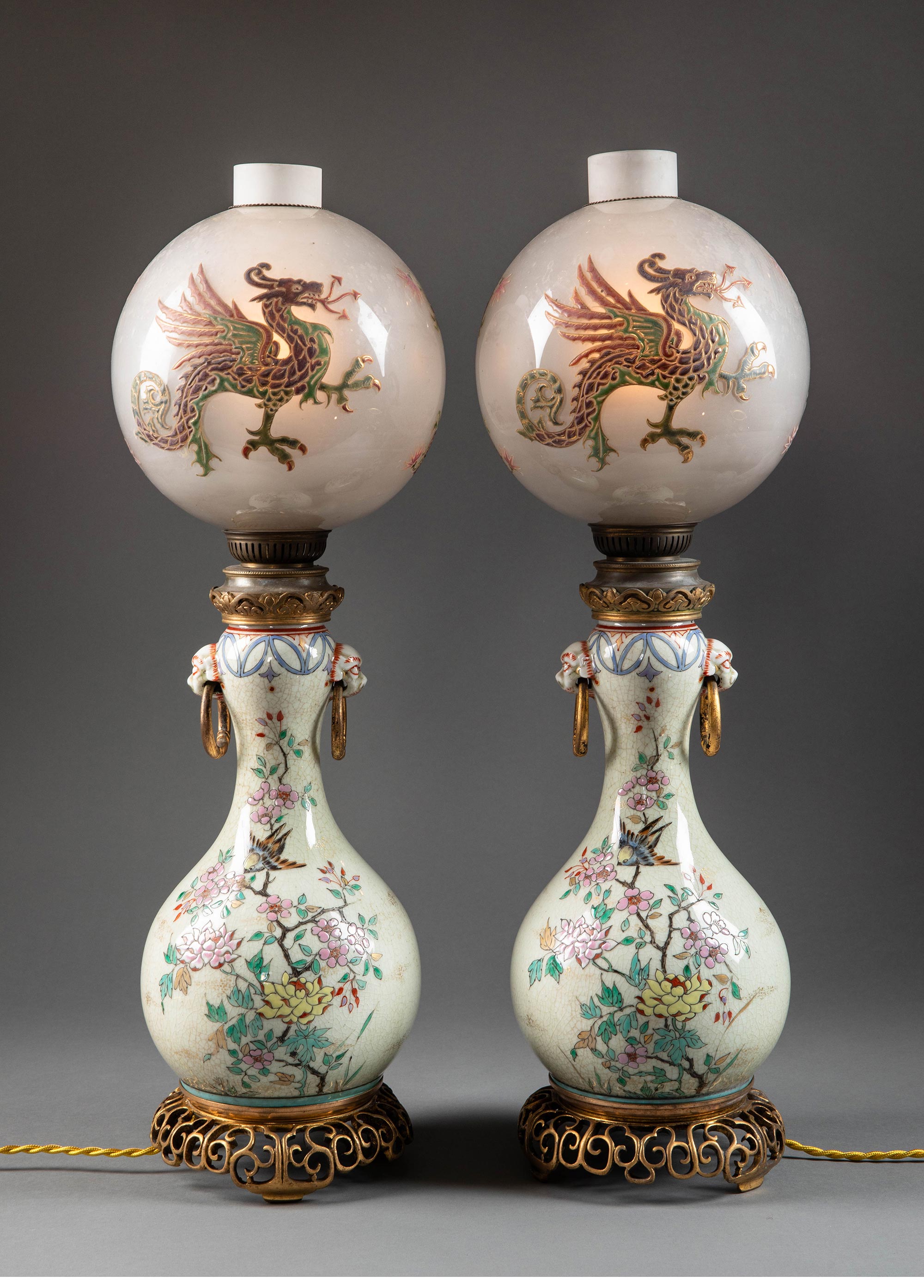 1870年代法国出品东方风格铜鎏金精雕底座嵌龙纹珐琅彩绘水晶灯罩装饰「喜上梅梢」主题冰裂纹瓷瓶台灯一对