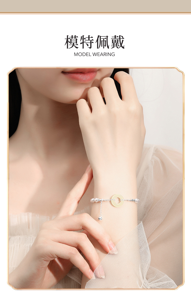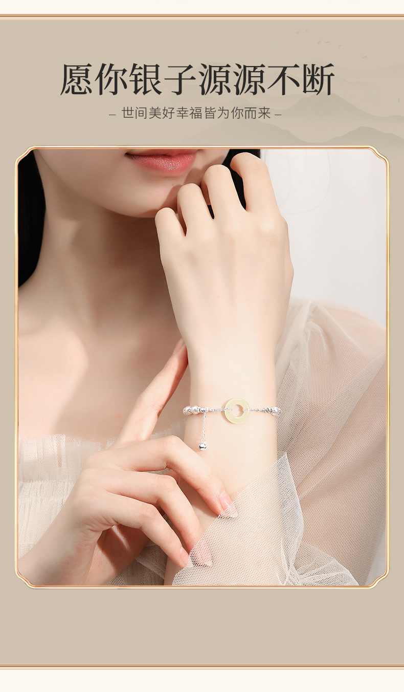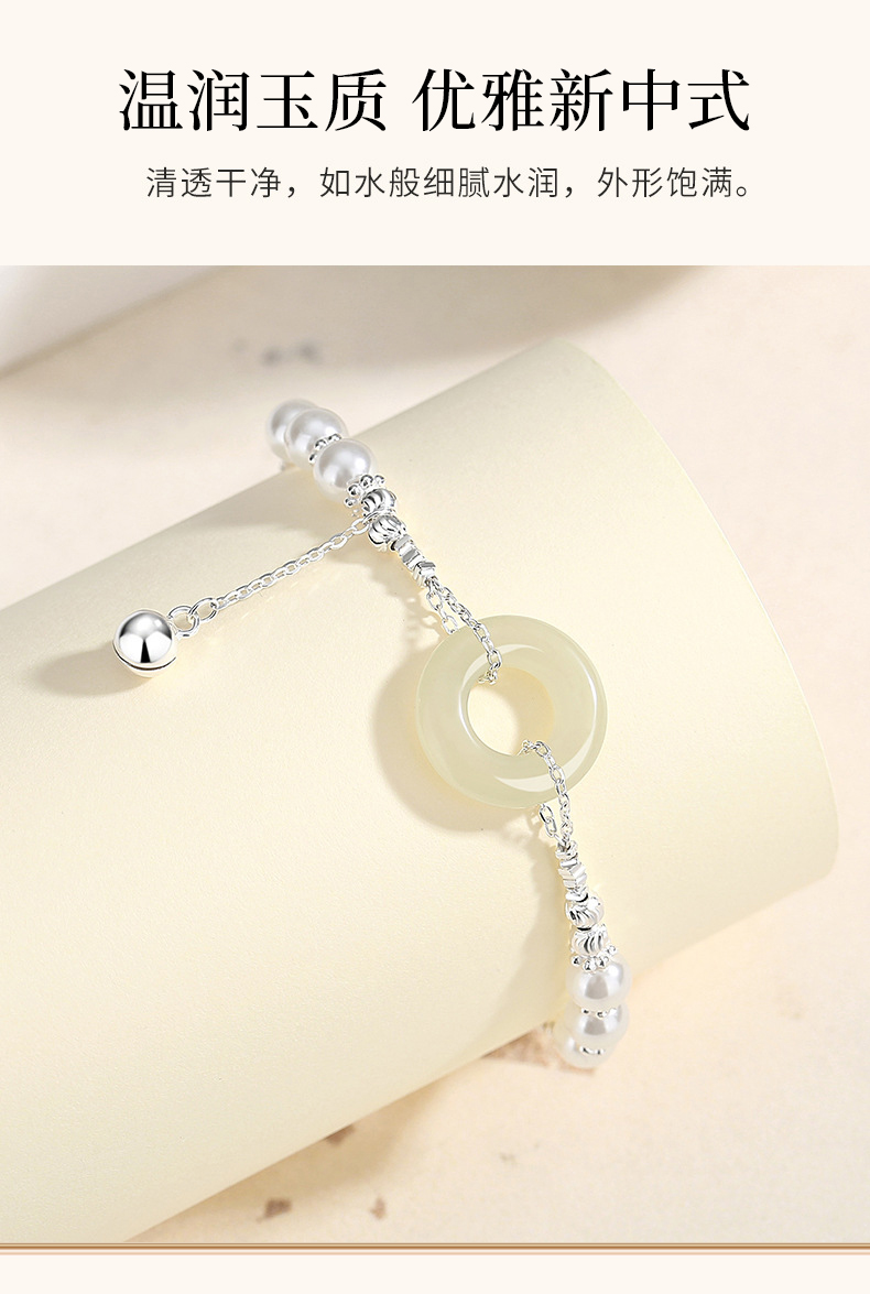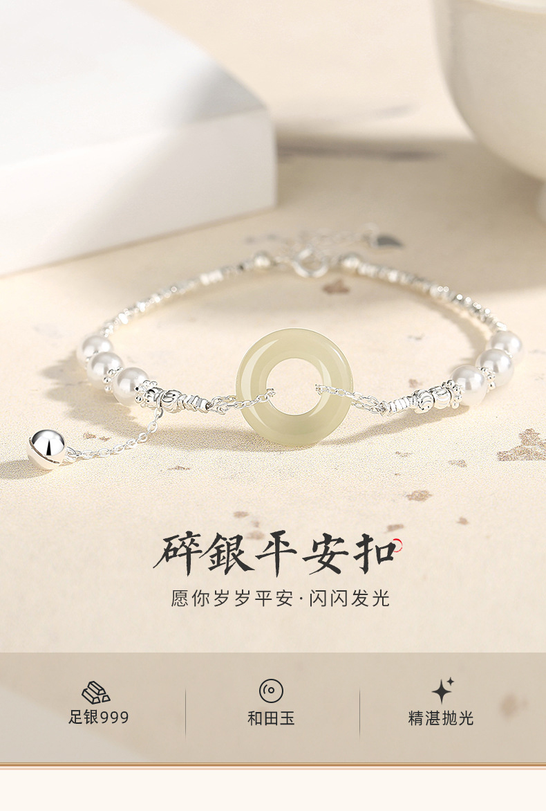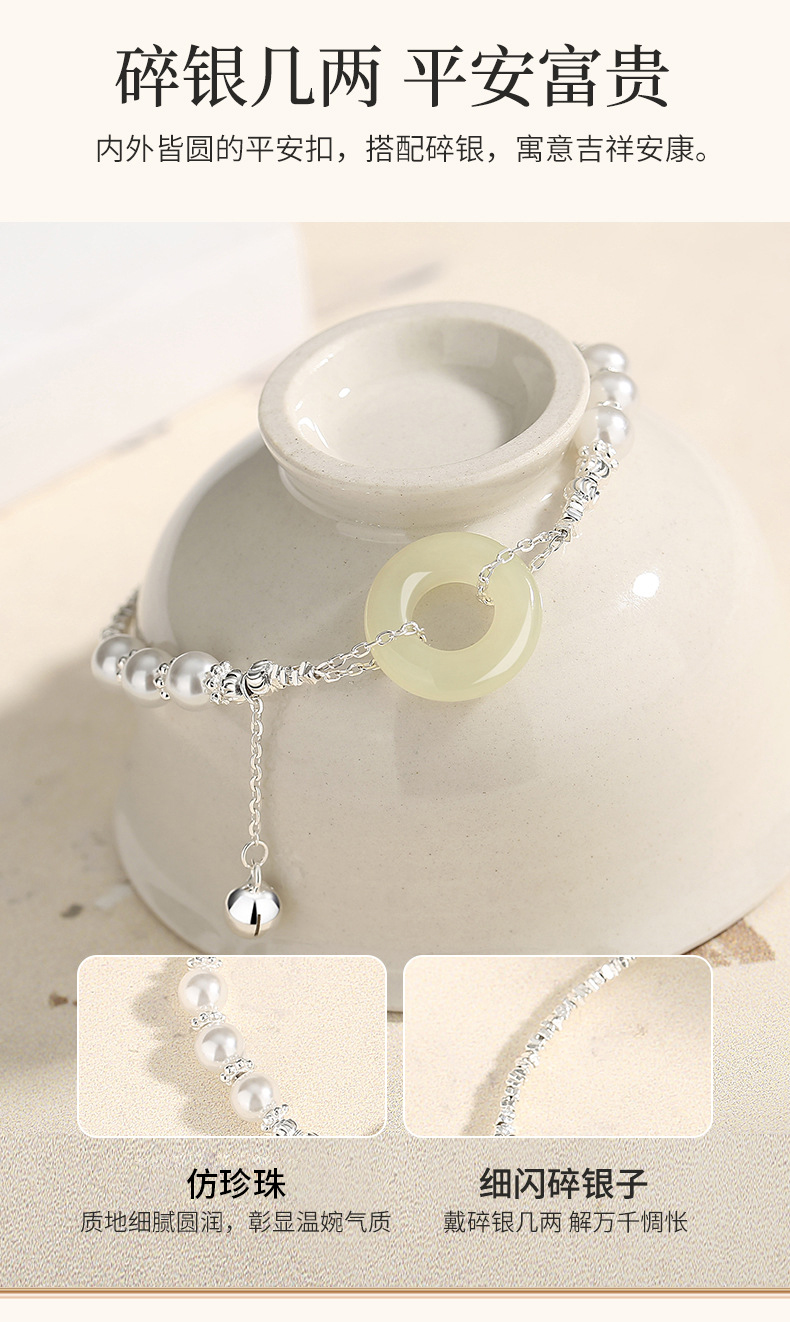 卡蒂罗KADER 碎银平安扣手链 925银新中式碎银几两铃铛流苏一步一响岁岁平安轻奢精致小众简约设计拼接链 青白玉 女款