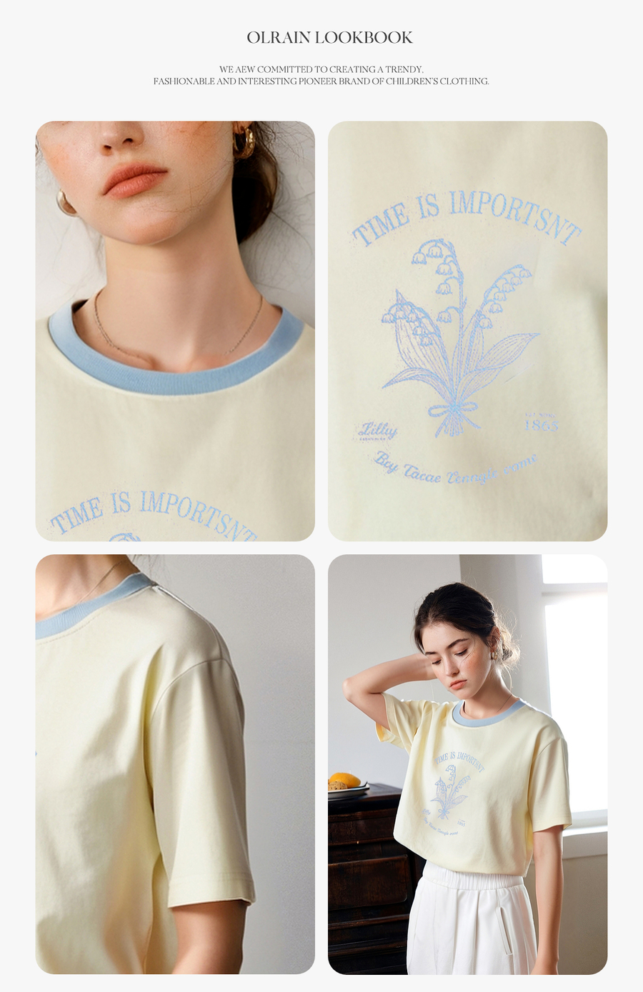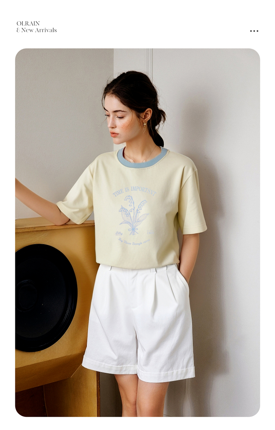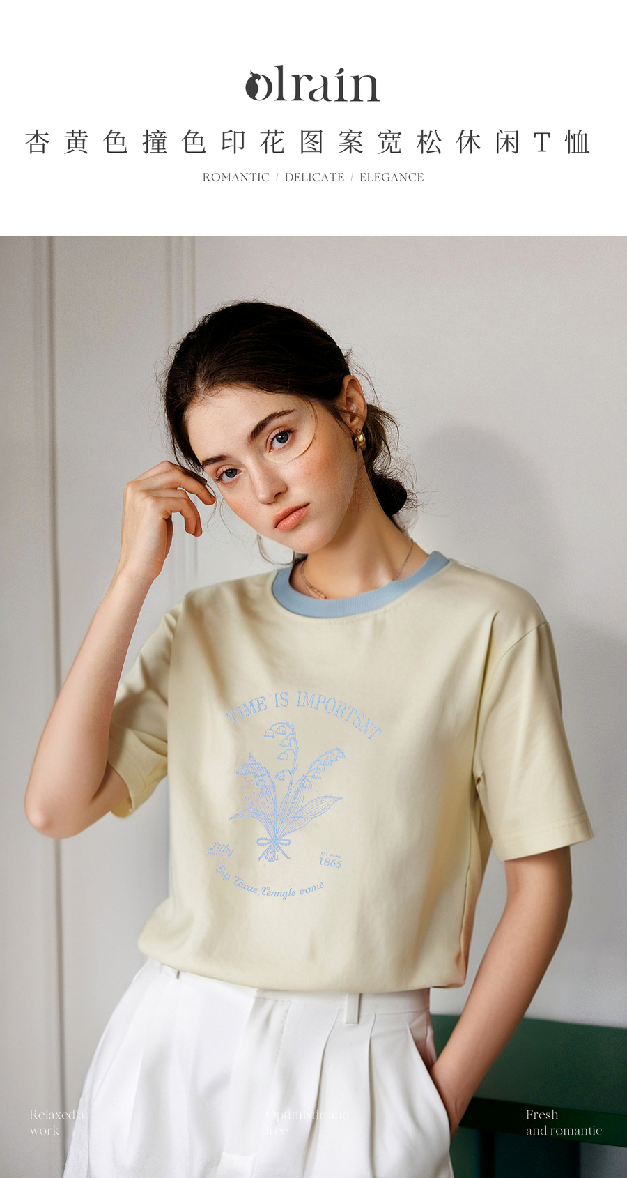 OLrain欧芮儿撞色印花图案宽松休闲T恤女夏季2025年新款短袖上衣