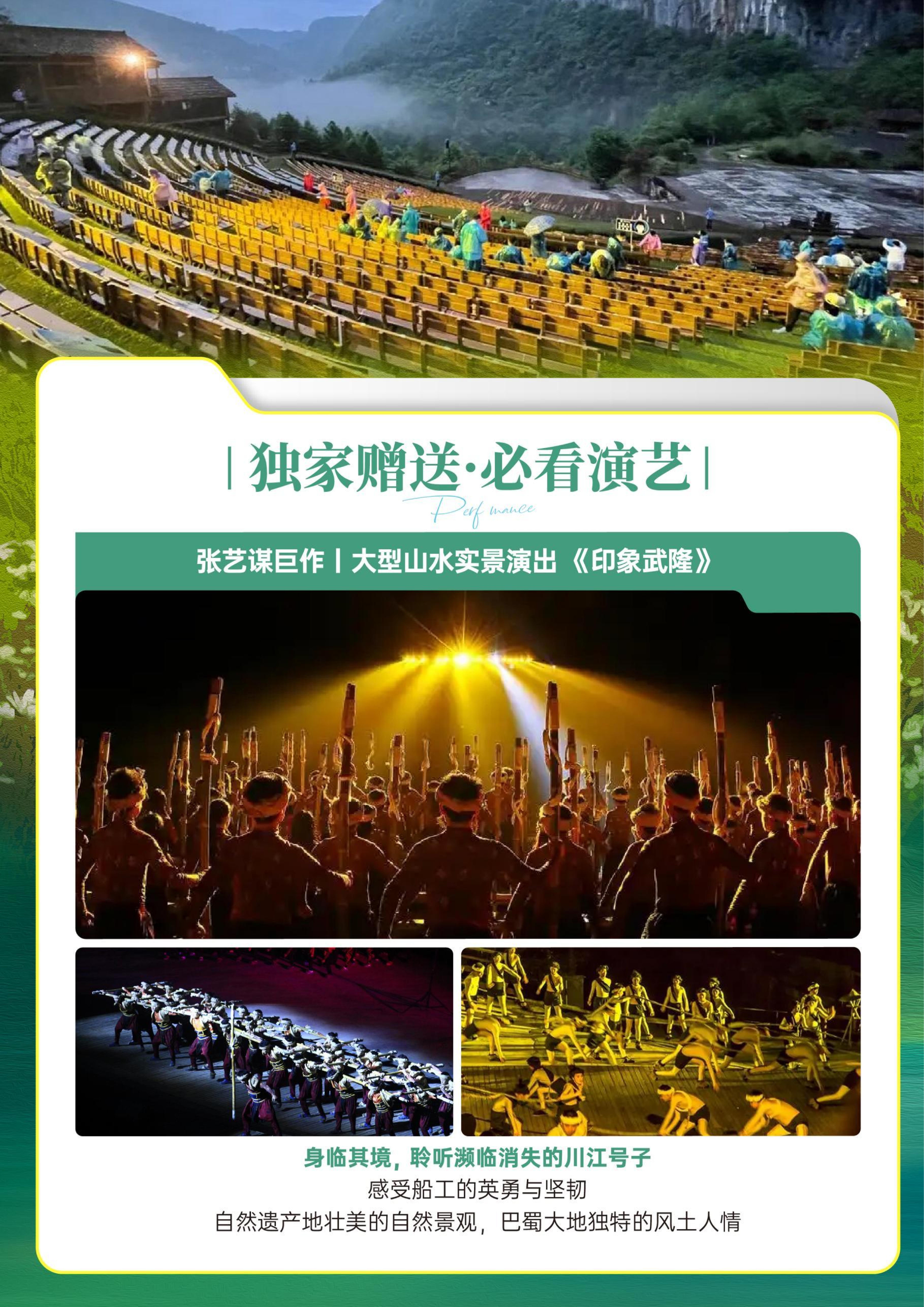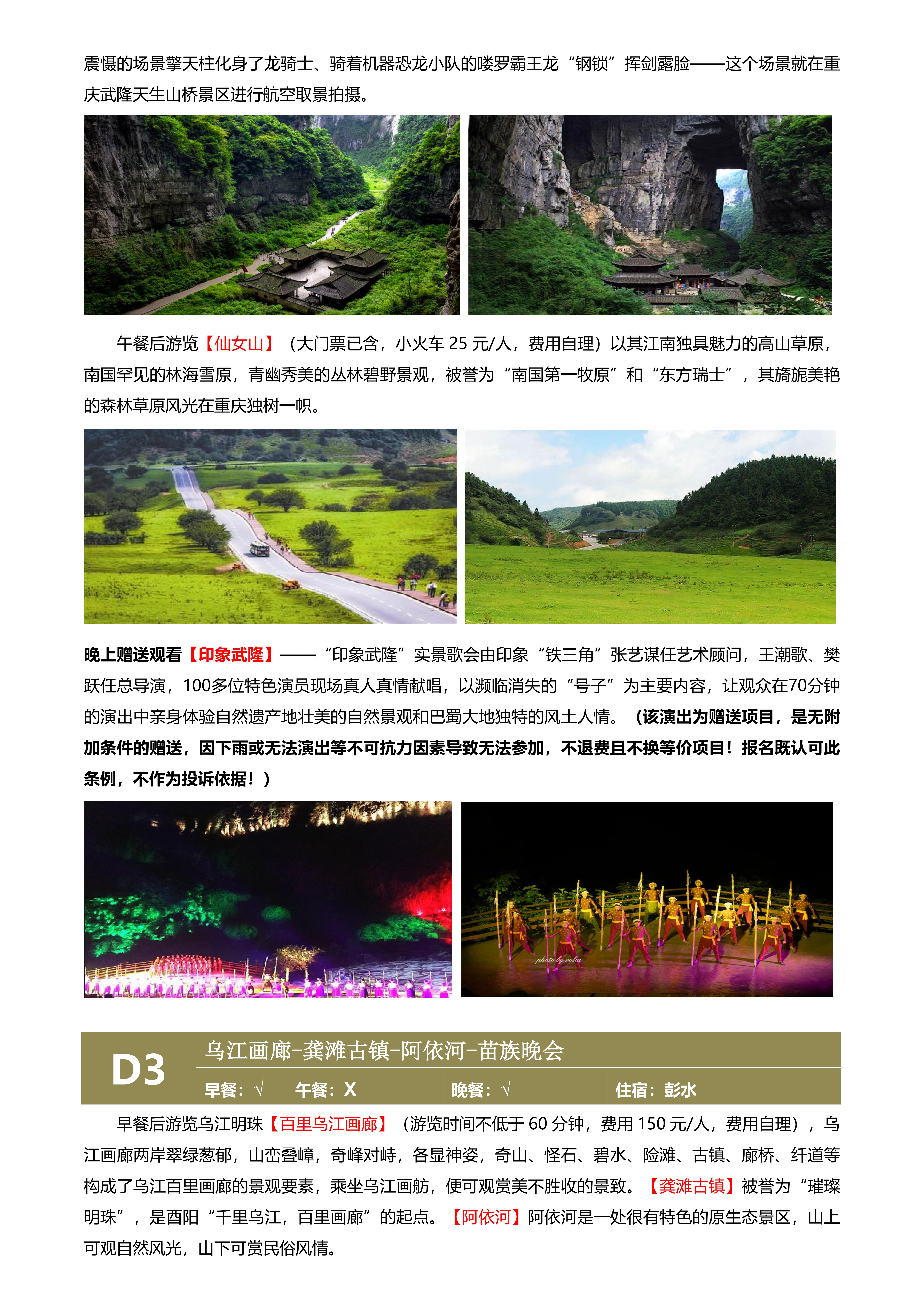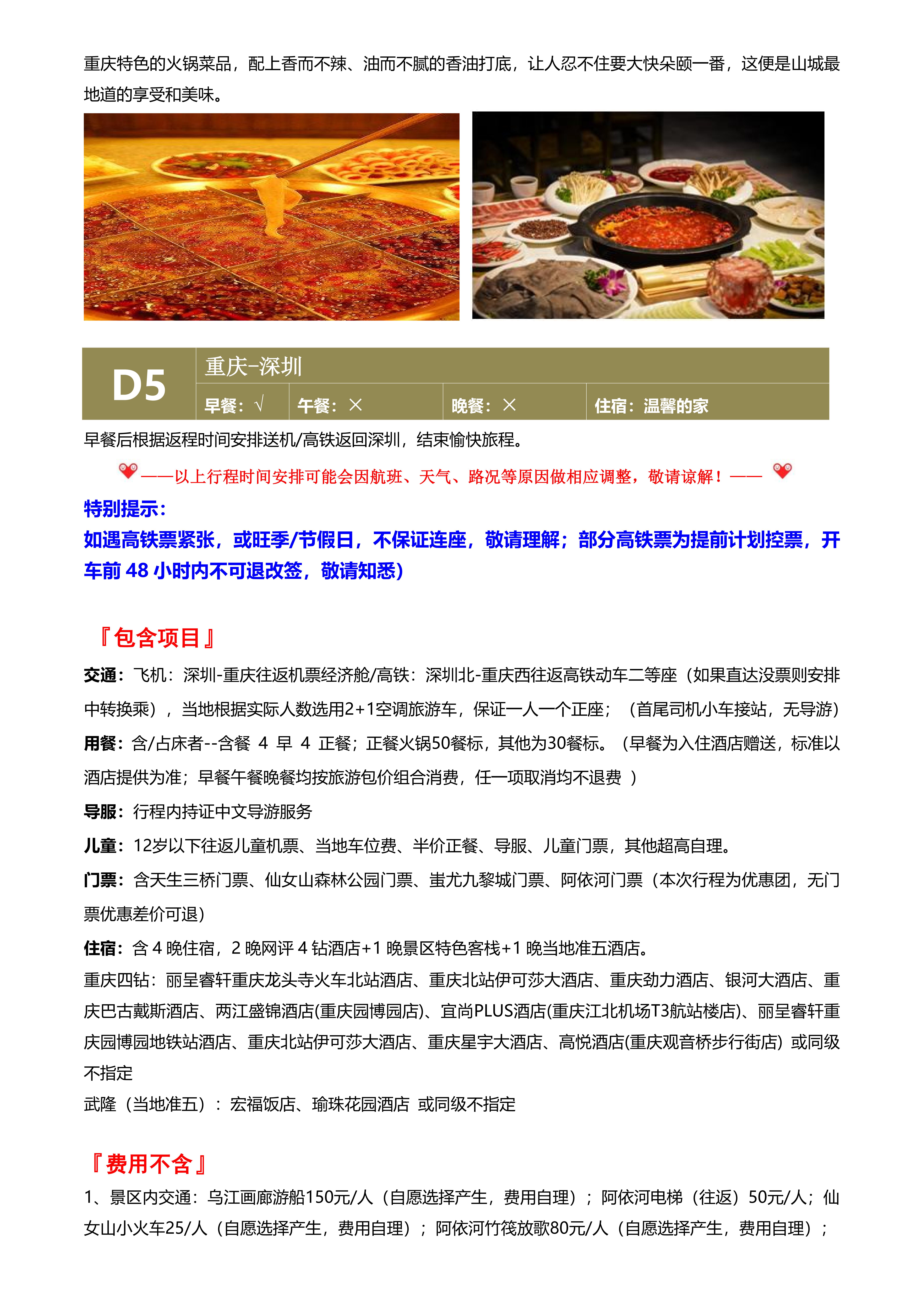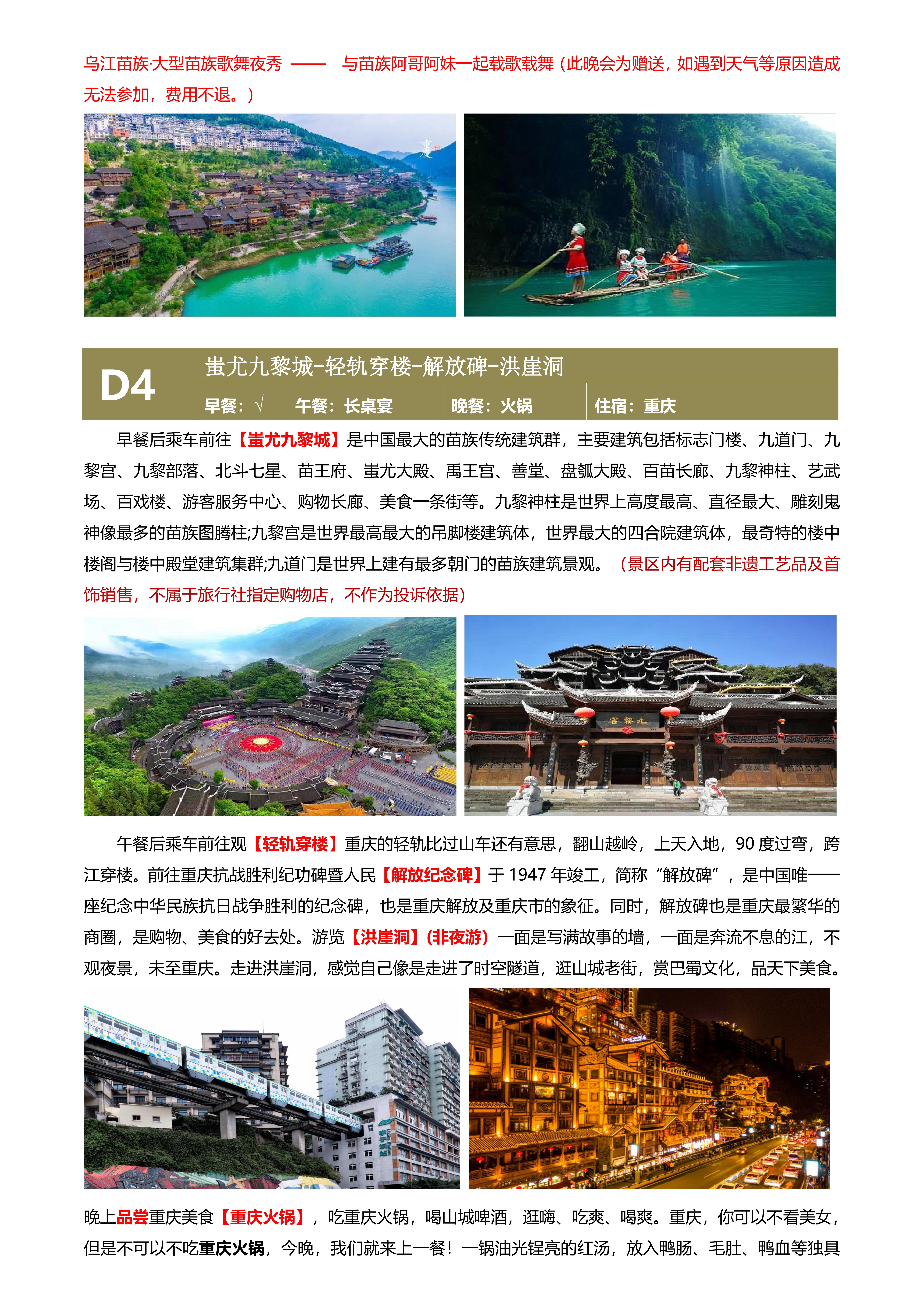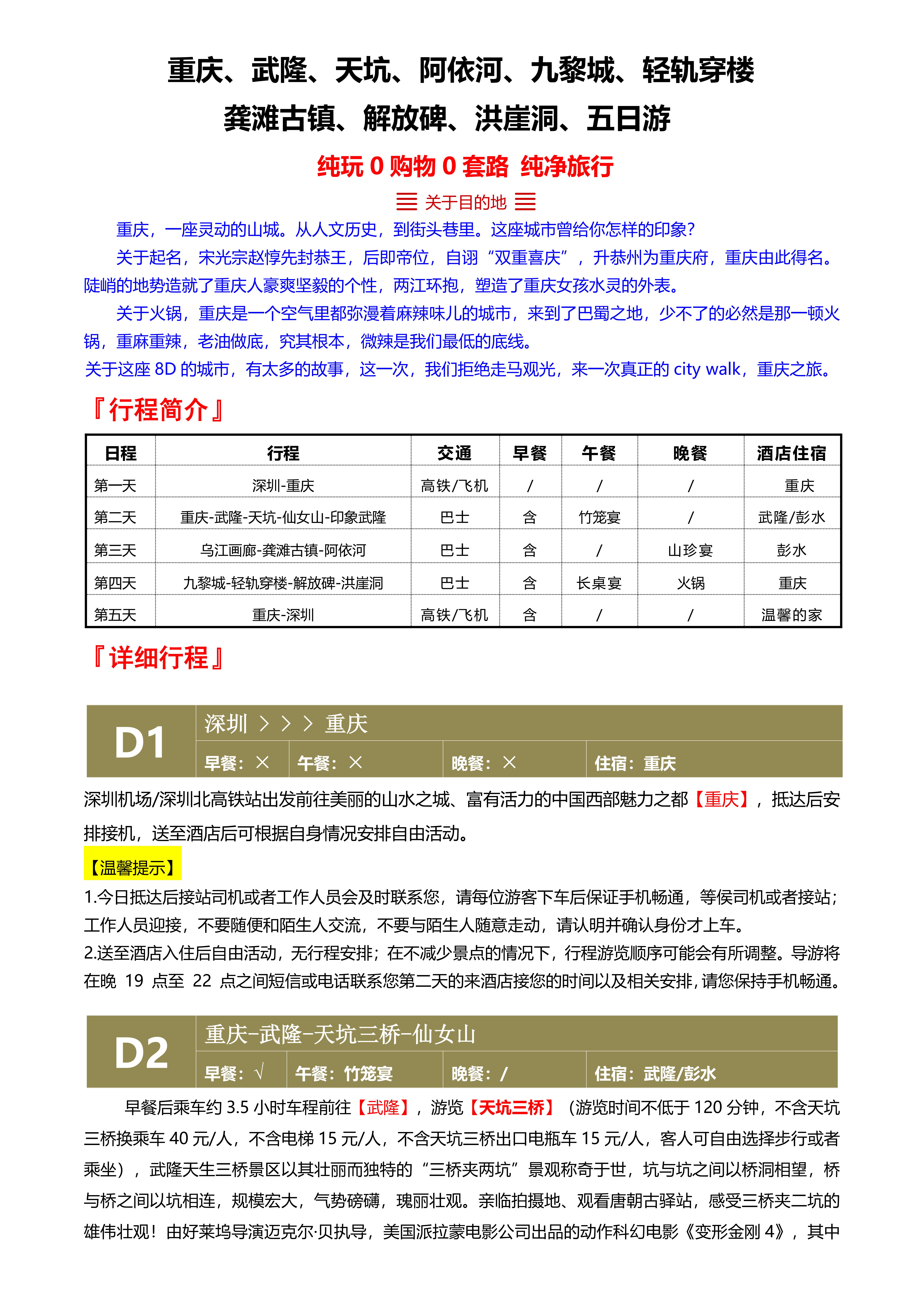 <重庆武隆、天坑、阿依河、九黎城、轻轨穿楼 龚滩古镇、解放碑、洪崖洞5日游>飞机/高铁往返