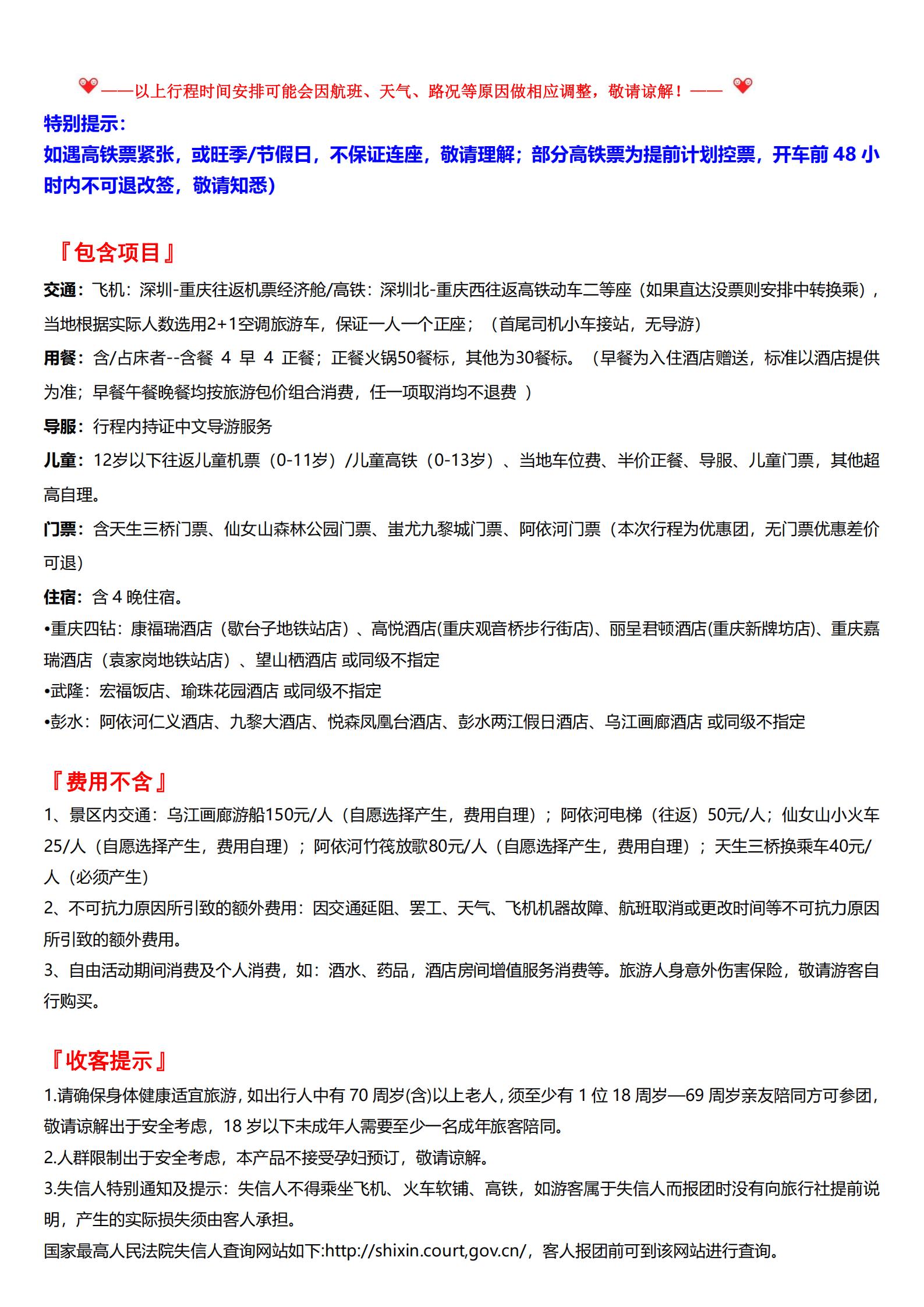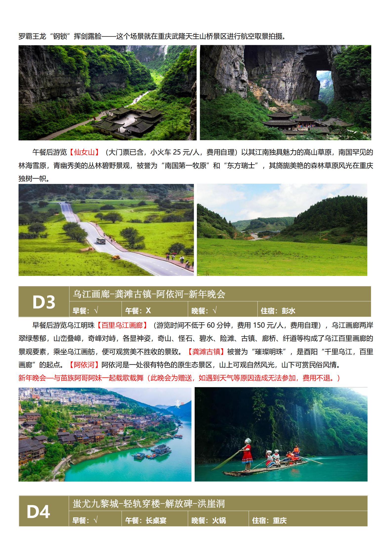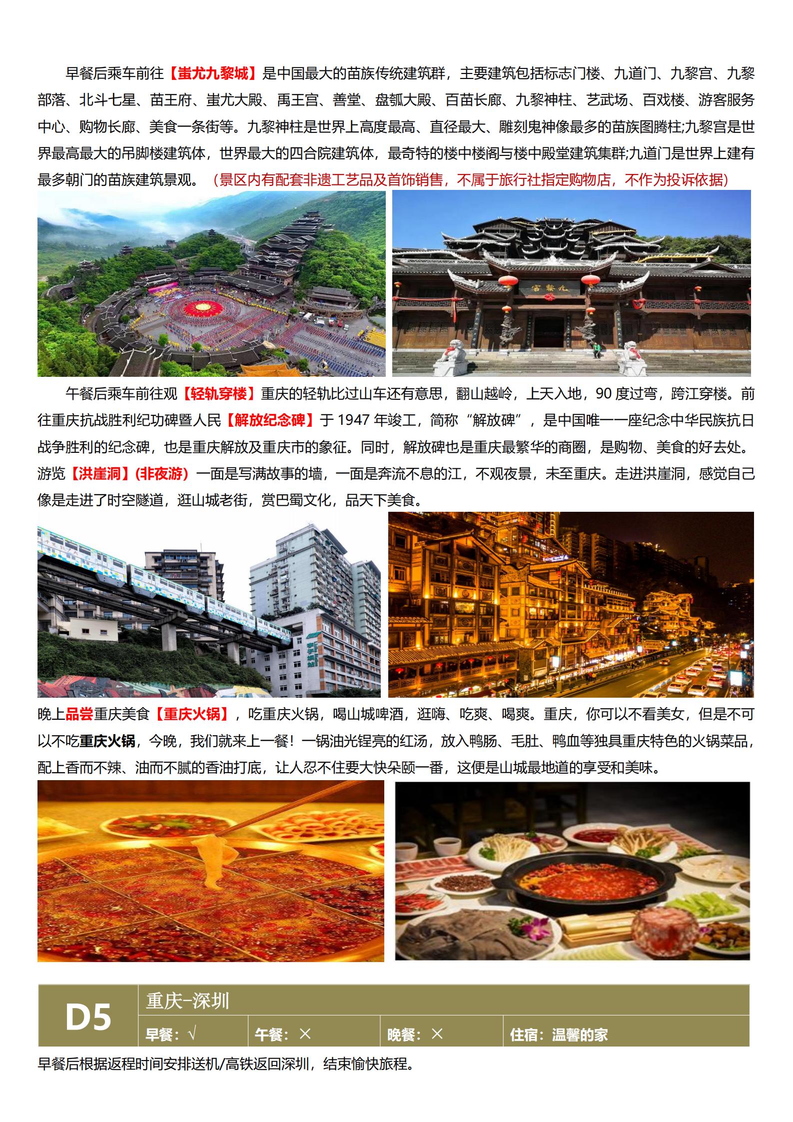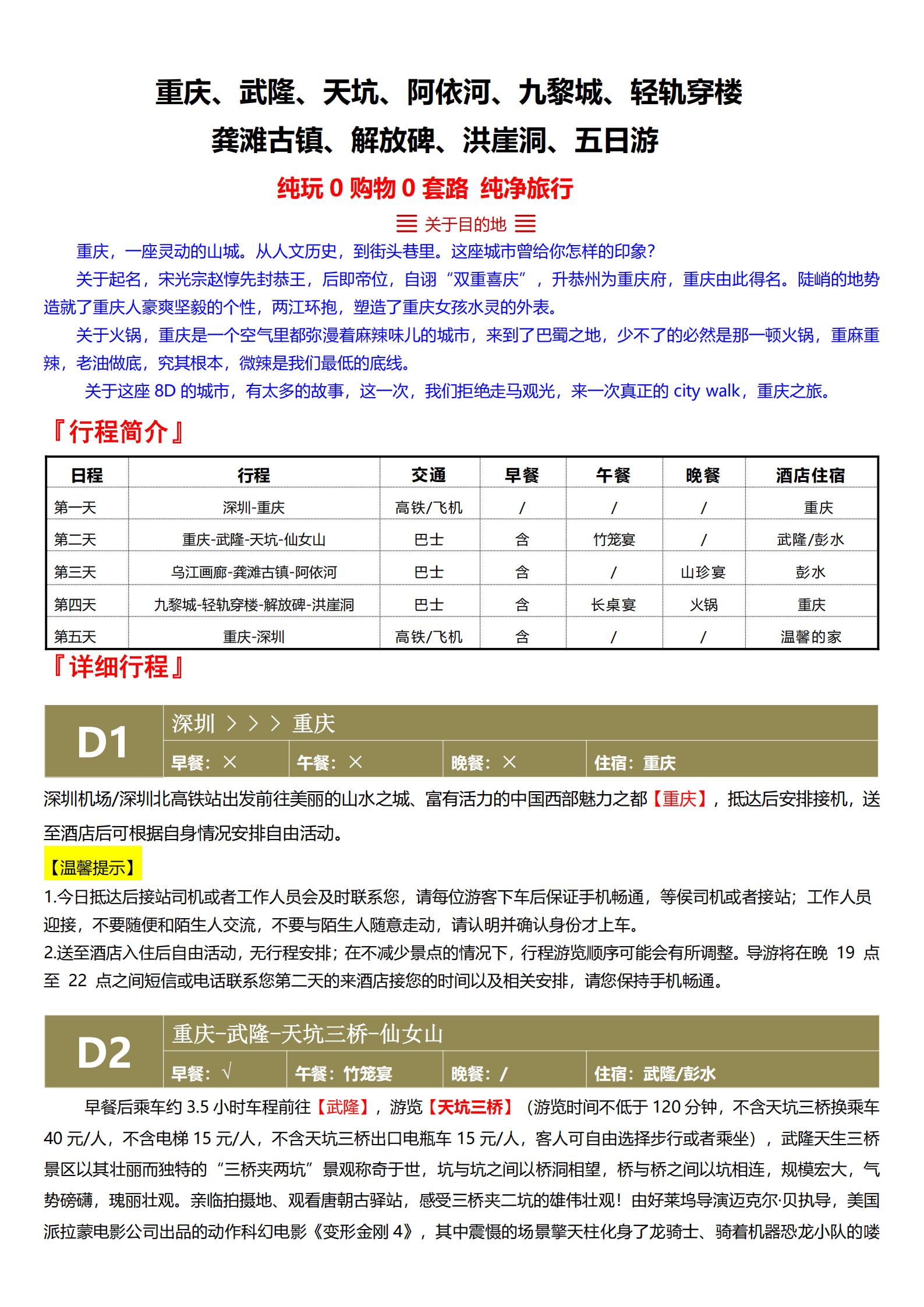 <重庆武隆、天坑、阿依河、九黎城、轻轨穿楼、龚滩古镇、解放碑、洪崖洞5日游>飞机/高铁往返