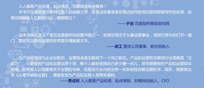 当产品经理成为企业标配后,运营将会是互联网下一个风口职位。产品和运营在互联网行业里是“泛能力”,只要提到产品和运营这两个词,每个人会觉得自己多少懂一点儿,然而想要做好产品和运营却非常难。经常有人让我推荐关于运营的书单,但是在行业内却没有一本系统性讲解运营的书,现在,我推荐这本《从零开始做运营》,感谢张亮为产品和运营人员带来福利。