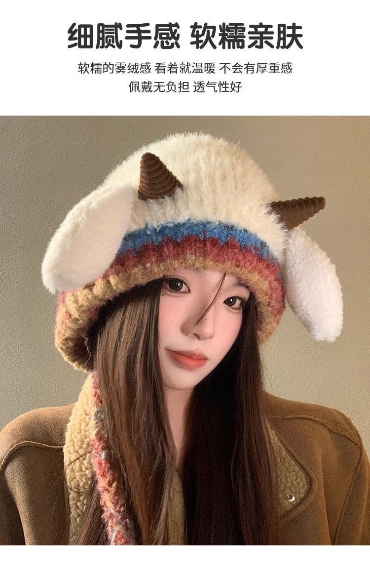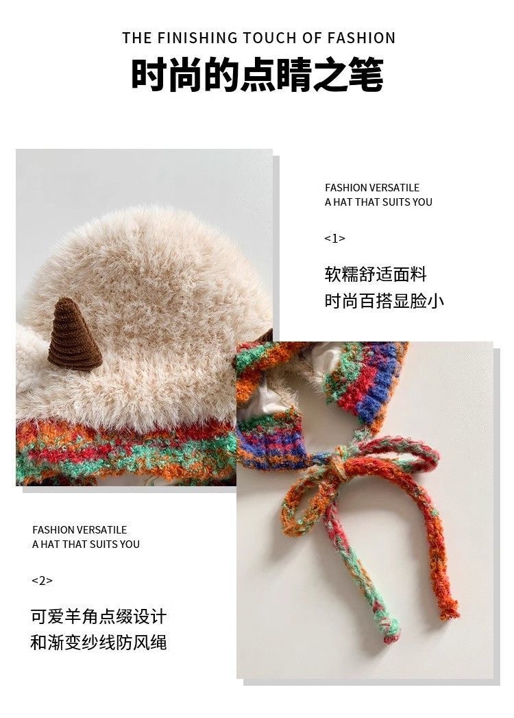【百搭可爱风!全包显脸小】软糯亲肤,帽比脸大,轻松显瘦,韩版可爱小羊毛绒帽子女秋冬季保暖绑带针织护耳帽网红户外套头帽。rc
