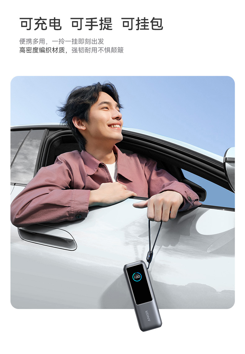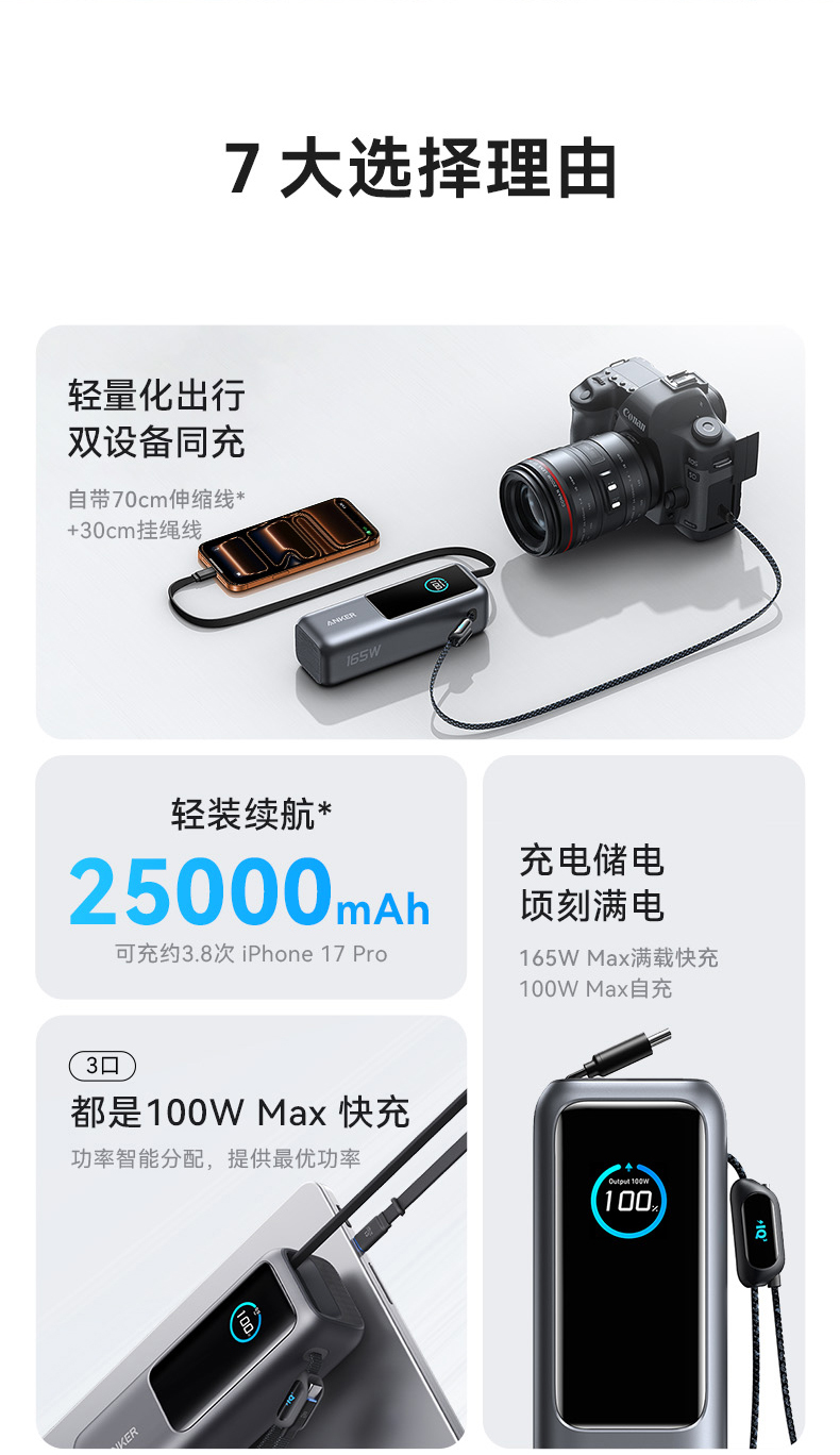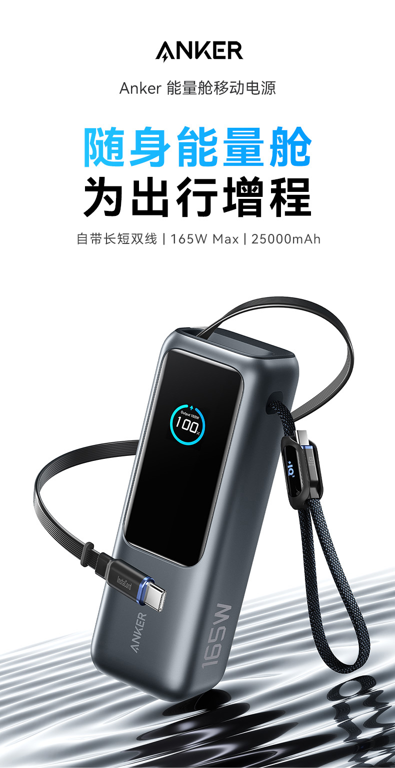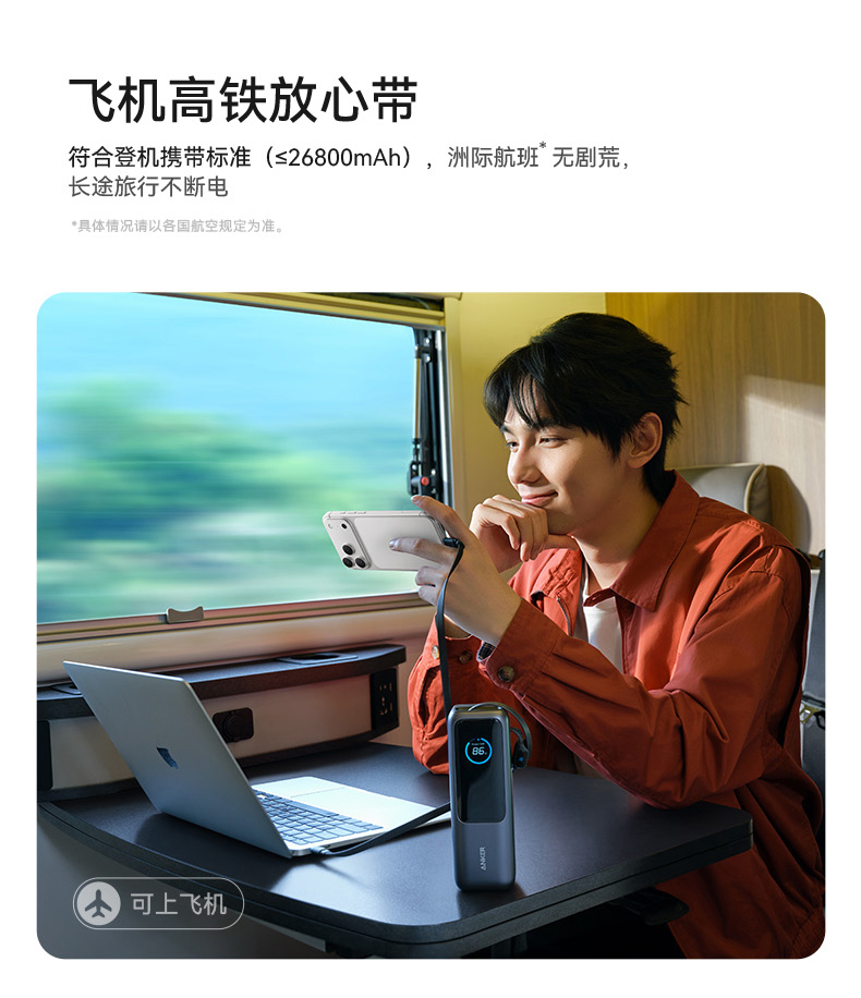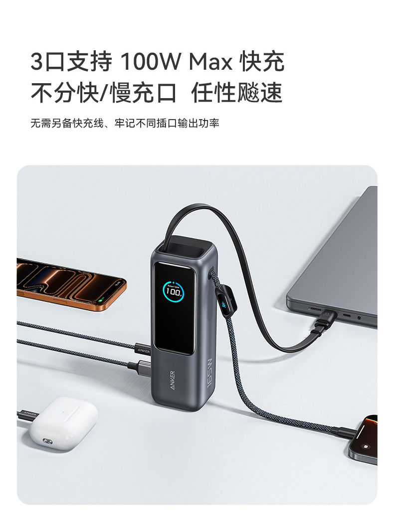 【热销】Anker安克 自带线伸缩25000mAh大容量移动电源165W大功率适配苹果17安卓笔记本可上飞机 A1695