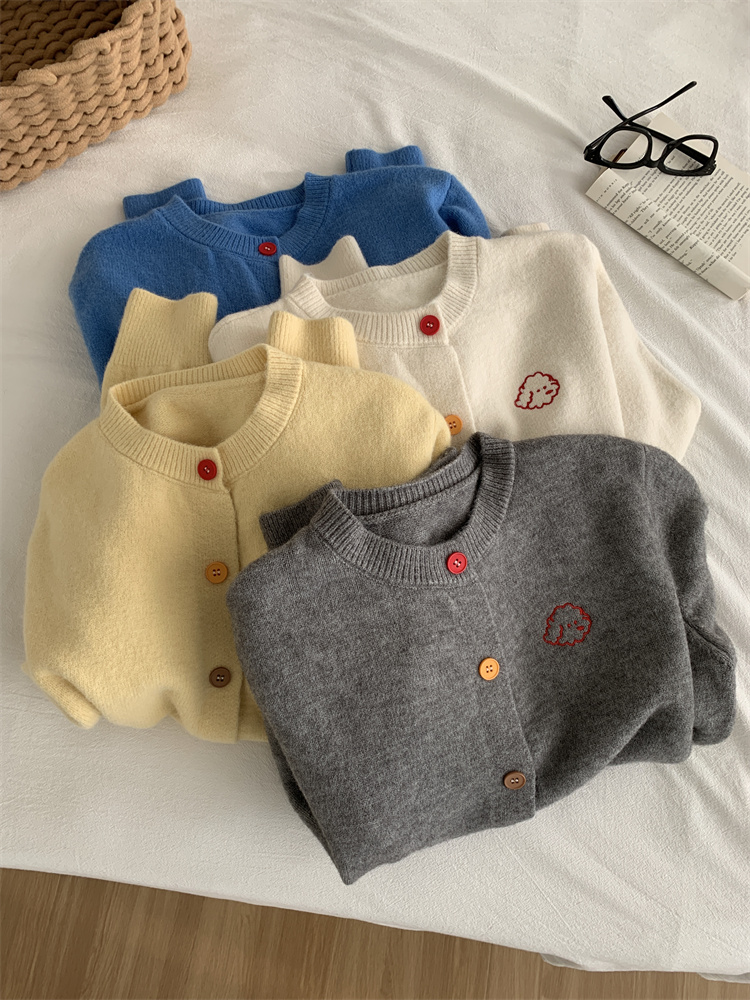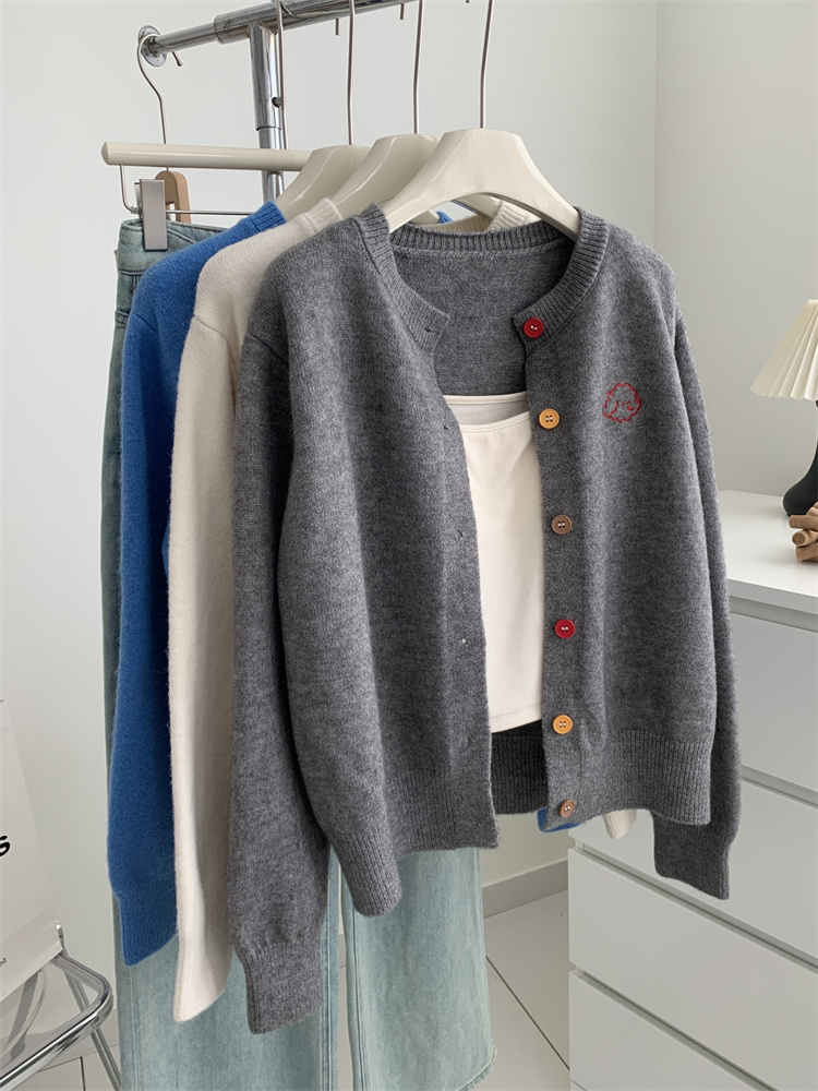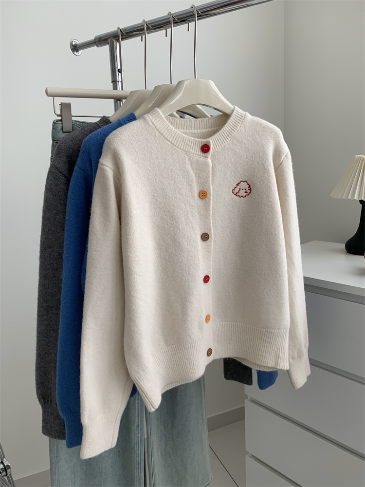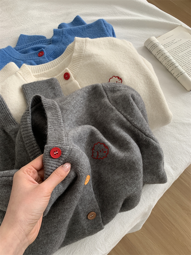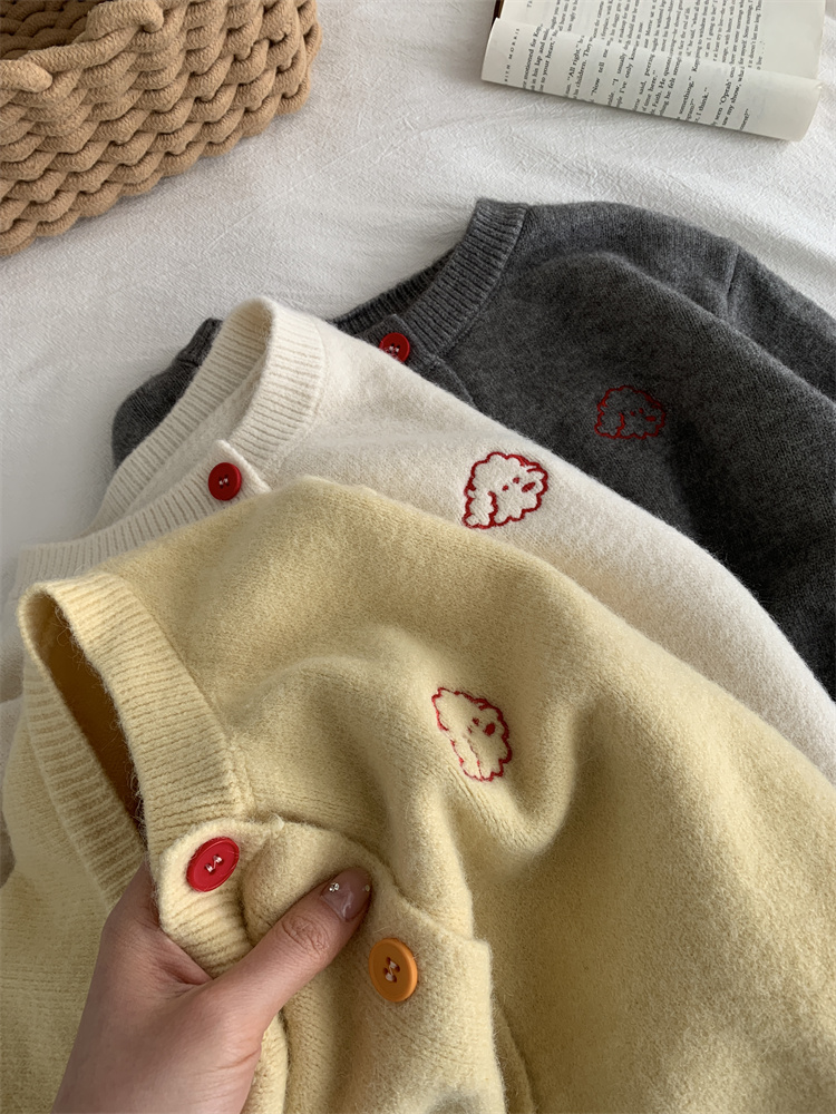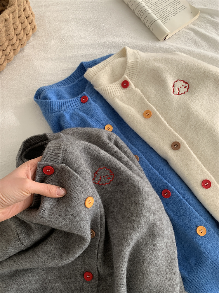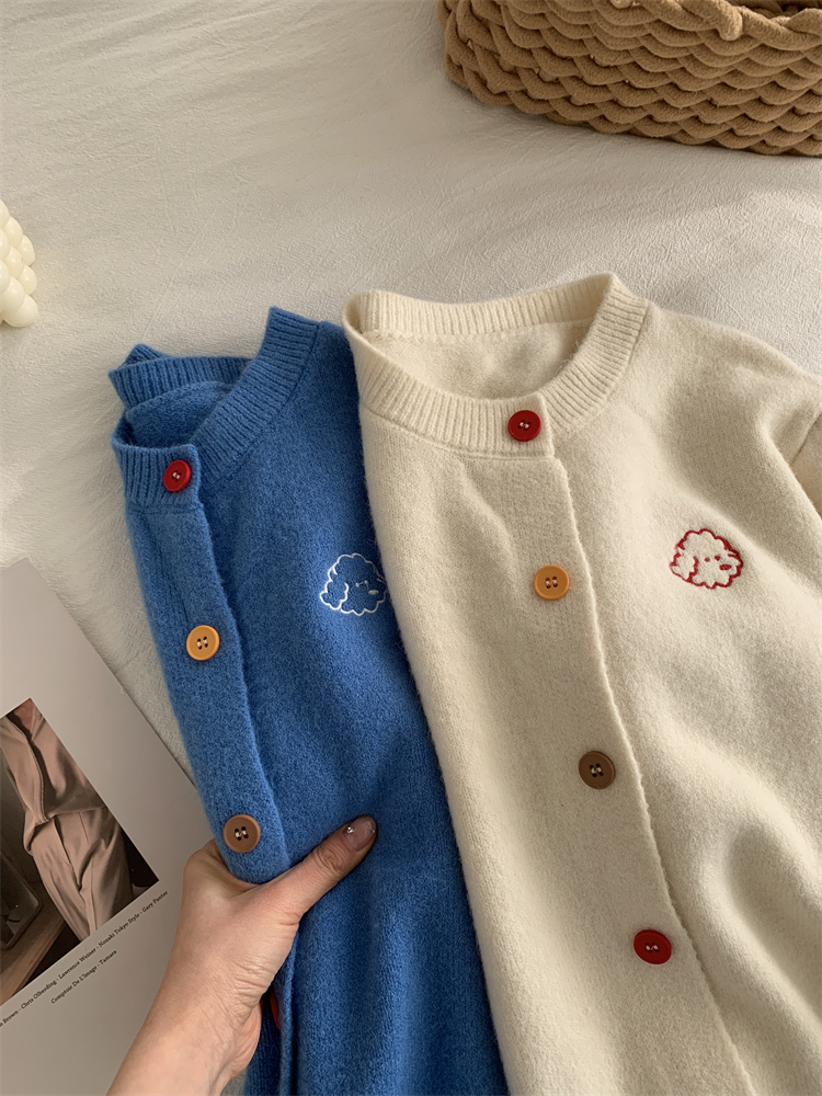 温柔复古减龄小狗刺绣彩扣圆领针织开衫 秋冬毛衣加厚外套