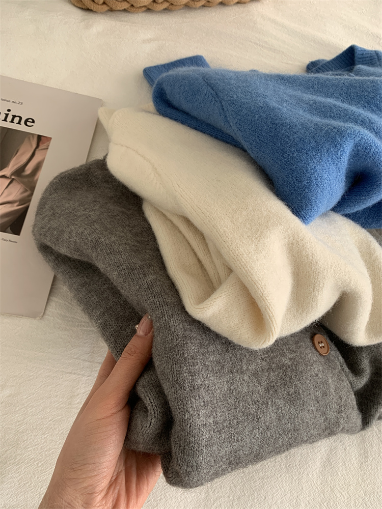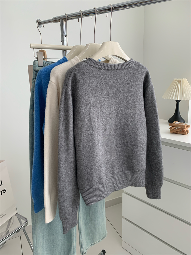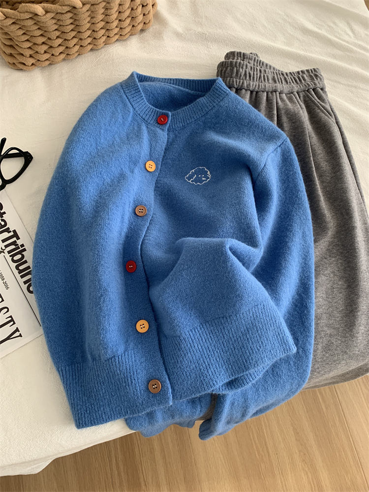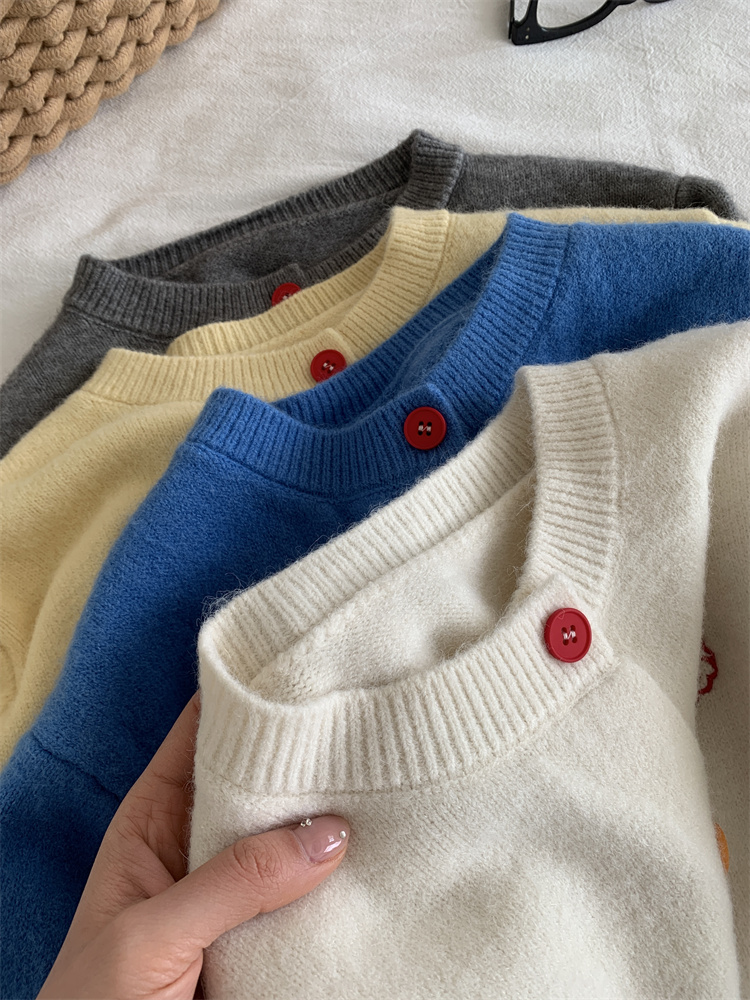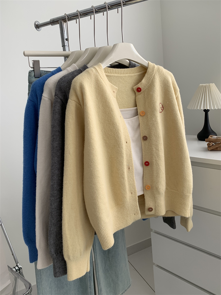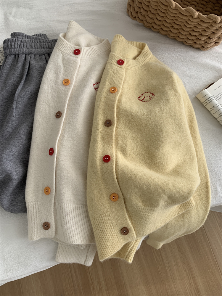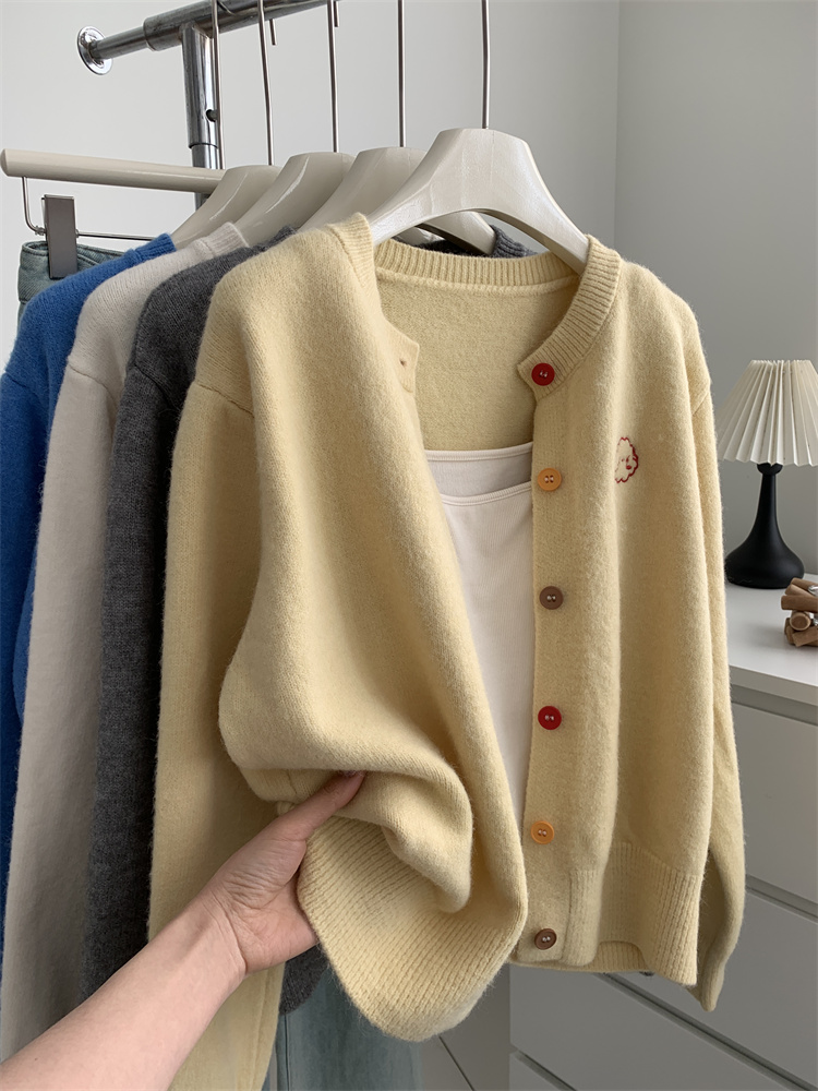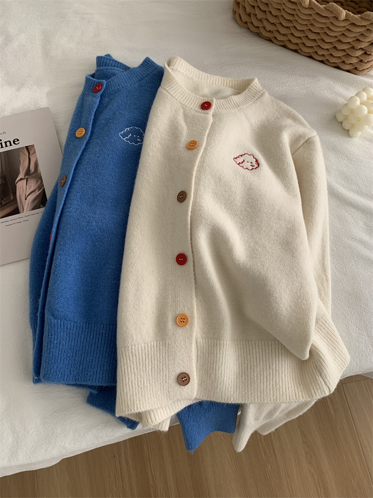 温柔复古减龄小狗刺绣彩扣圆领针织开衫 秋冬毛衣加厚外套