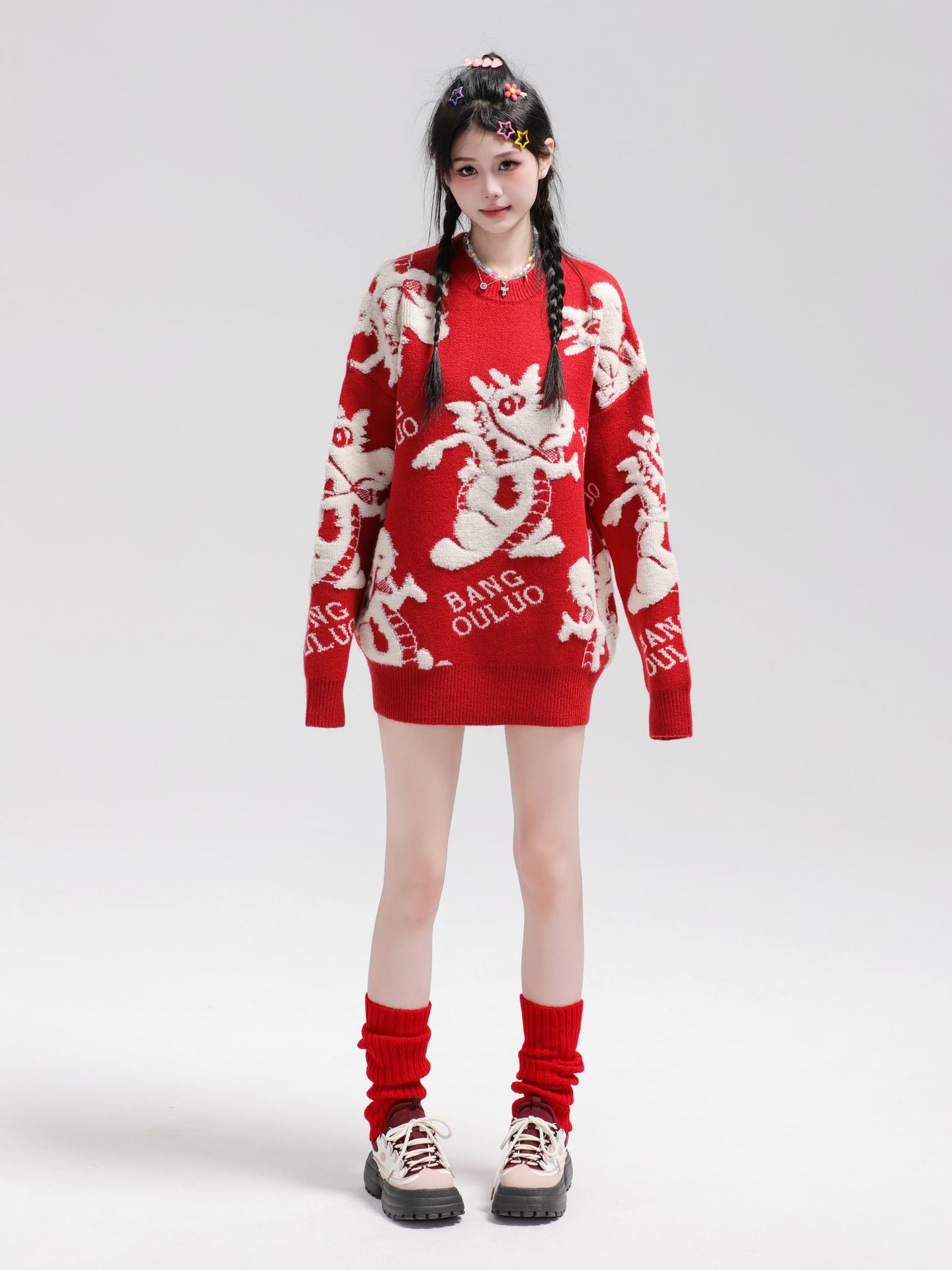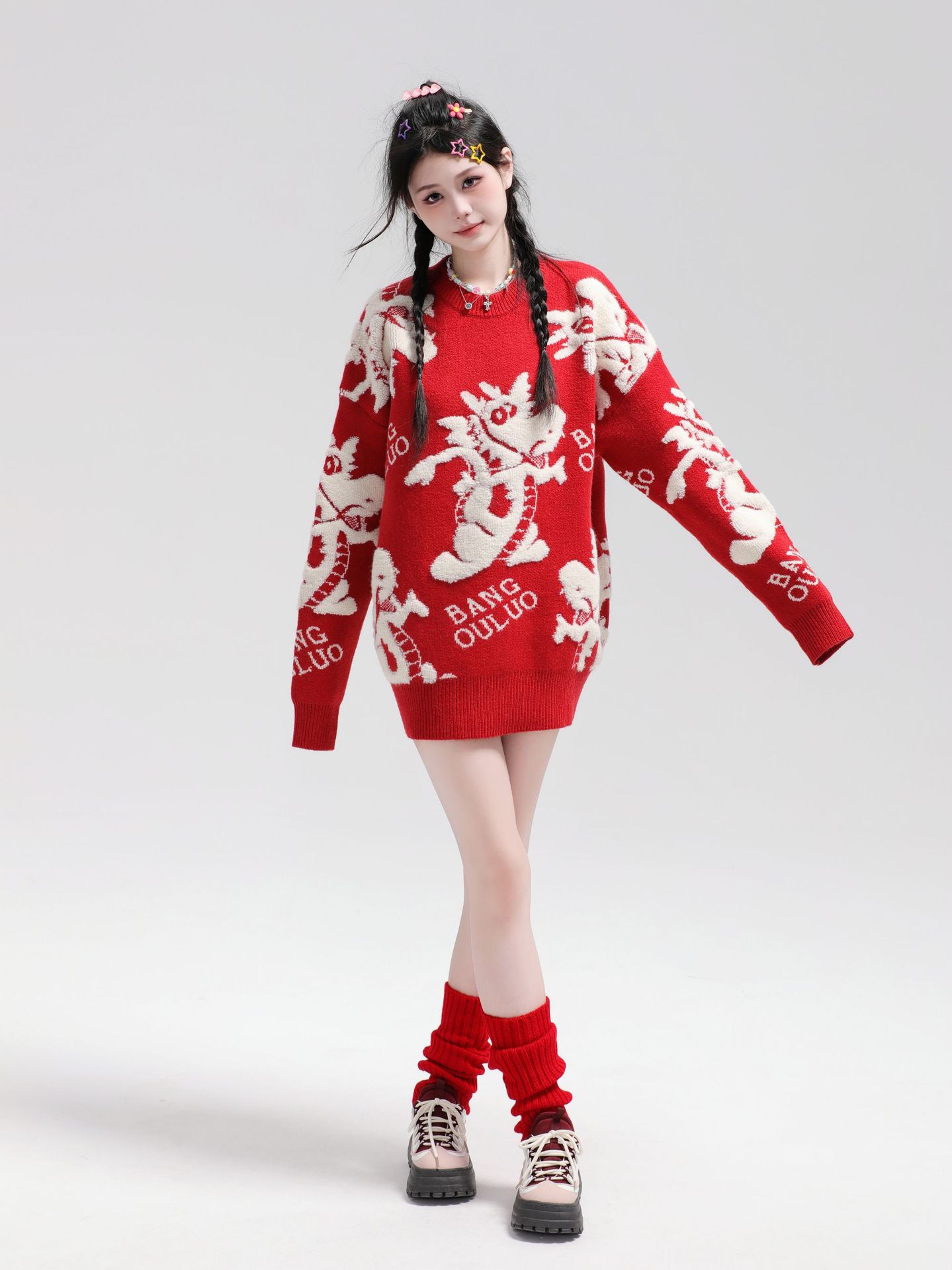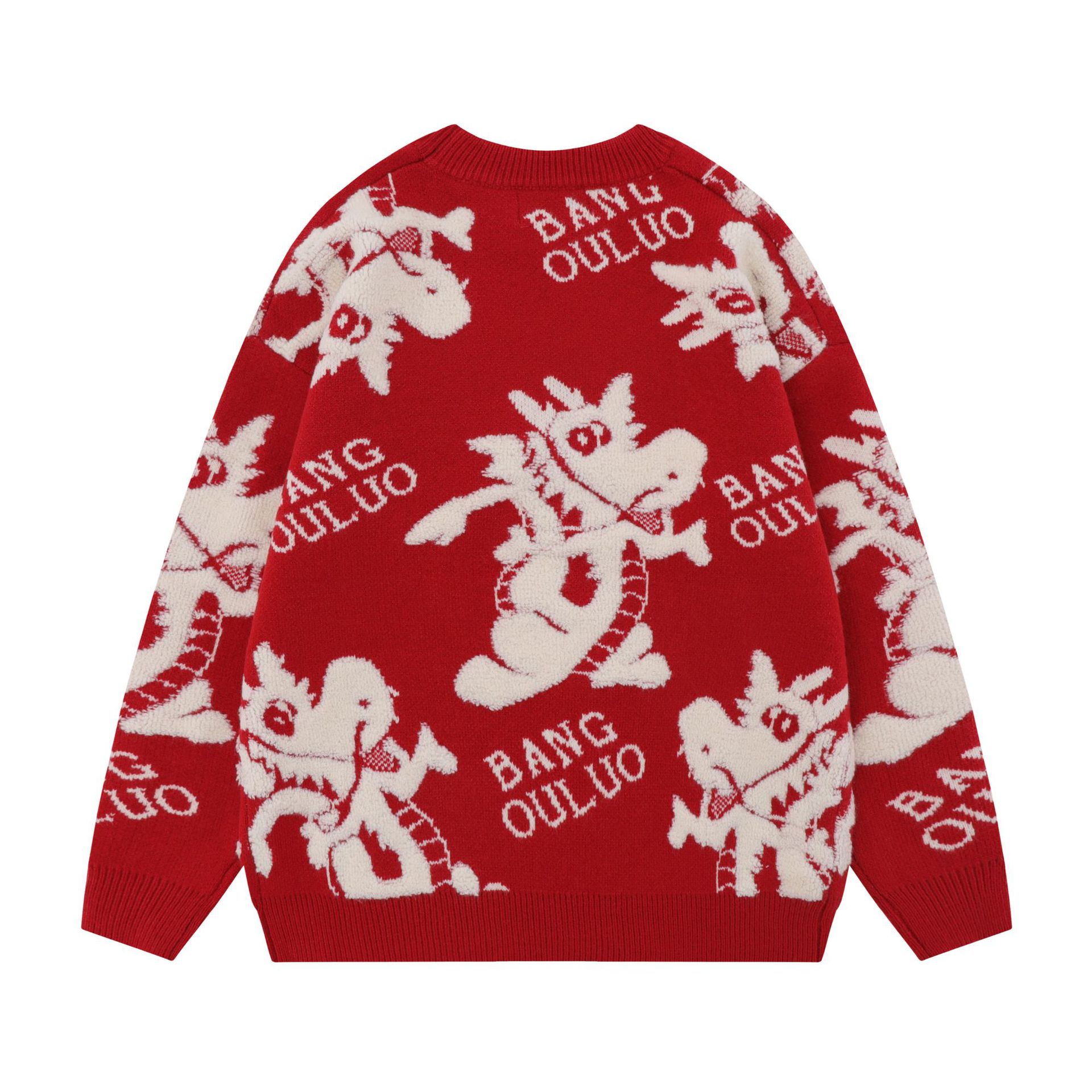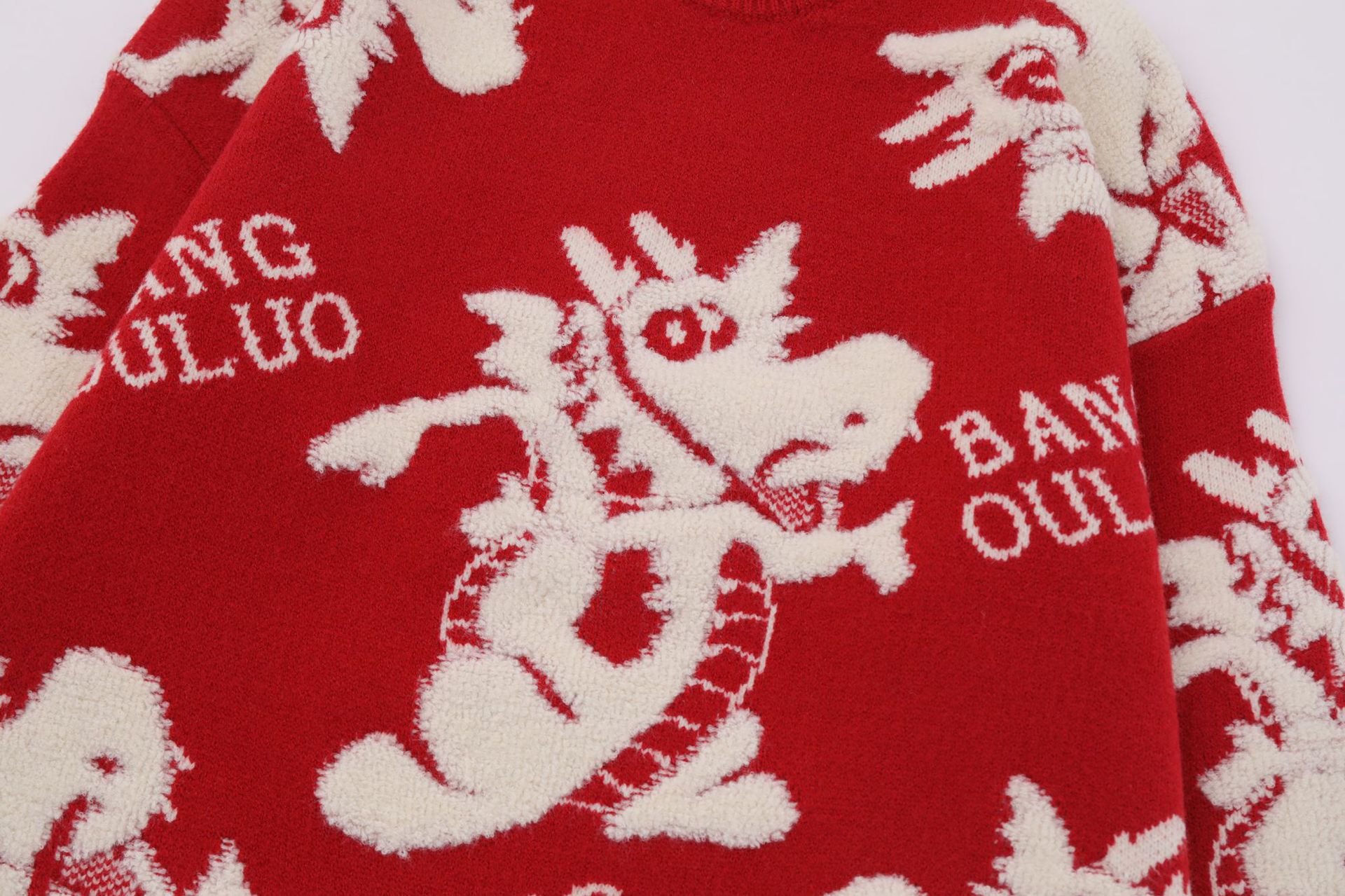 【服饰专场】秋冬新款实拍宽松情侣版龙年提花圆领针织毛衣