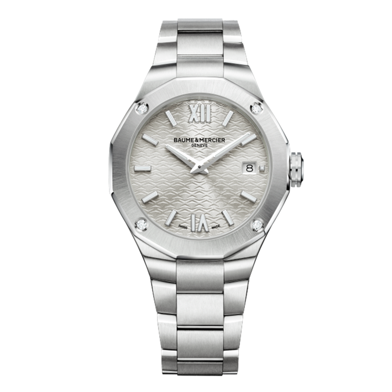 镜面材质 | 蓝宝石水晶玻璃 | 表盘 | 精钢表壳 四颗镶钻的十二边形表圈 太阳缎面打磨银色水波饰纹表盘 罗马数字 棒状时标 多面的镀铑指针 日期显示 |