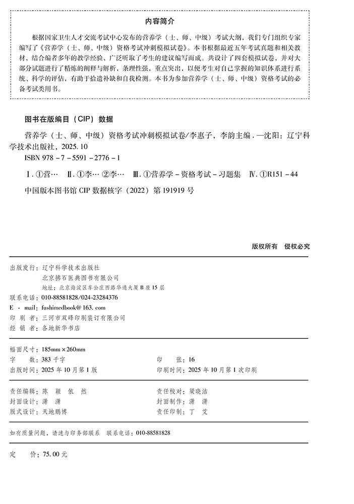 2026营养学(士、师、中级) 资格考试冲刺模拟试卷 全国初中级卫生专业技术资格考试辅导丛书 李惠子 李韵 辽宁科学技术出版社