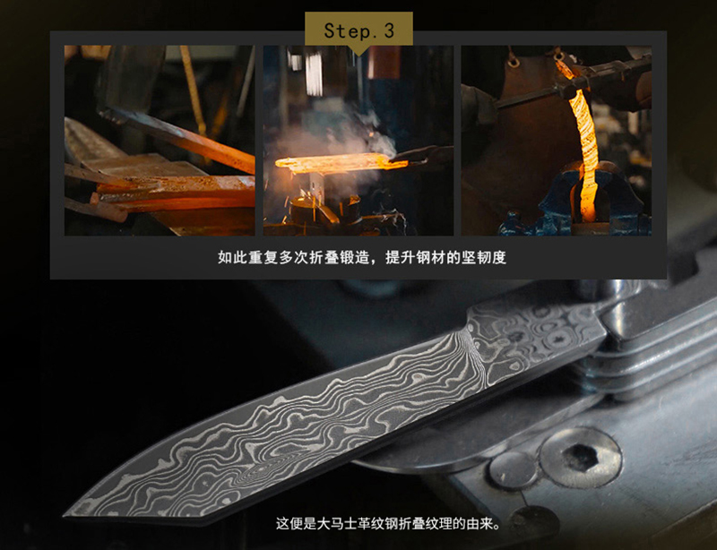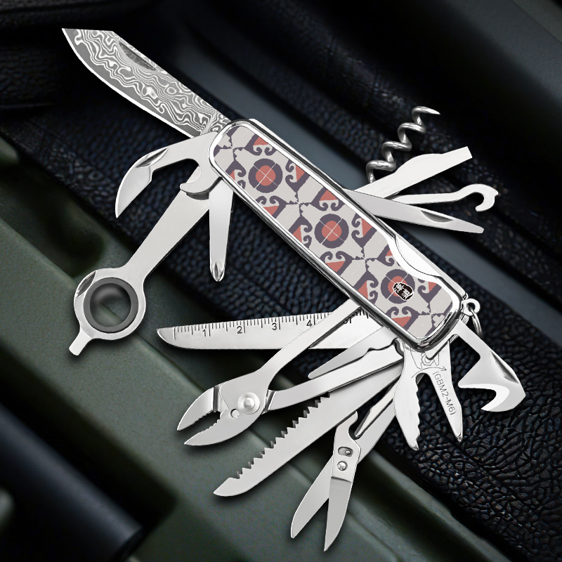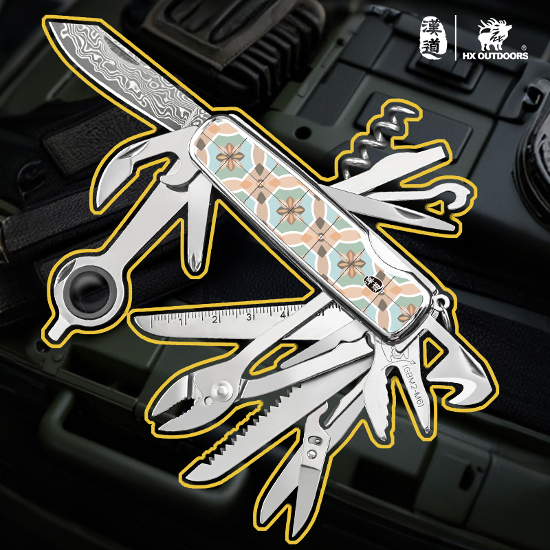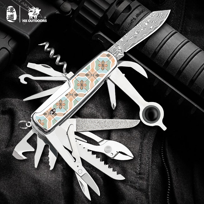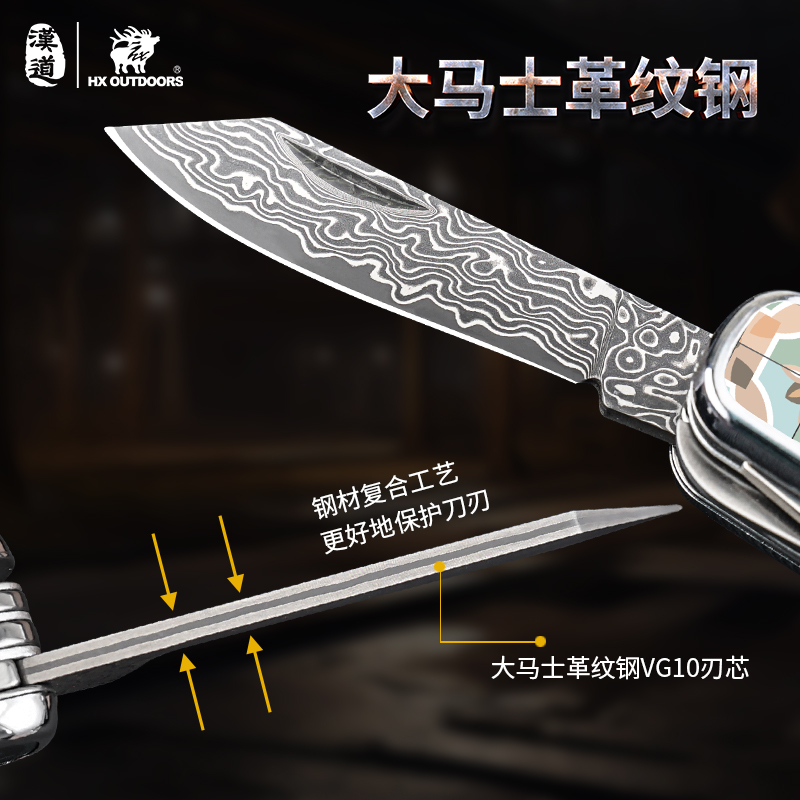 汉道大马士革纹钢多功能折叠刀露营便携车载应急多用工具瑞士军刀