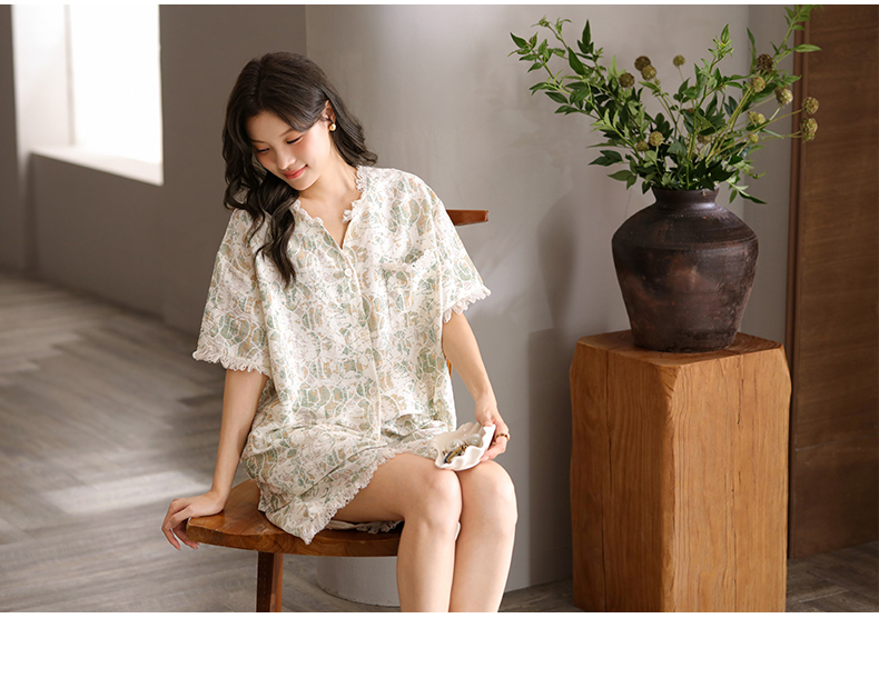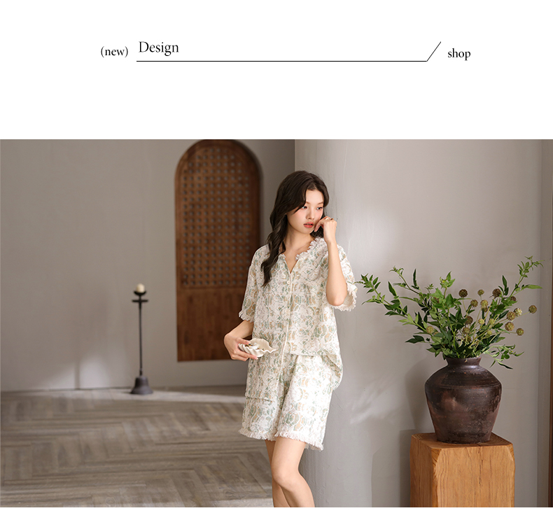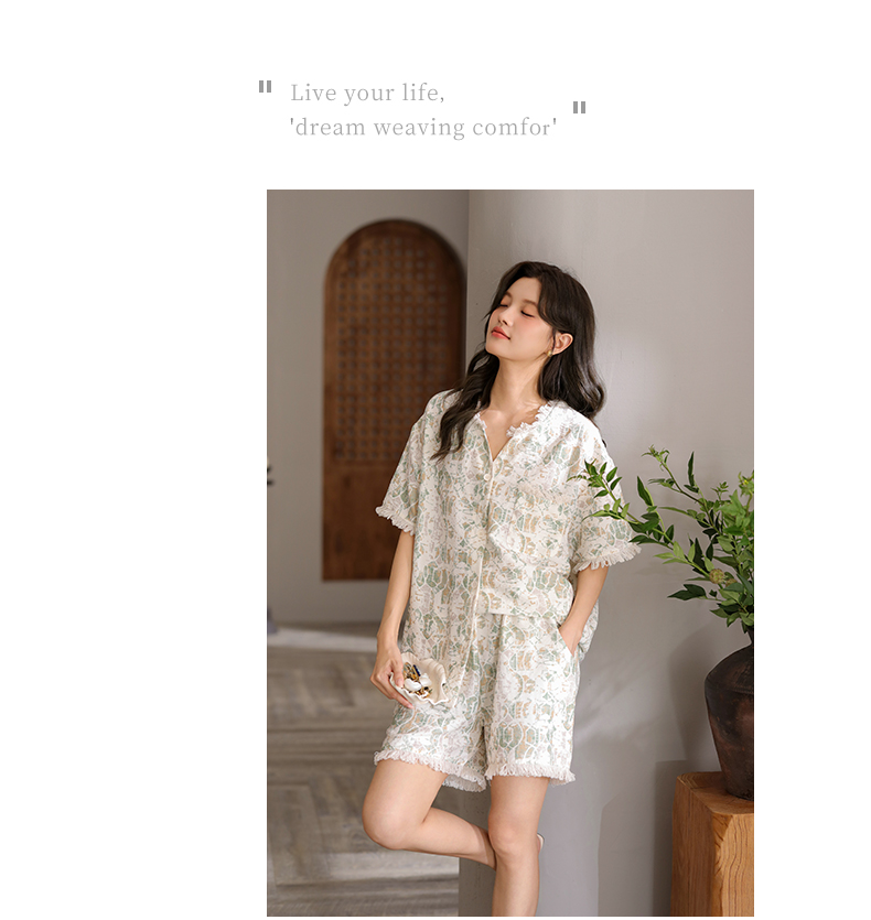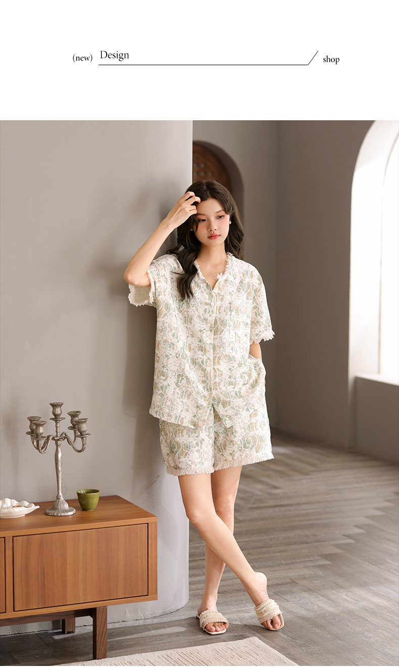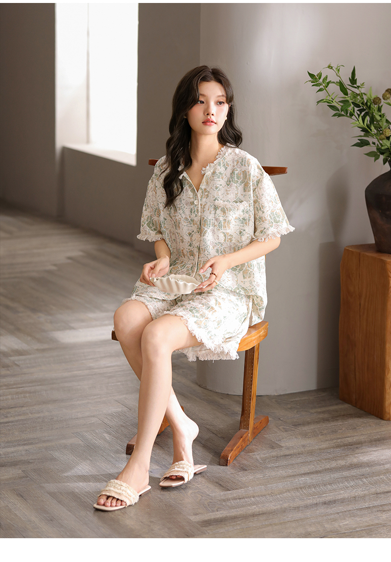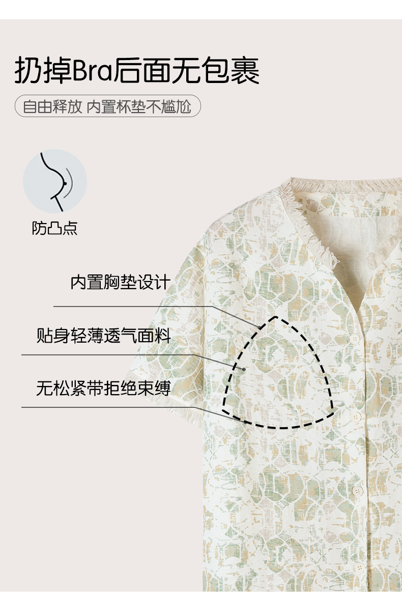 可人儿小众设计泡泡绵女士带胸垫睡衣夏季短袖可外出家居服三件套