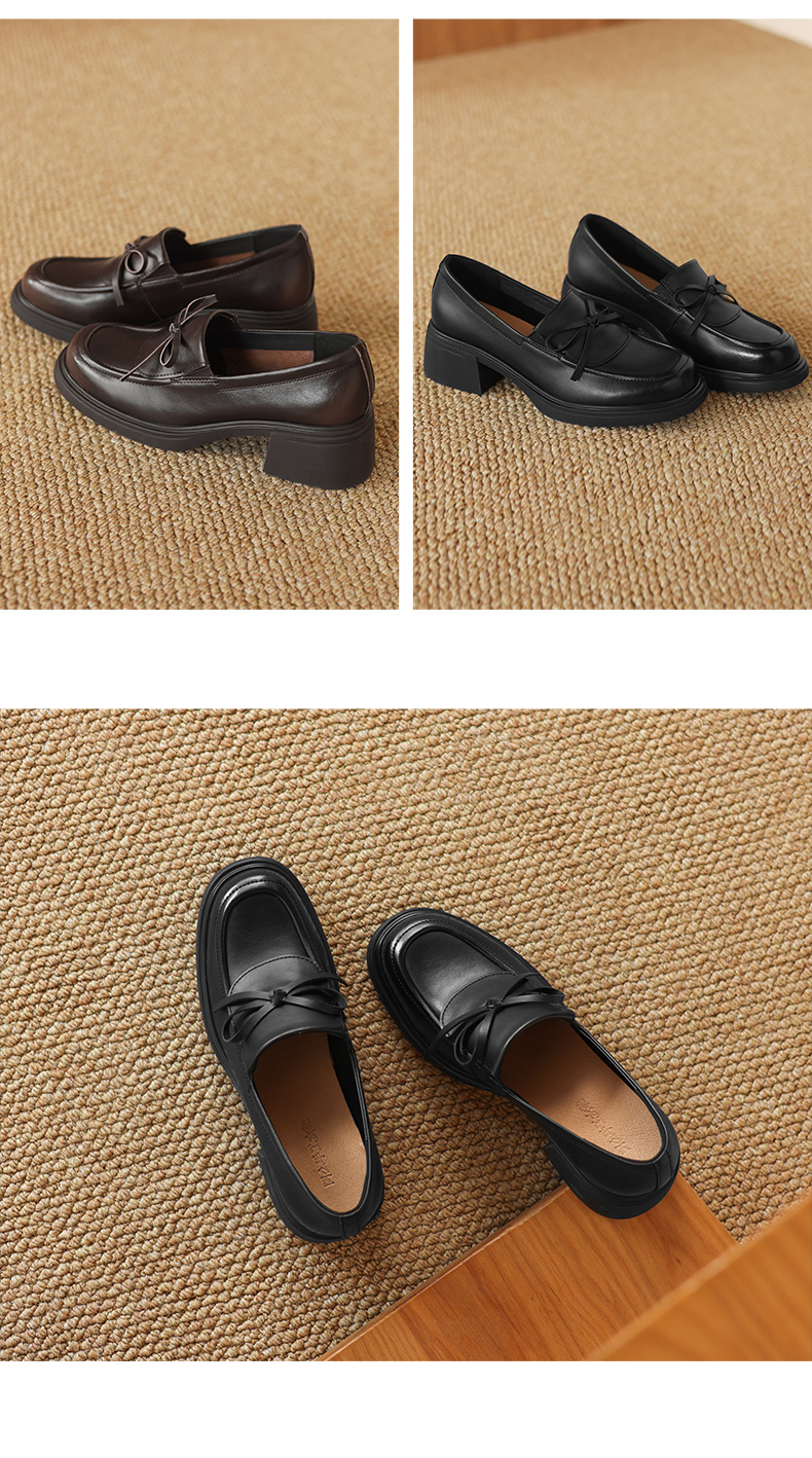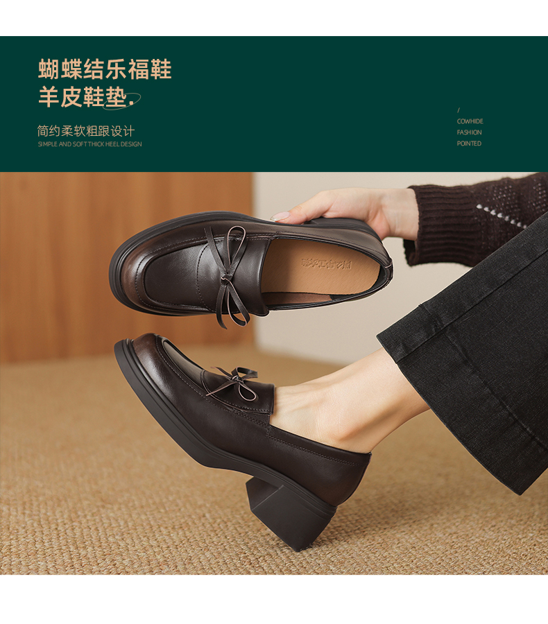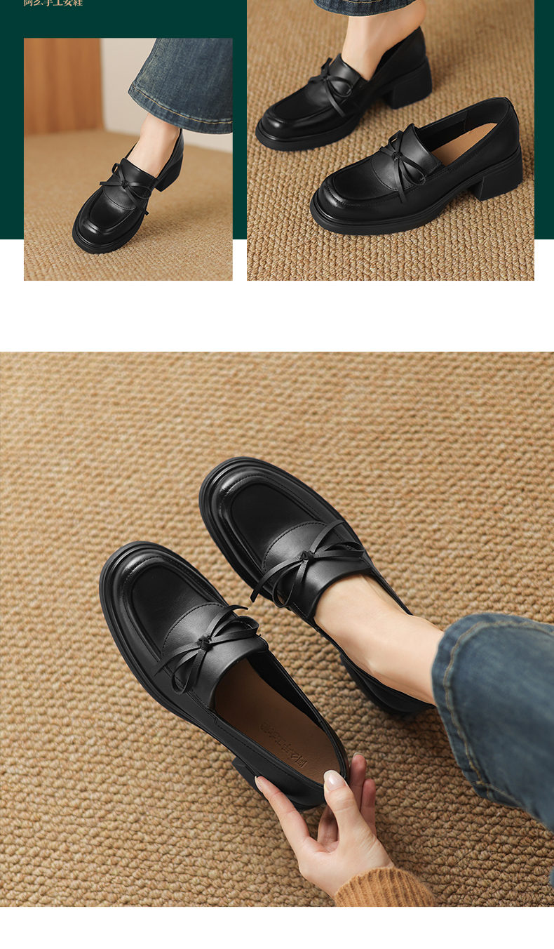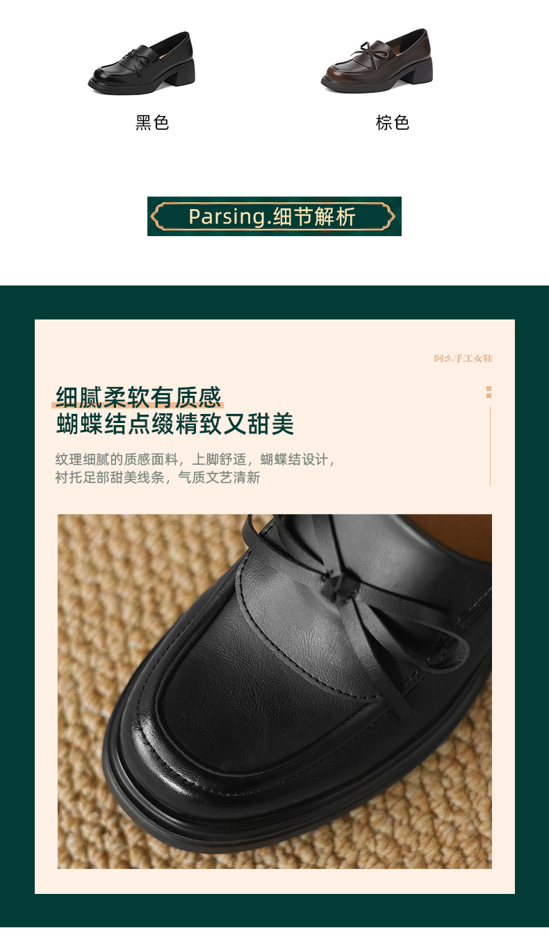阿么手工女鞋蝴蝶结粗跟小皮鞋女款软皮软底真皮百搭乐福鞋5.8CM