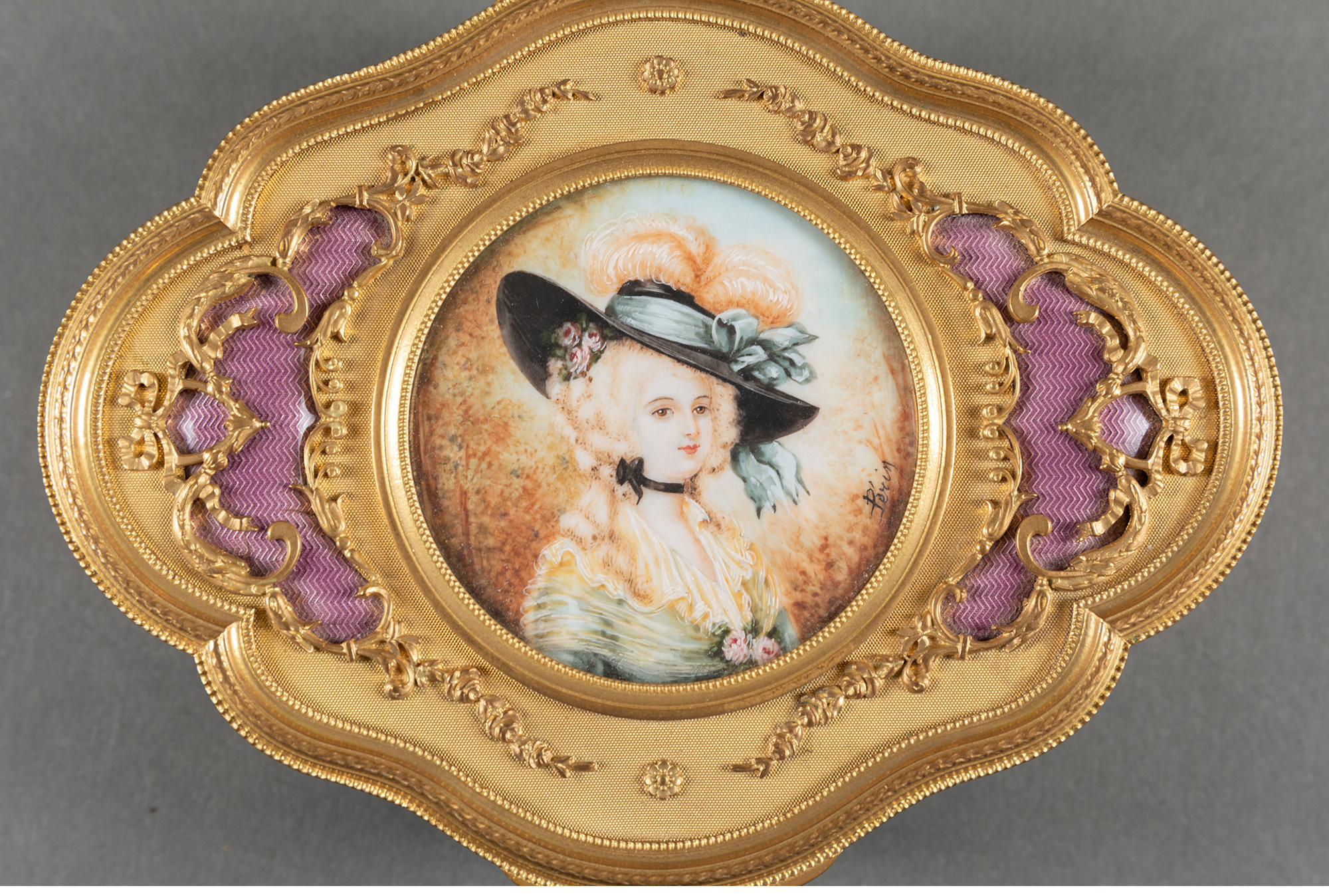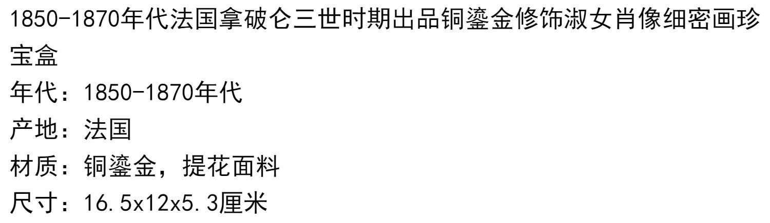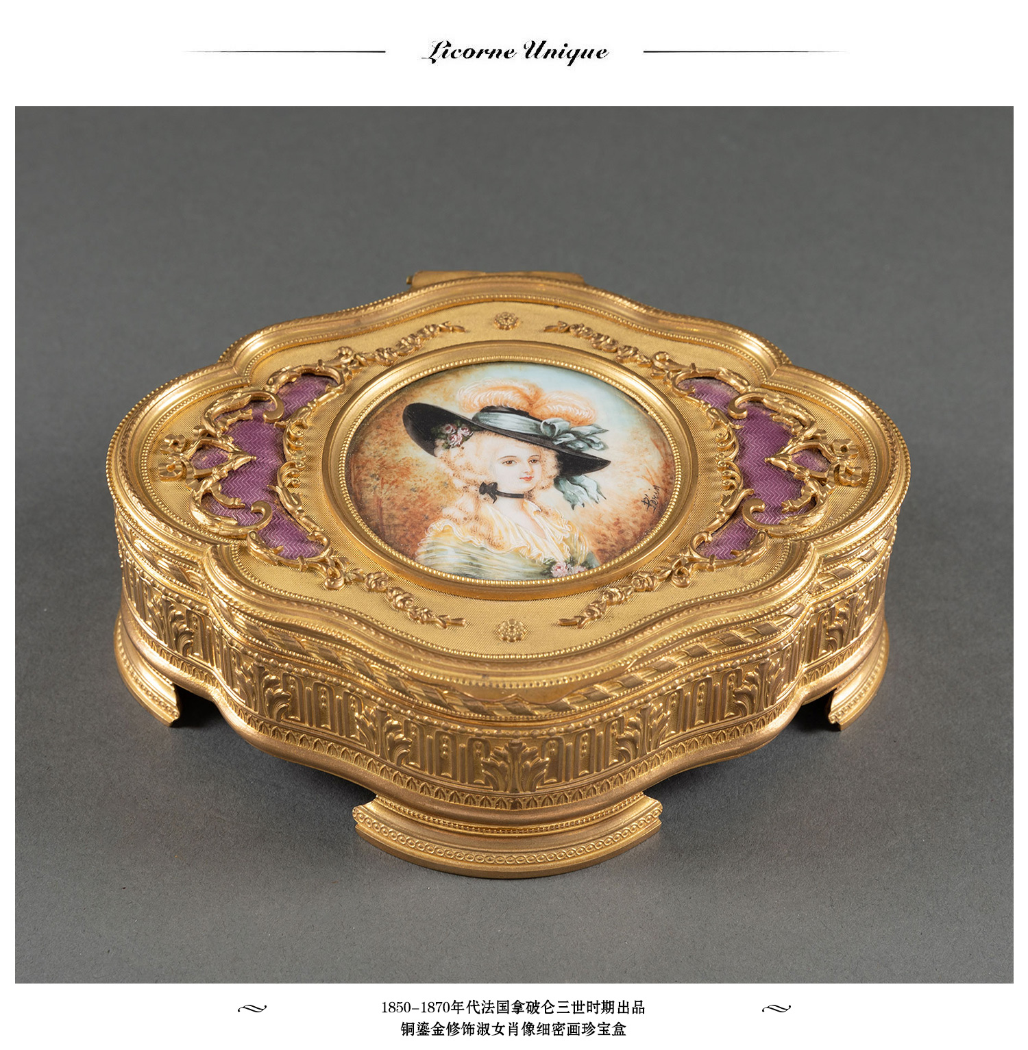 独角鹿西洋古董法国出品铜鎏金修饰淑女肖像细密画珍宝盒首饰盒