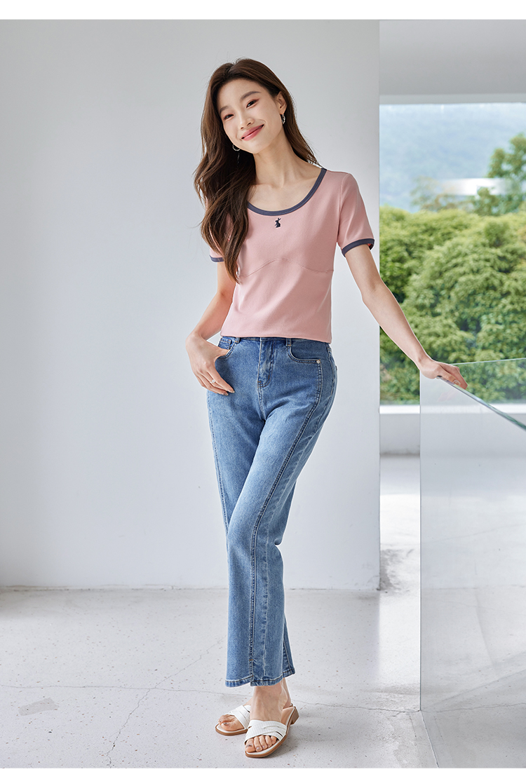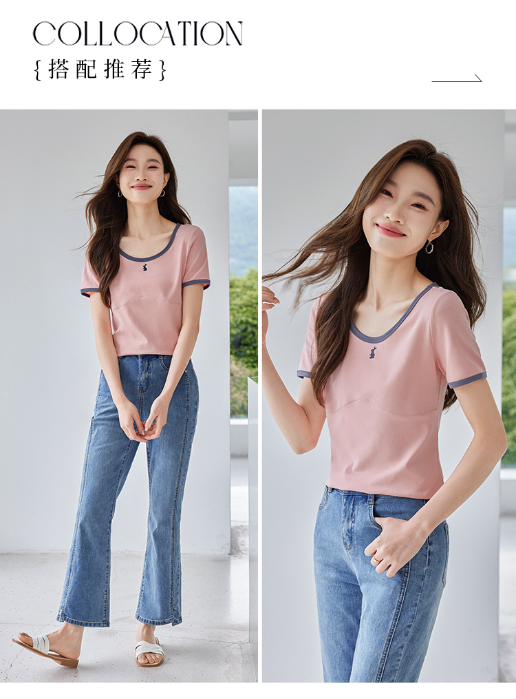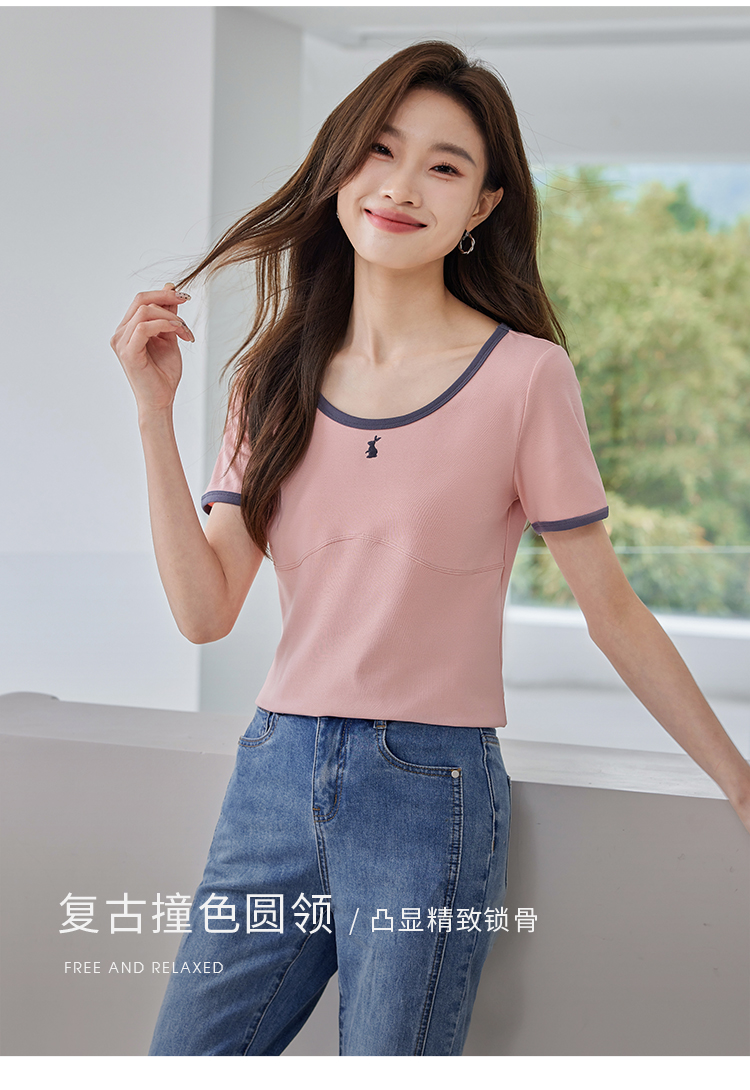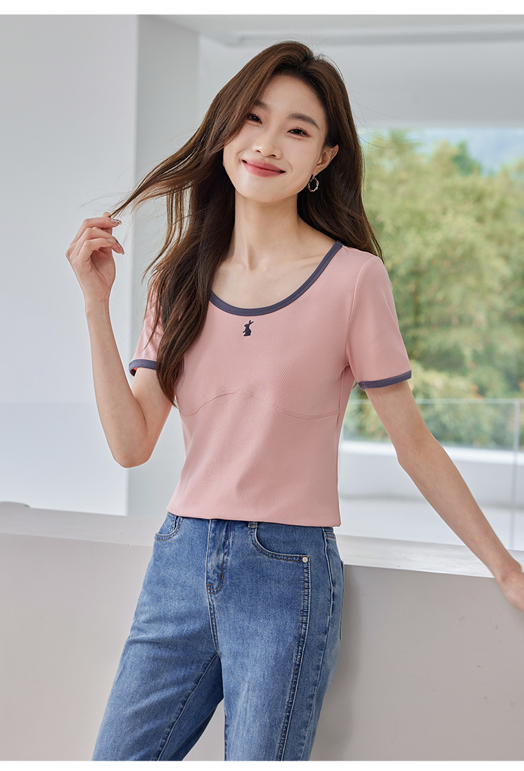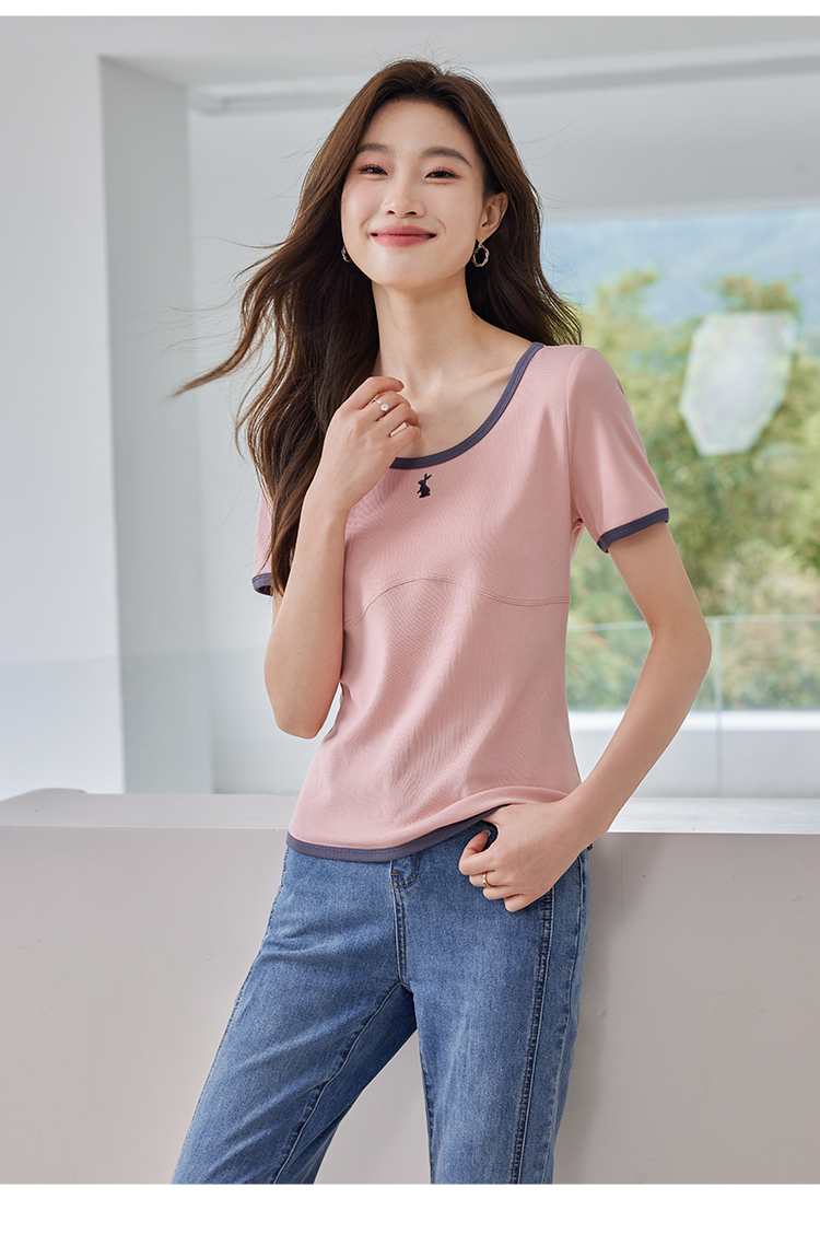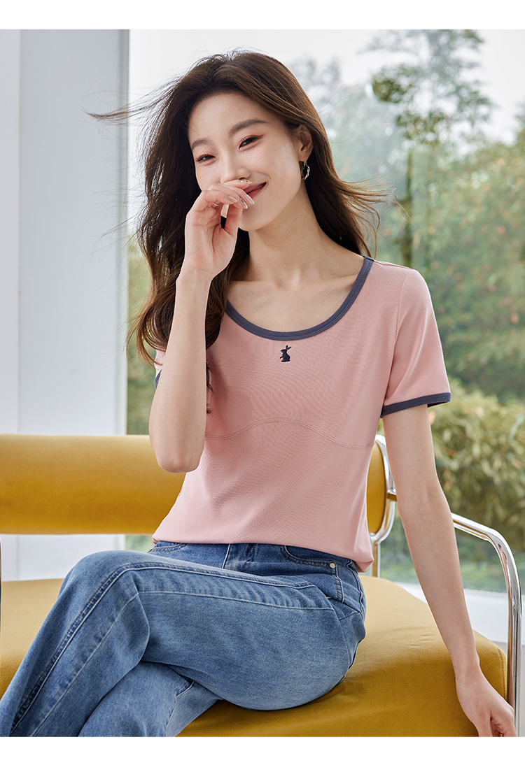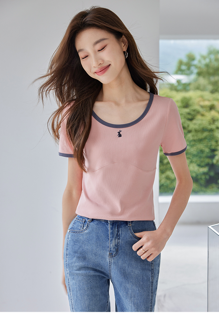 【专属特价】熙世界正肩刺绣短袖t恤夏2025新款宽松设计感小众法式粉色上衣