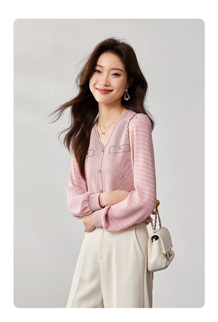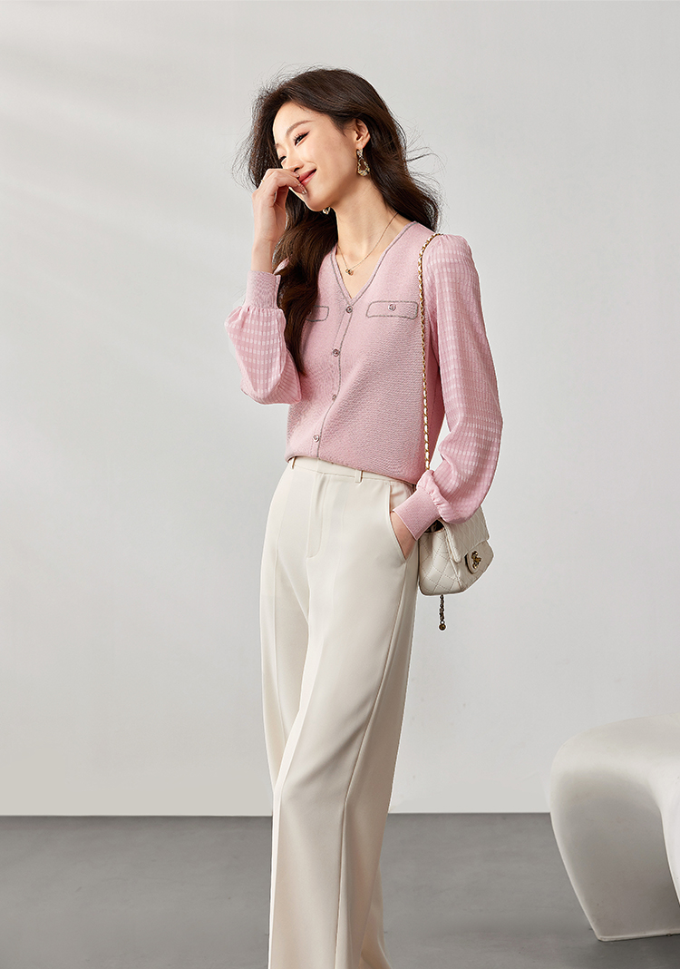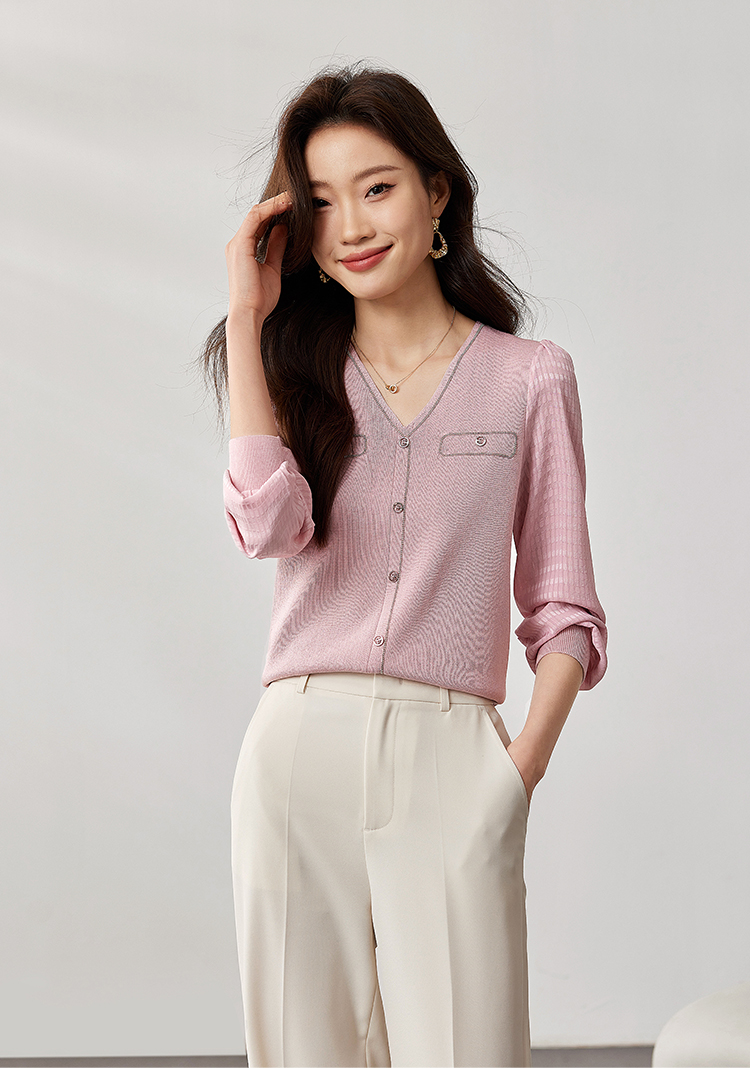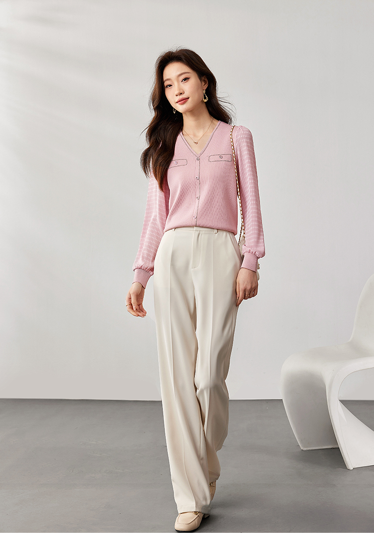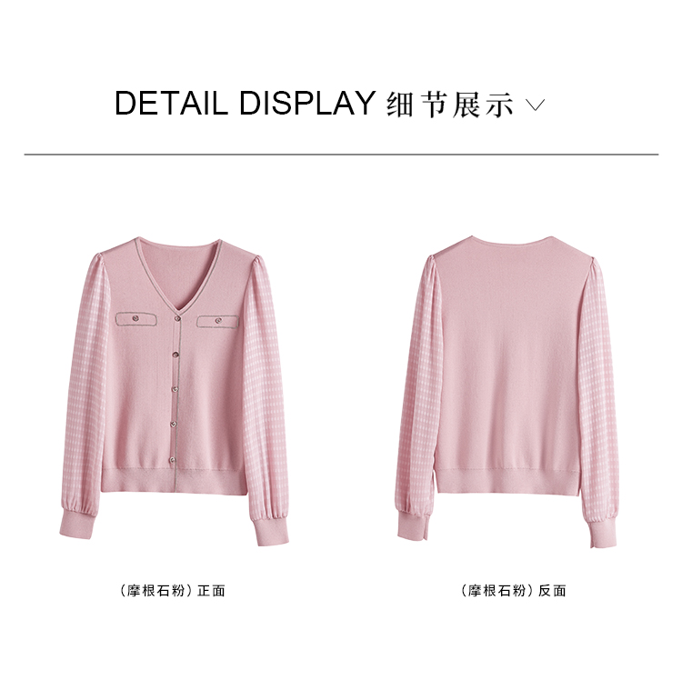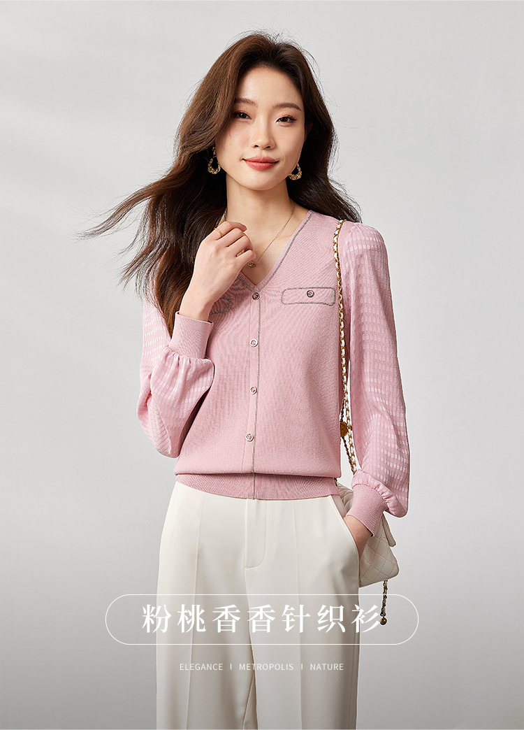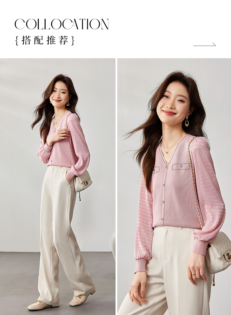 【专属特惠】熙世界小香风粉色V领针织衫2024秋季新款气质长袖拼接软糯上衣