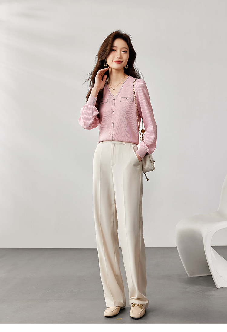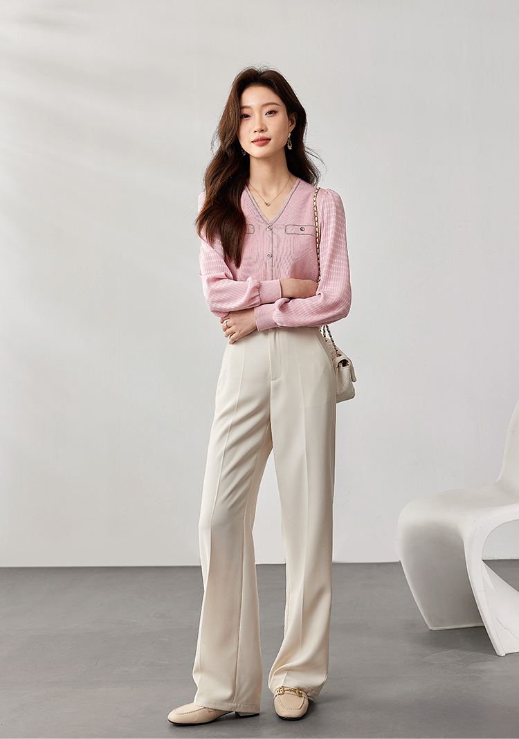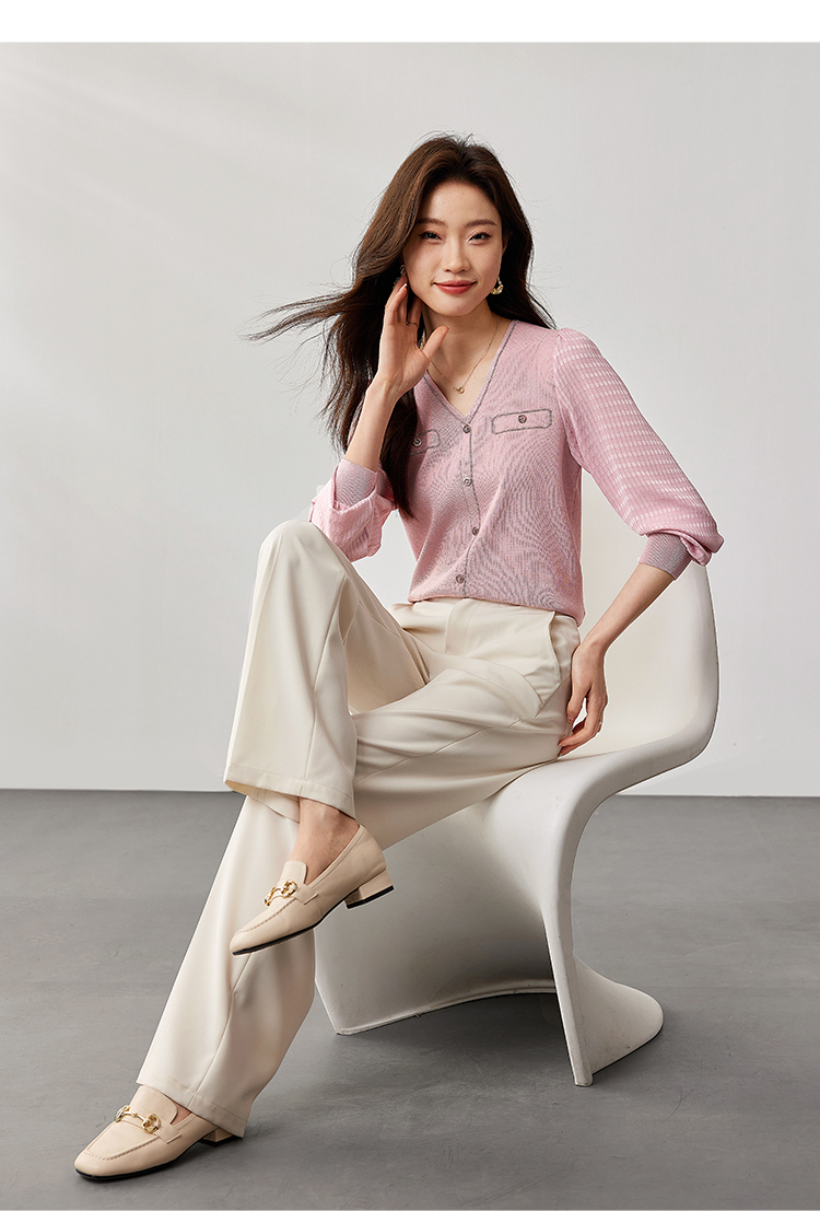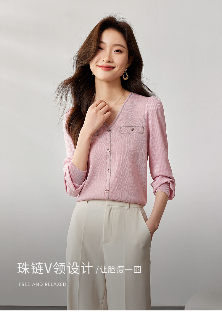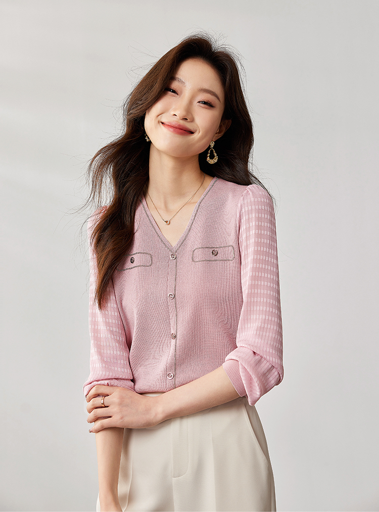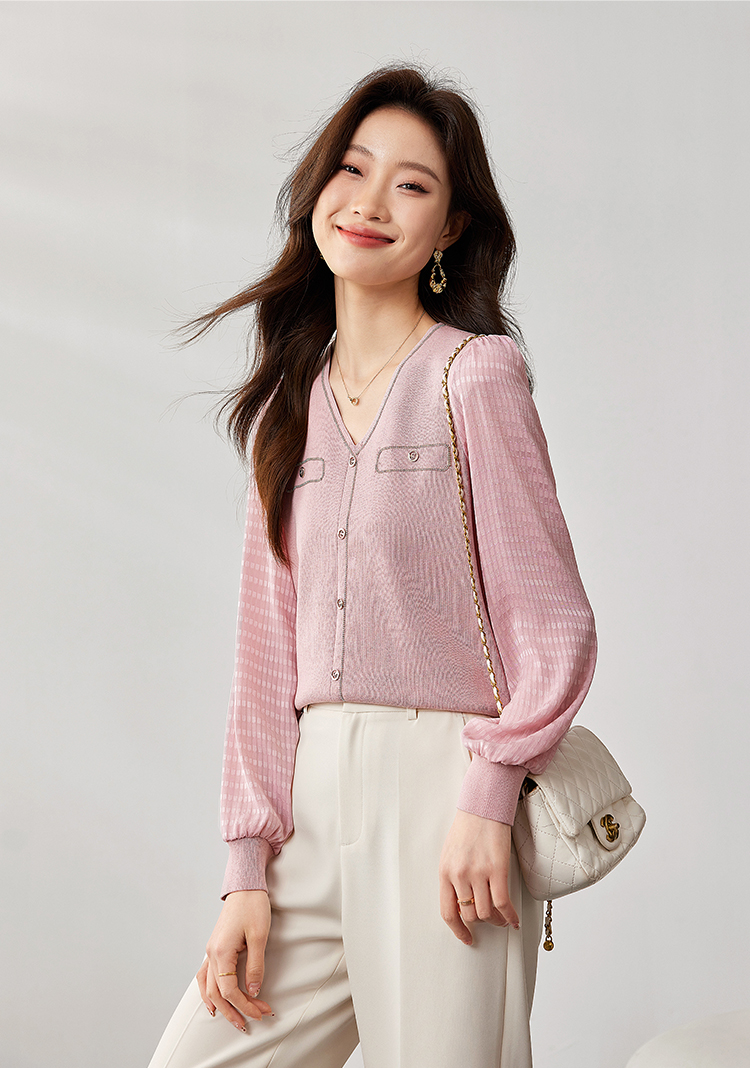 【专属特惠】熙世界小香风粉色V领针织衫2024秋季新款气质长袖拼接软糯上衣