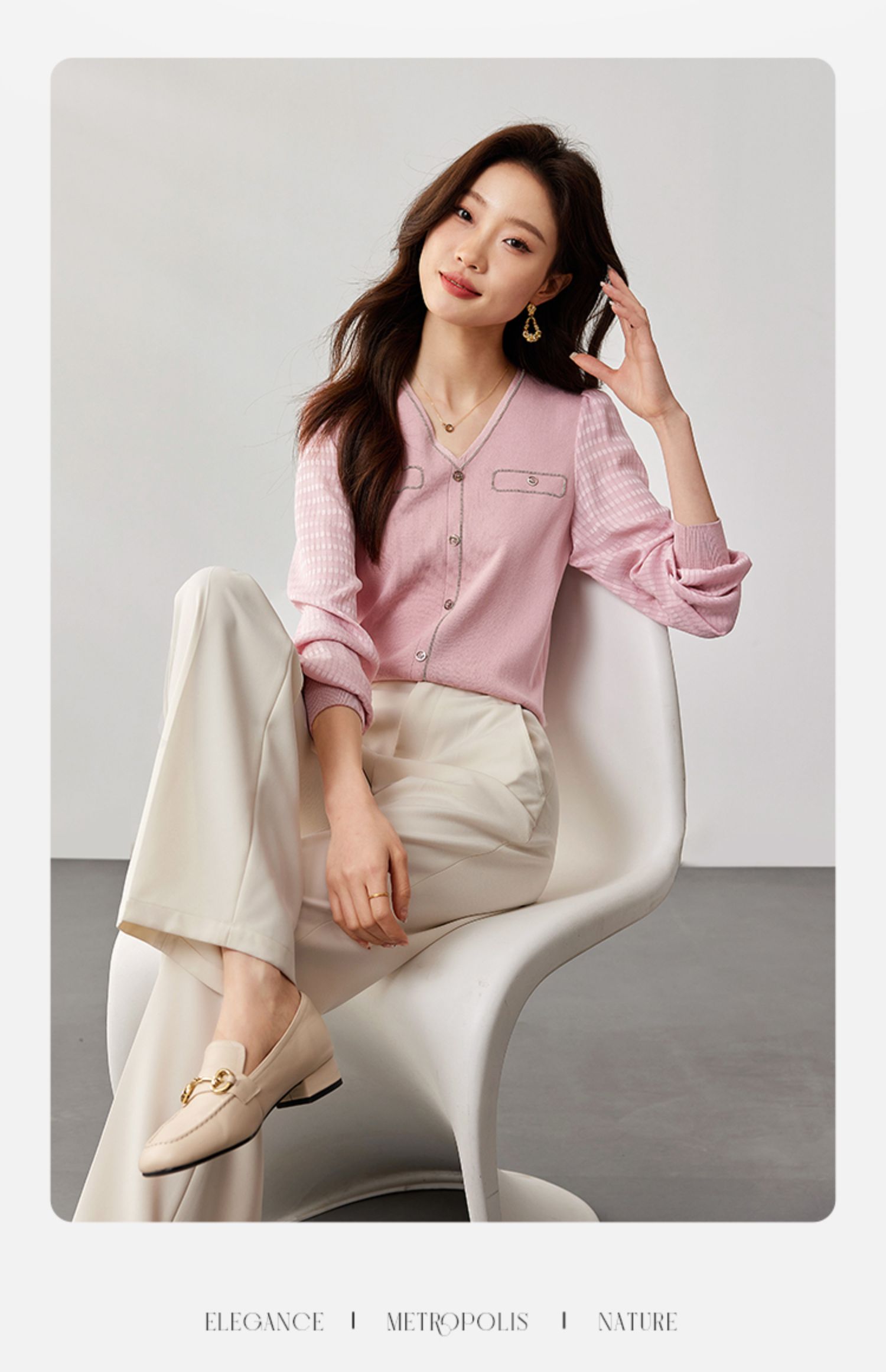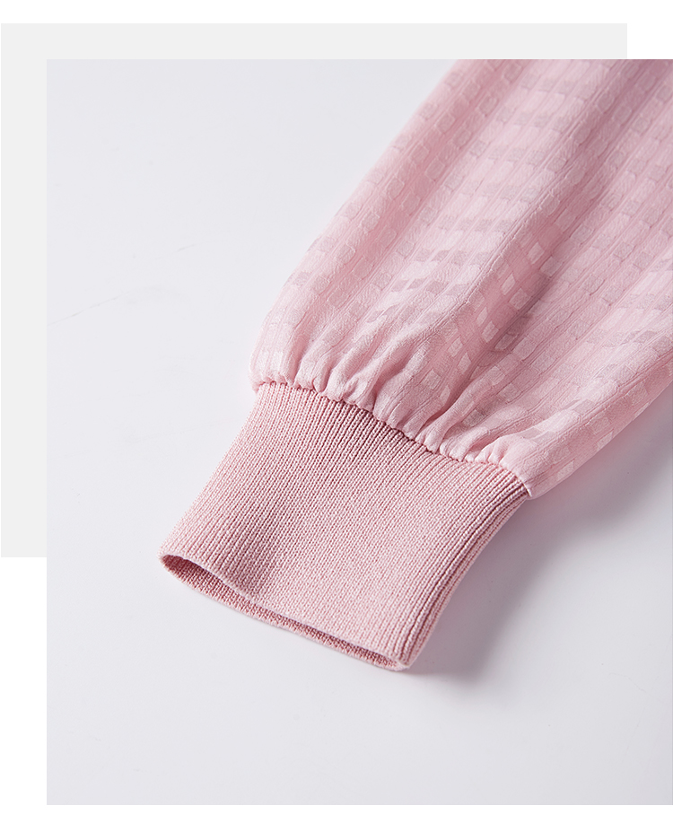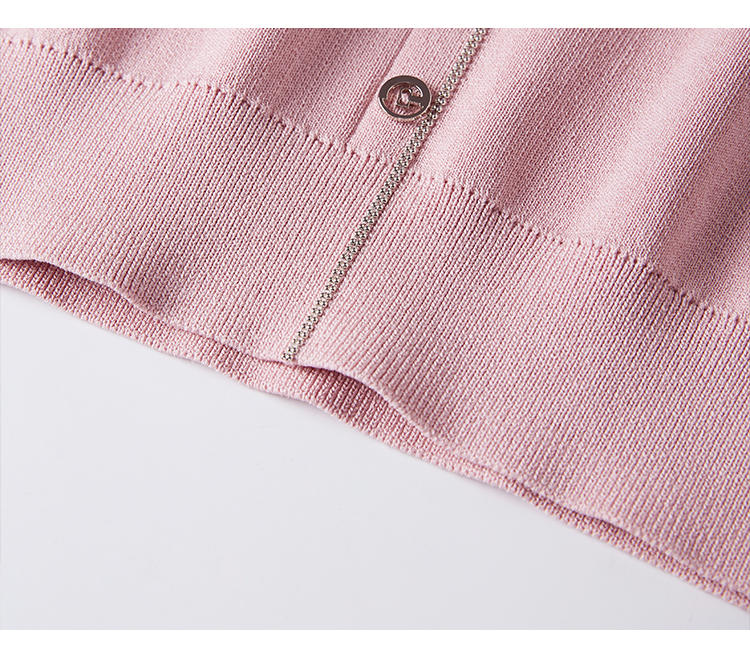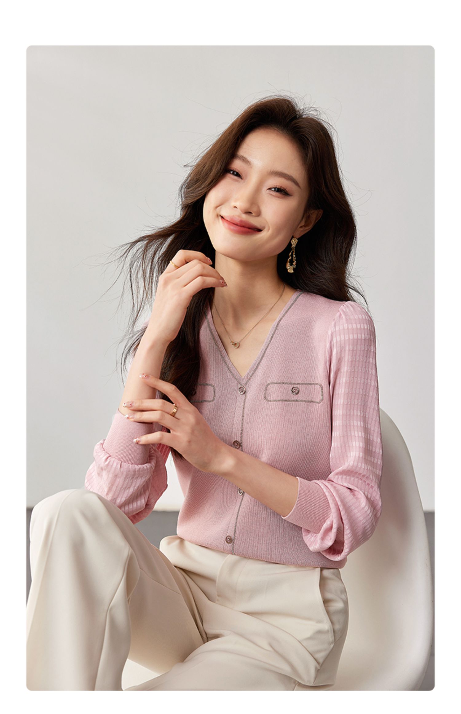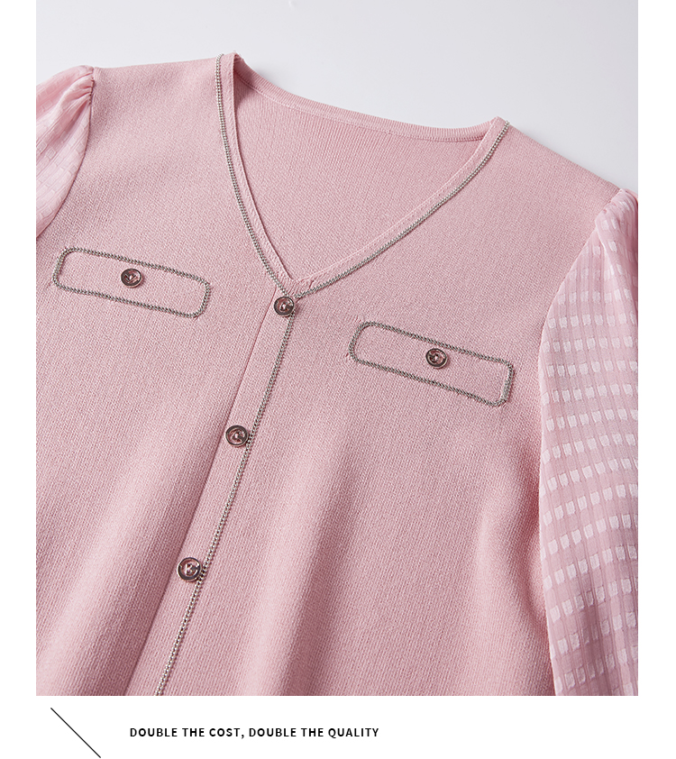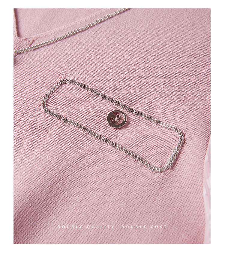 【专属特惠】熙世界小香风粉色V领针织衫2024秋季新款气质长袖拼接软糯上衣