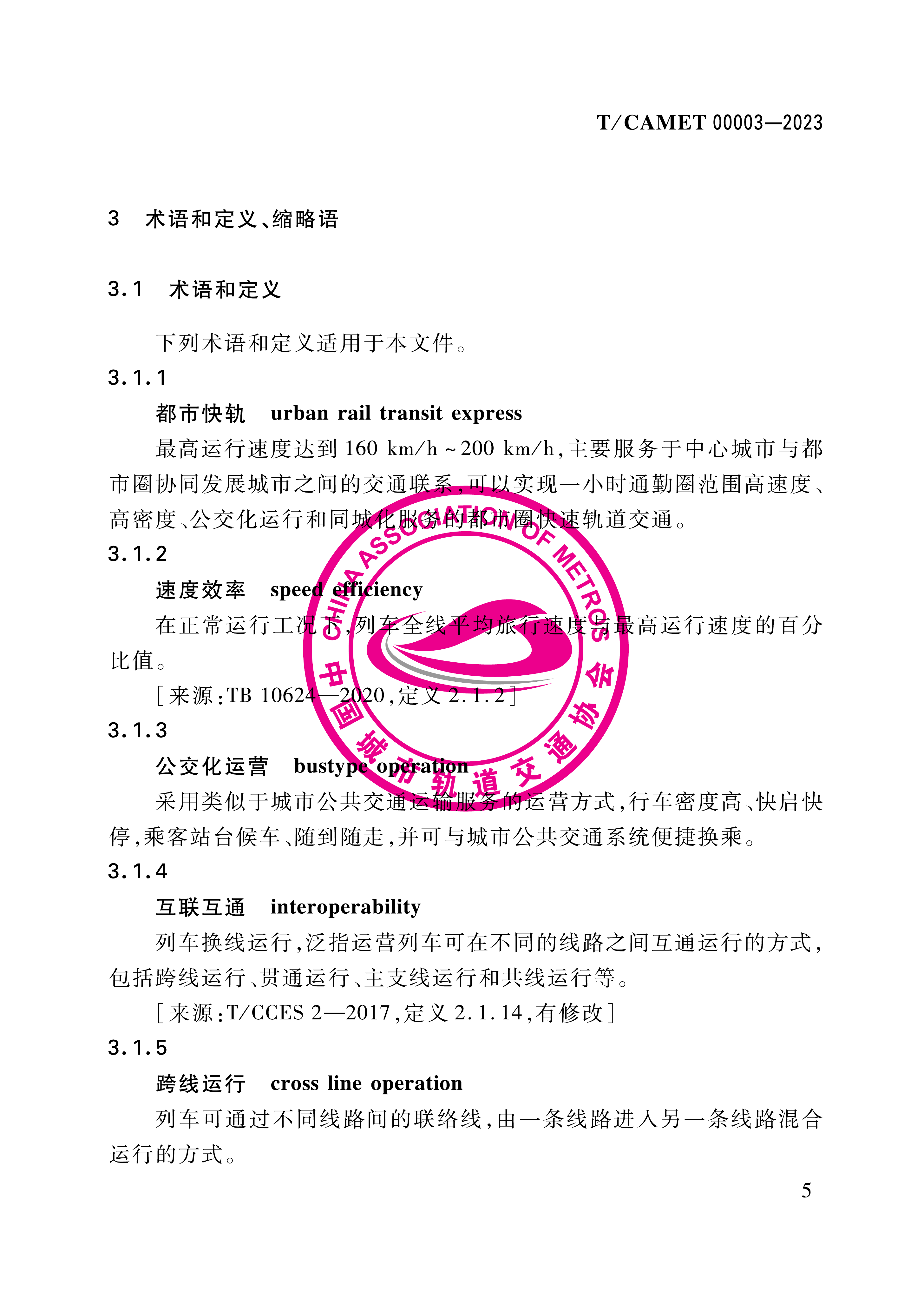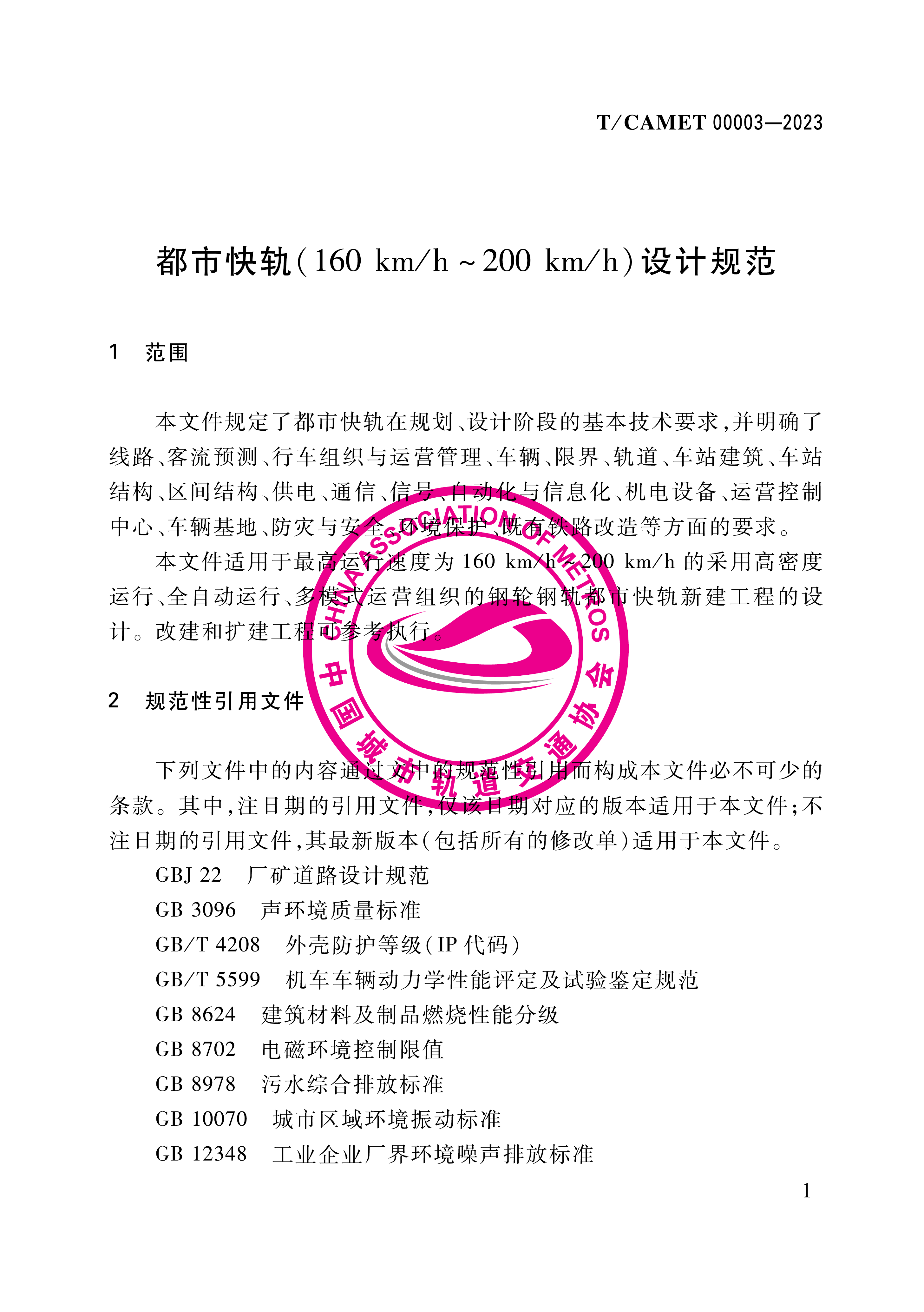 中国城市轨道交通协会团体标准的制定,旨在填补城轨领域行业标准的空白,利用团体标准先进性、灵活性、市场化的特点,应对不断出现的新技术、新产品,为城轨领域相关企业生产、培训、鉴定提供依据,指导行业健康、规范发展。本标准规定了都市快轨在规划、设计阶段的基本技术要求,并明确了线路、客流预测、行车组织与运营管理、车辆、限界、轨道、车站建筑、车站结构、区间结构、供电、通信、信号、自动化与信息化、机电设备、运营控制中心、车辆基地、防灾与安全、环境保护、既有铁路改造等方面的要求。本标准适用于最高运行速度为160kmh~200kmh的采用高密度运行、全自动运行、多模式运营组织的钢轮钢轨都市快轨新建工程的设计。改建和扩建工程可参考执行。
