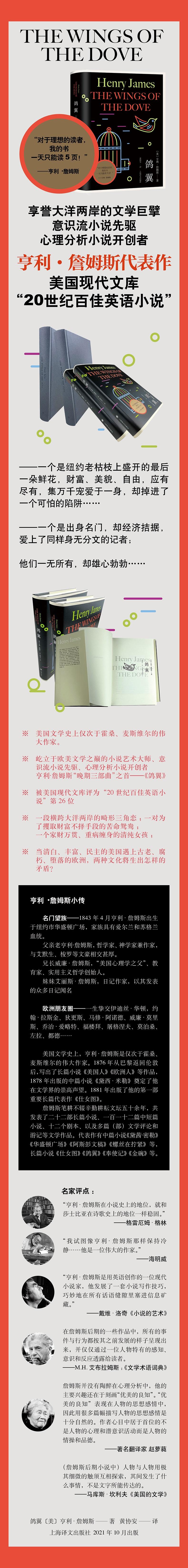 《鸽翼》是亨利·詹姆斯最受争议的小说之一,与《奉使记》、《金碗》并列为“最后的三部曲”。这三部作品均是亨利·詹姆斯“国际主题”的小说——表现美国人在欧洲的经历和经验的作品,也是詹姆斯小说艺术的巅峰之作。1998年《鸽翼》被现代图书馆评为“20世纪百佳英语小说”第26位。小说讲述了身患绝症而又继承巨额财富的美国女孩米莉在欧洲的爱情旅程。凯特·克罗伊与莫顿·丹什是一对因穷困潦倒而无法结婚的情侣,一次凯特偶然结识了富有的美国女继承人米莉·蒂尔,两人友情渐笃。米莉来到英国后,身边充斥着形形色色之人,有人待她真诚,有人图谋不轨。不久,米莉身患绝症,临终前得知了凯特计划通过丹什骗取她财产的阴谋,米莉留给丹什一笔巨款后去世。
