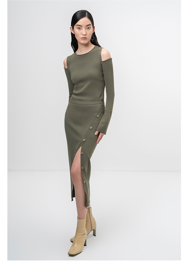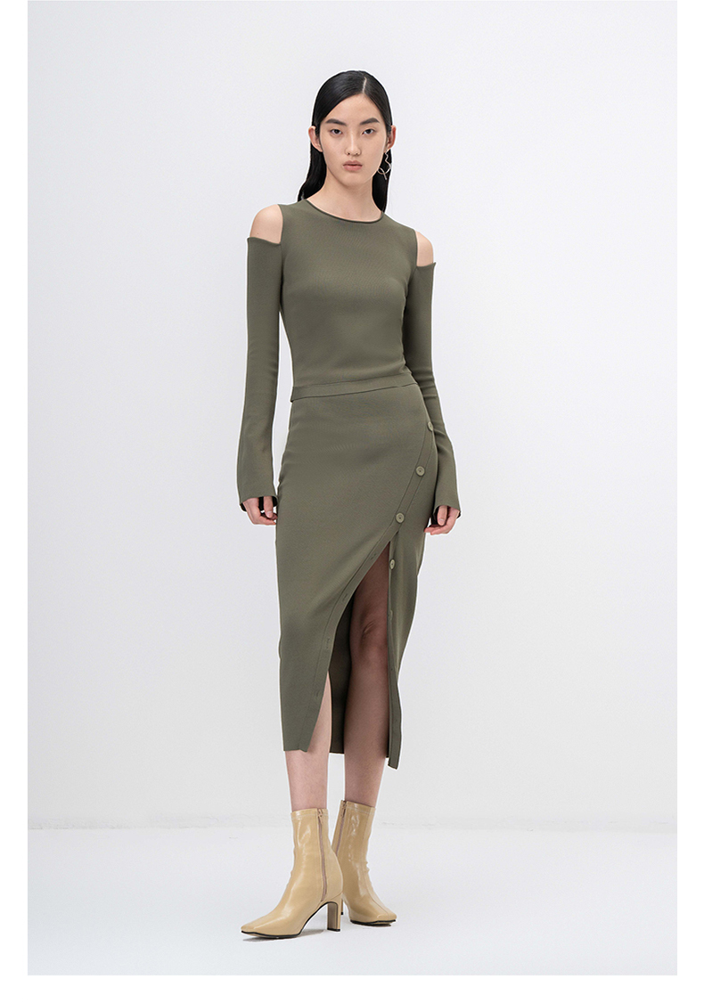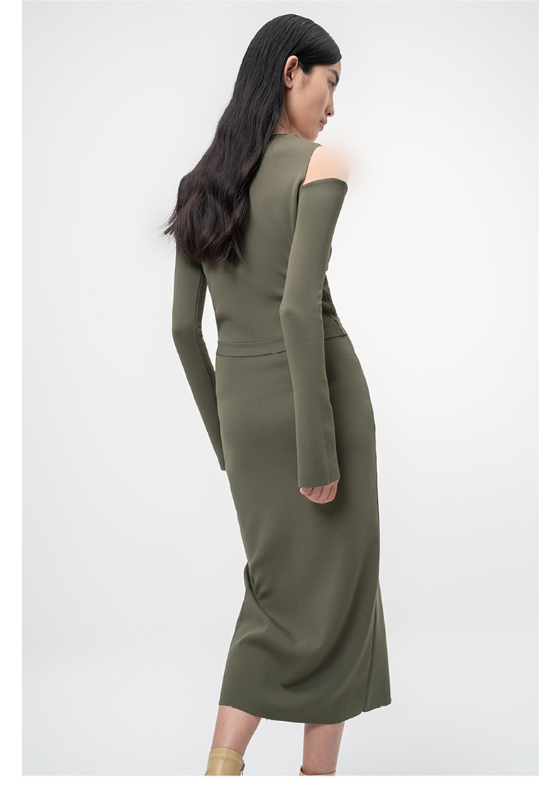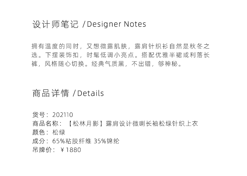 【松林月影】露肩设计微喇长袖松绿针织上衣/202110