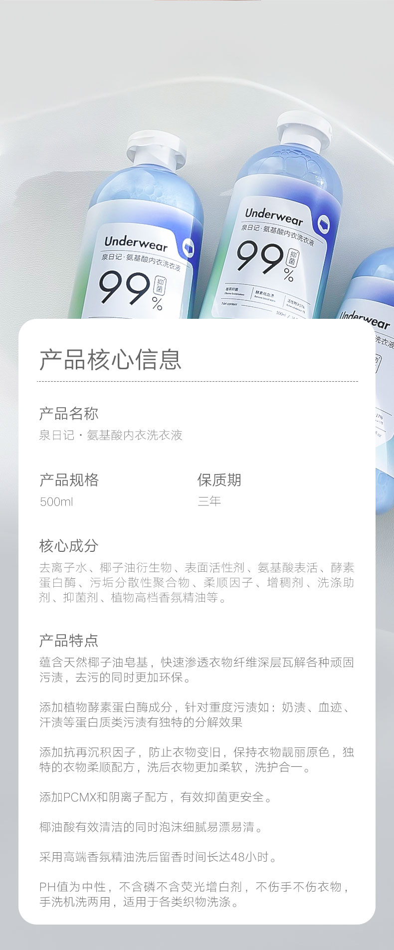 泉日记氨基酸内衣洗衣液 洗内衣内裤专用女士去血渍贴身衣物洁净护衣液 500ml/瓶