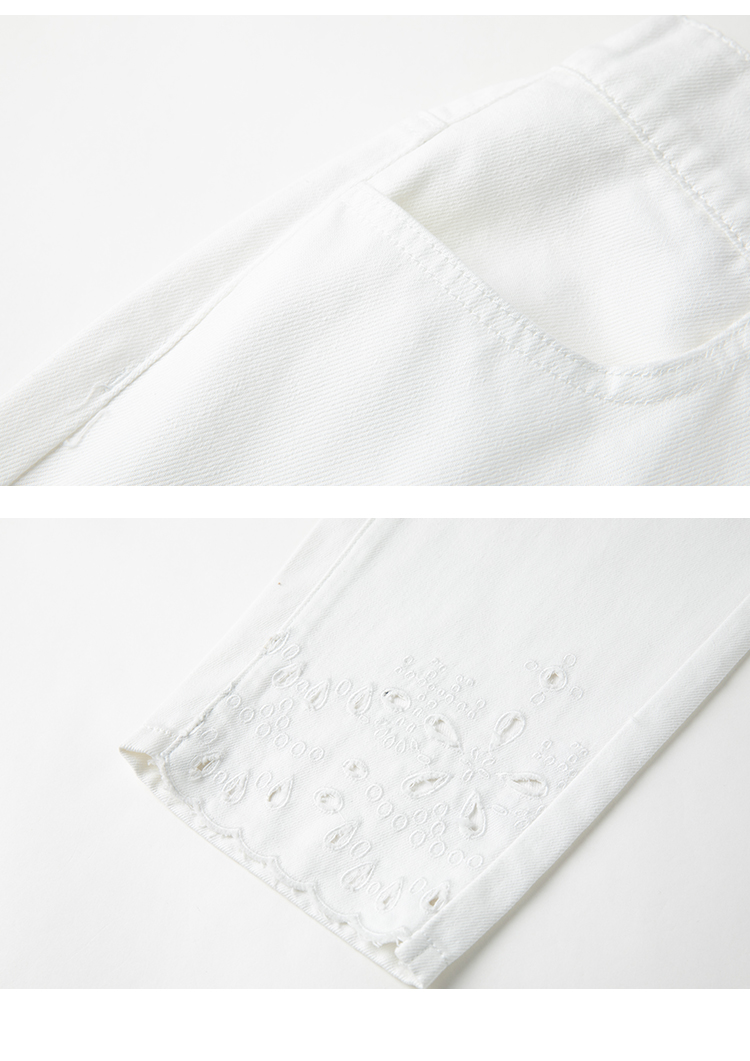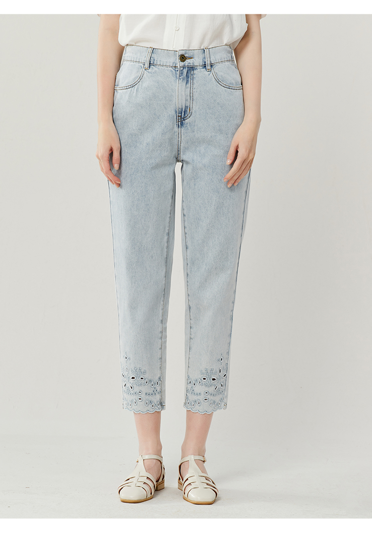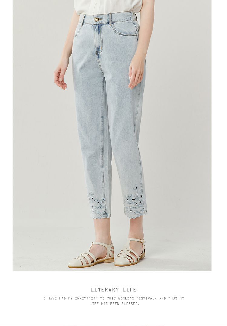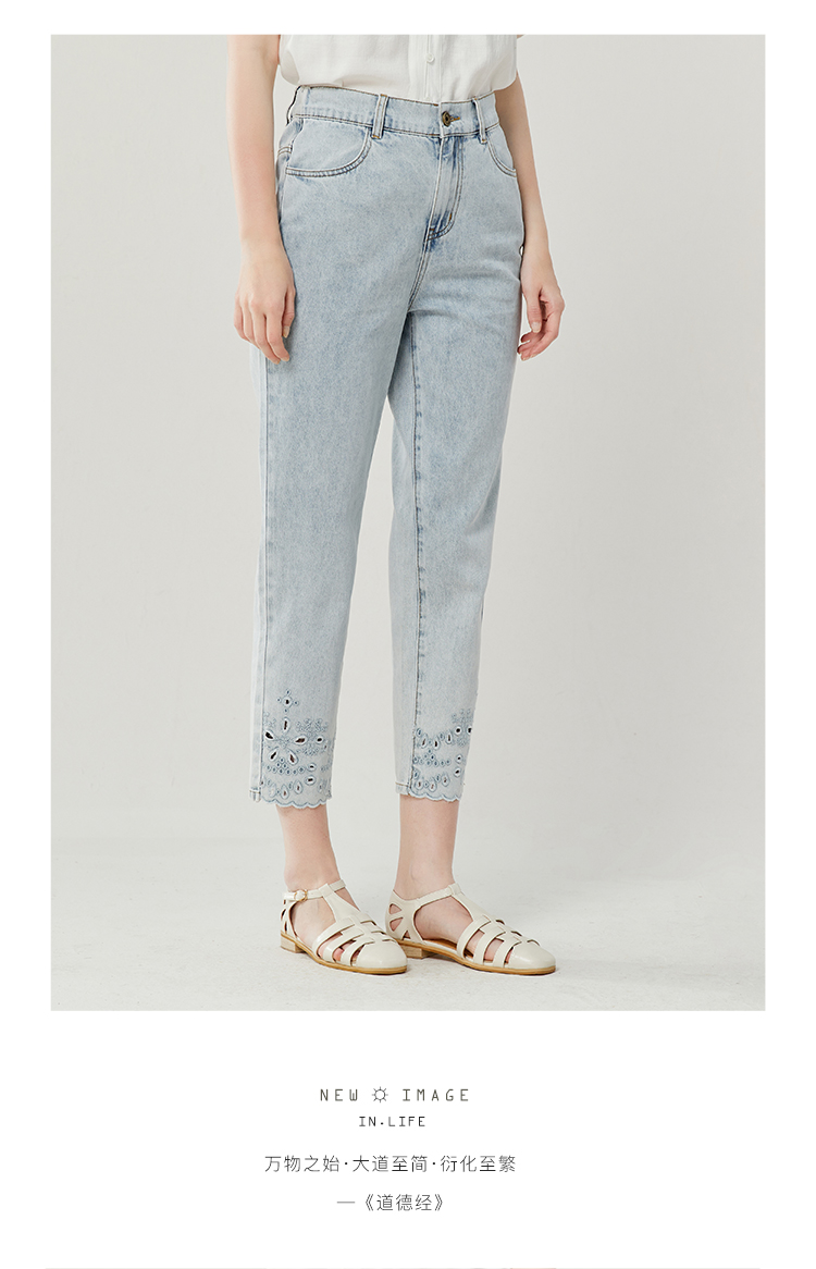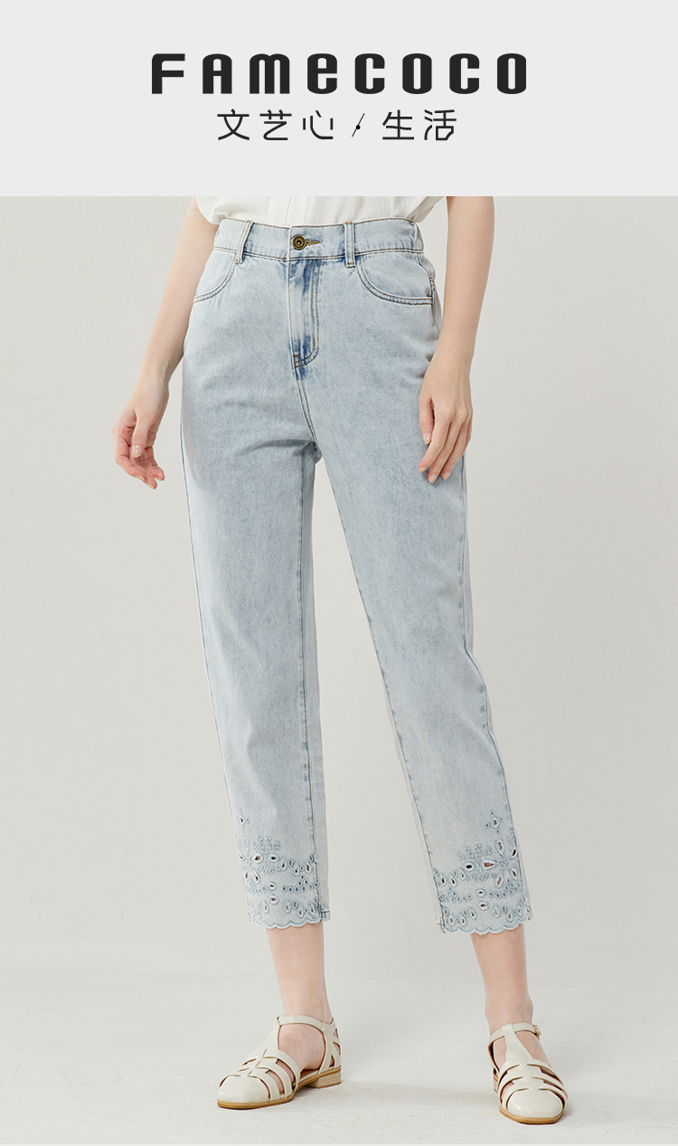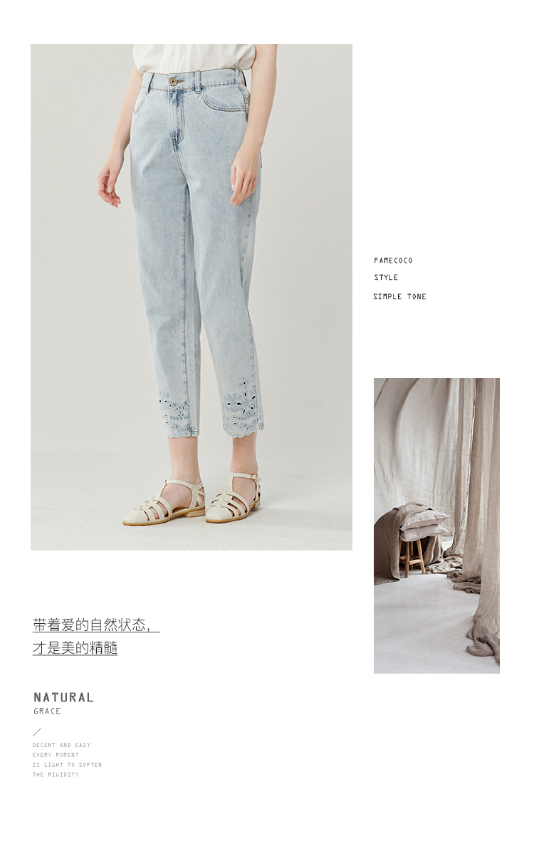 famecoco范可儿纯棉浅色牛仔裤女新款夏季裤脚镂空直筒裤FAB3GA012