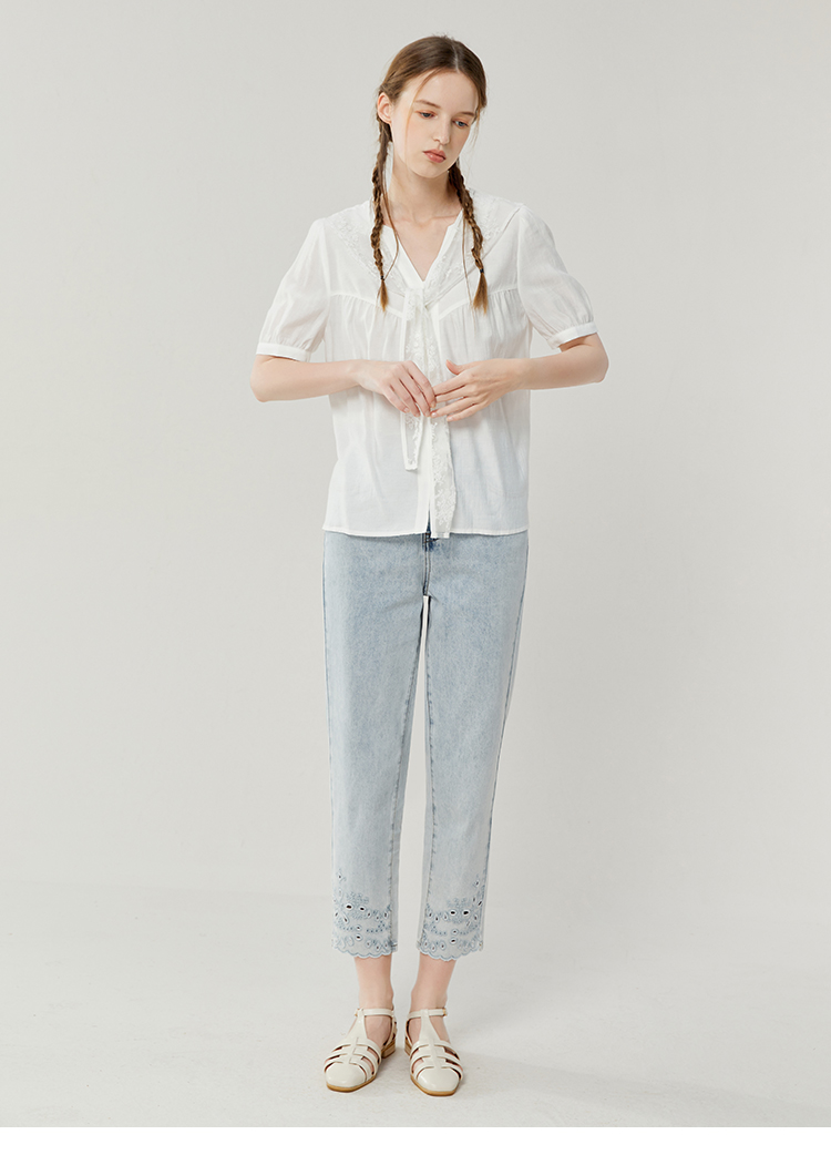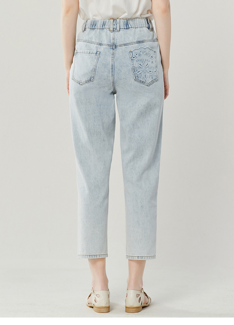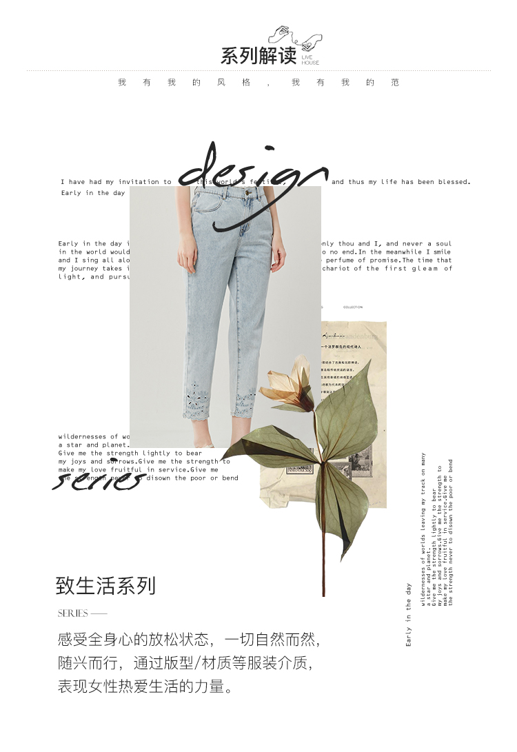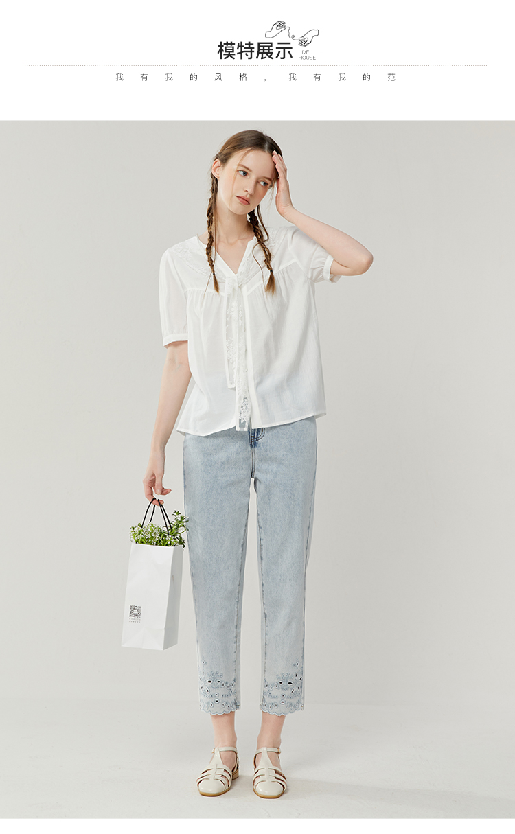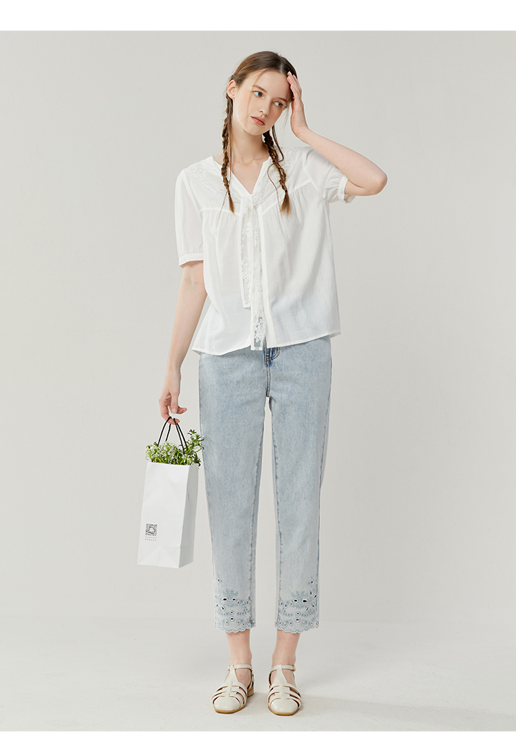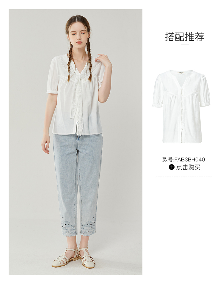 famecoco范可儿纯棉浅色牛仔裤女新款夏季裤脚镂空直筒裤FAB3GA012