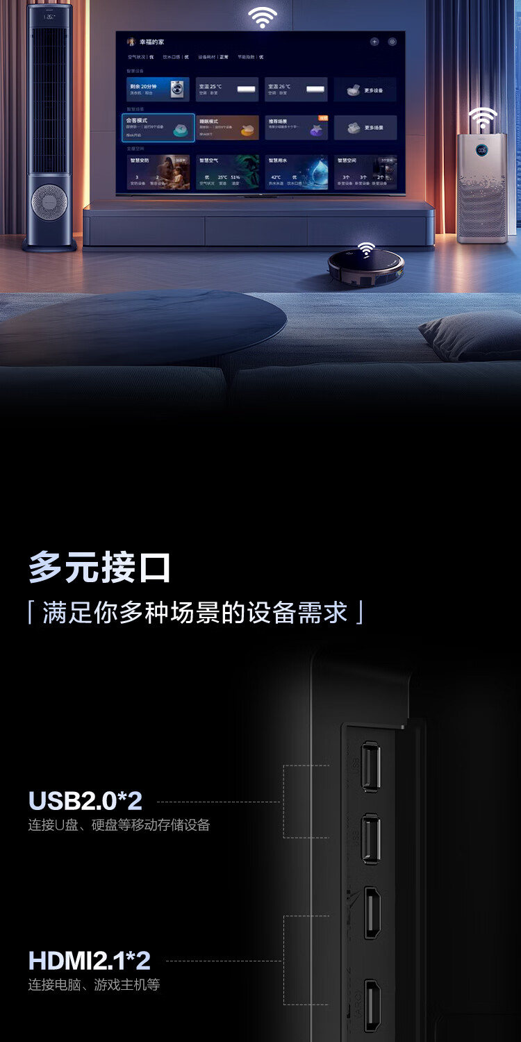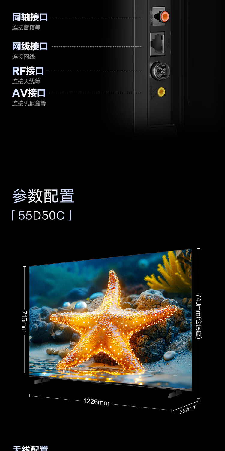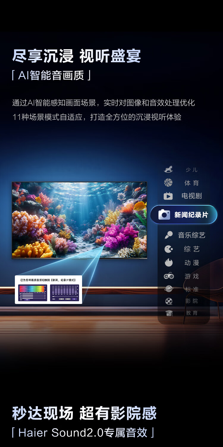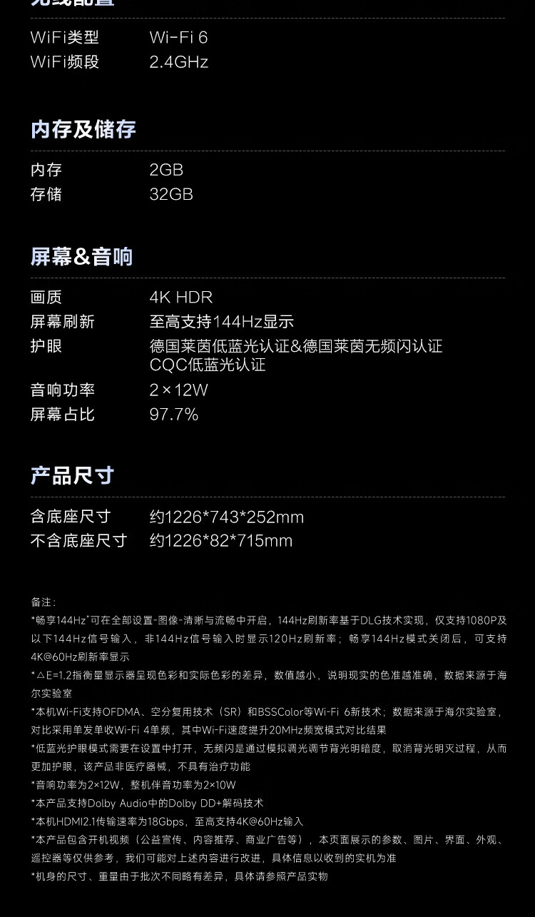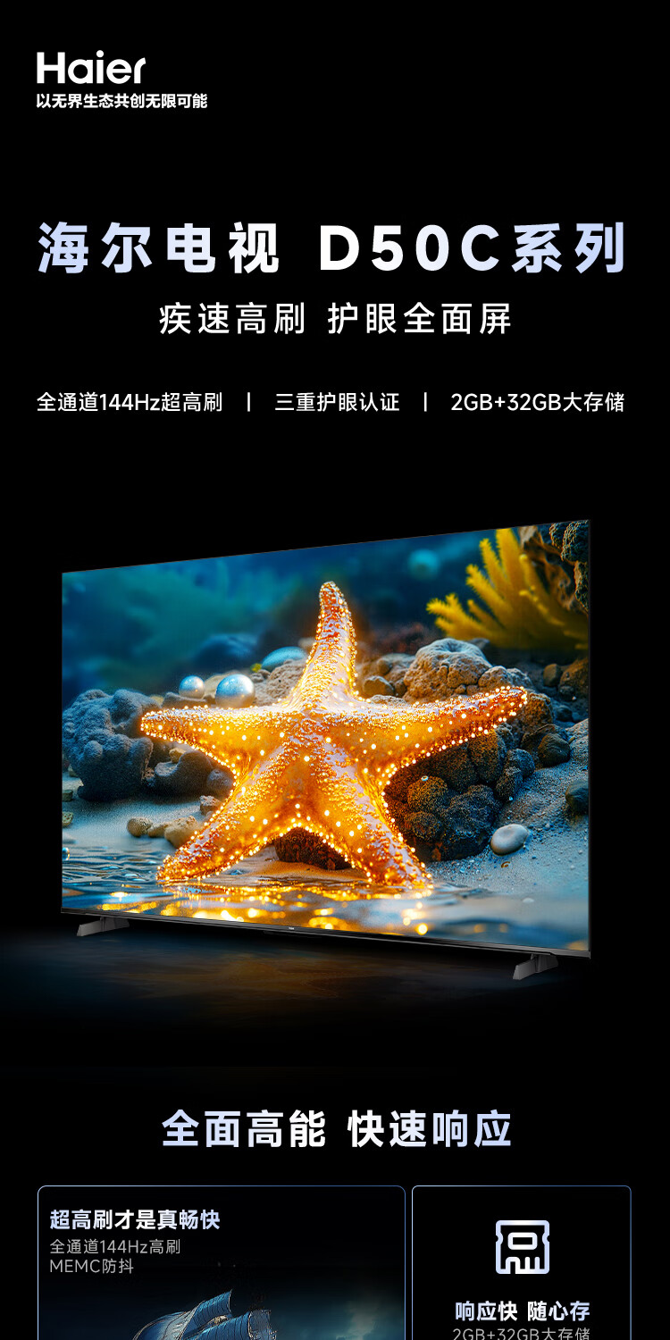 海尔 55英寸 4K超高清 144Hz高刷 高色域全面屏 2+32GB超薄 游戏智能液晶平板电视机 一级能效55D50C