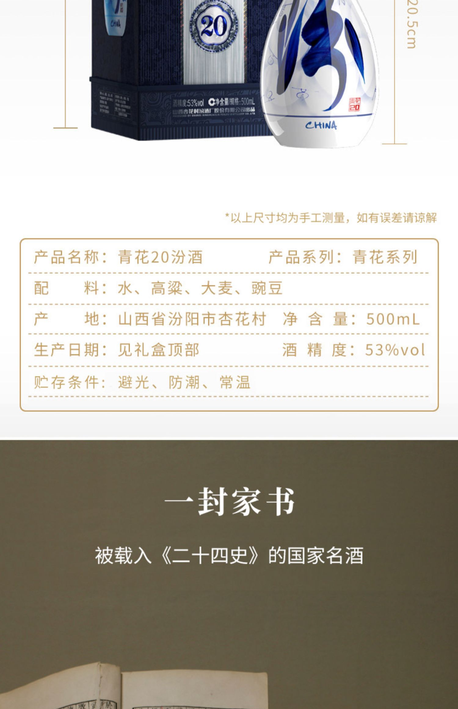 山西汾酒 53度 青花 20汾酒 500mL 单瓶 国产 清香型 高度白酒 包邮