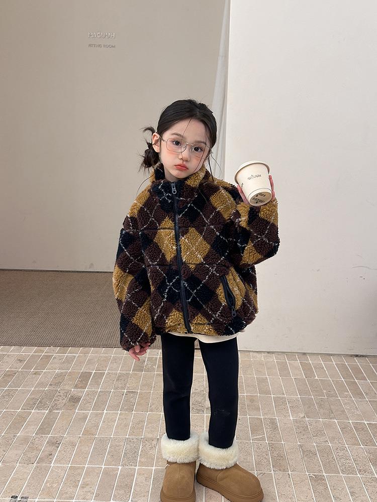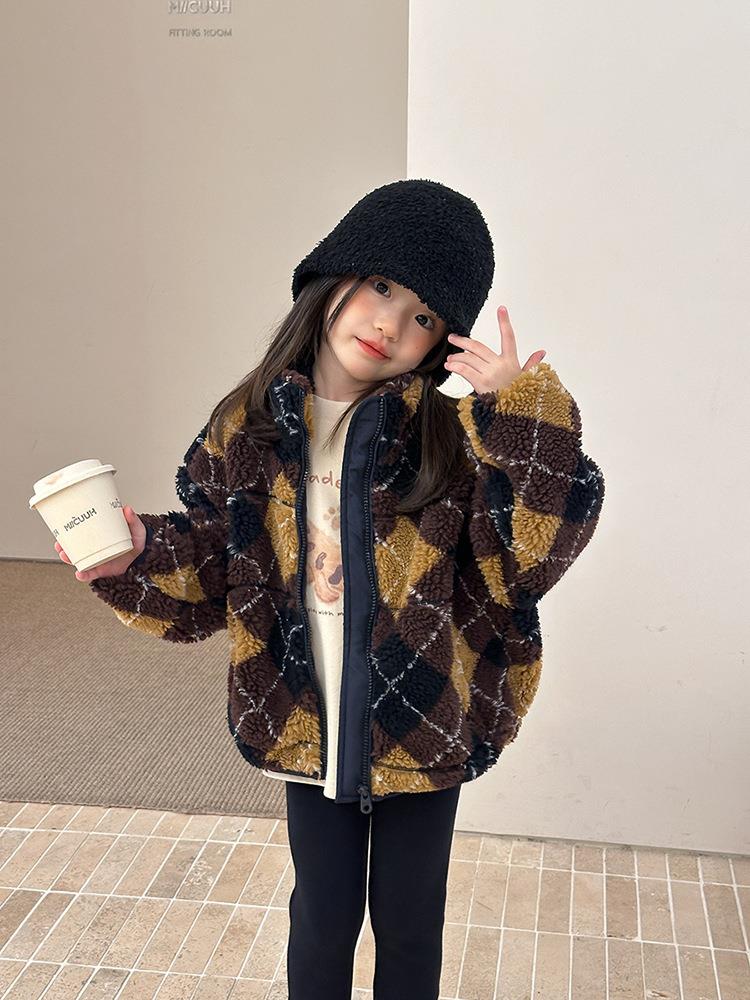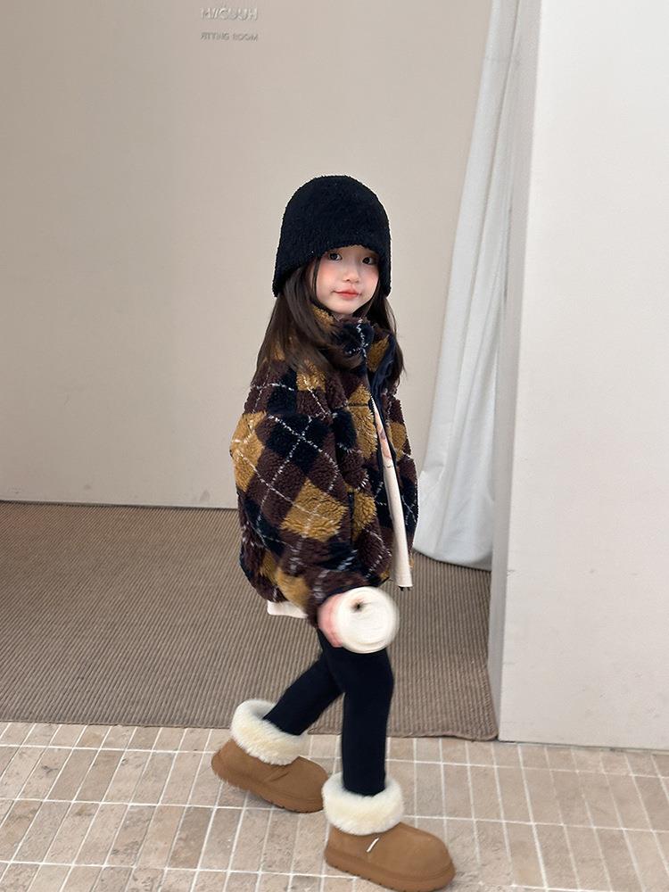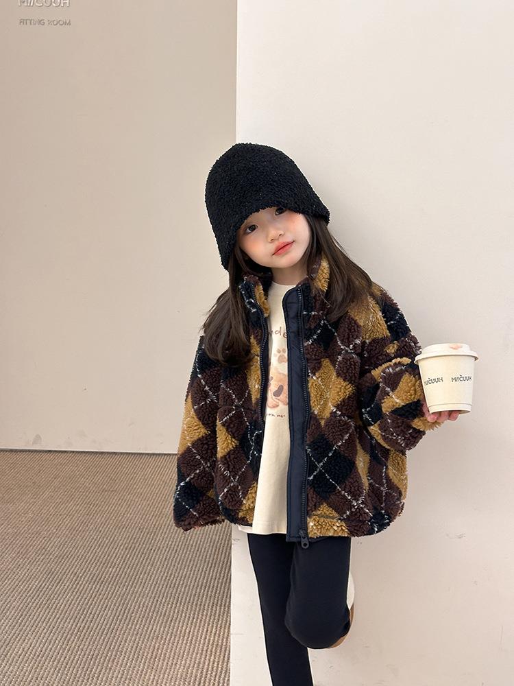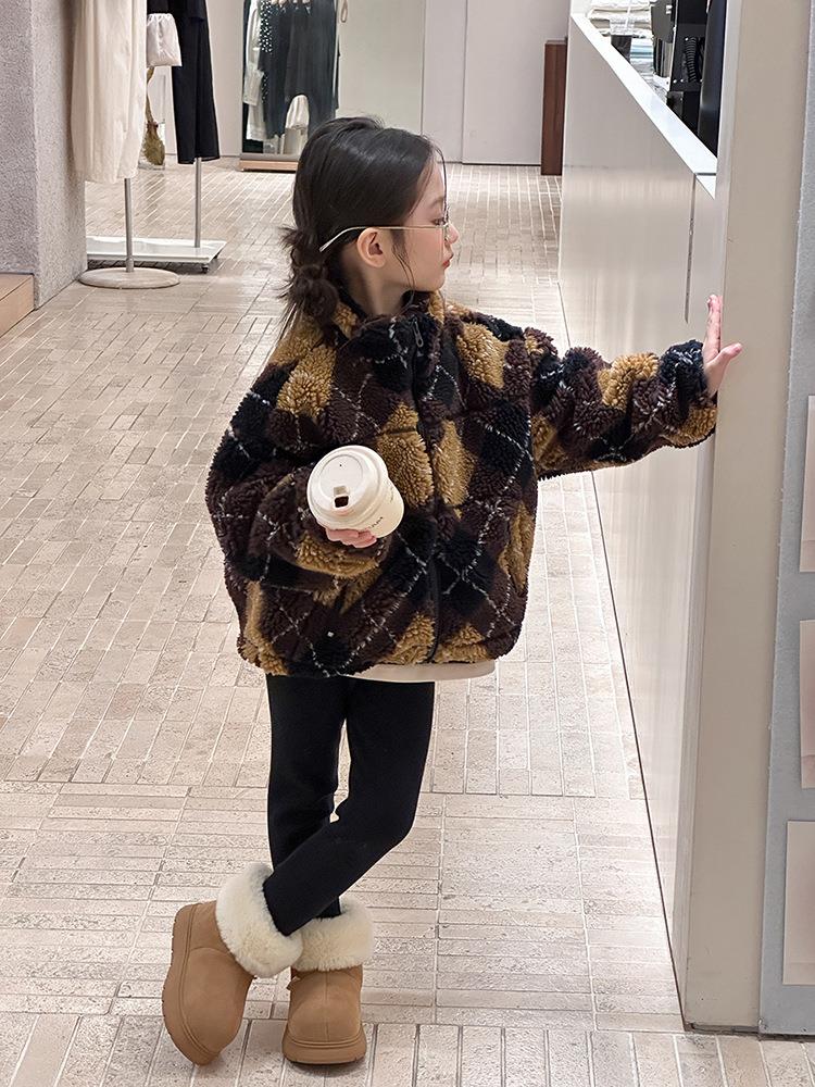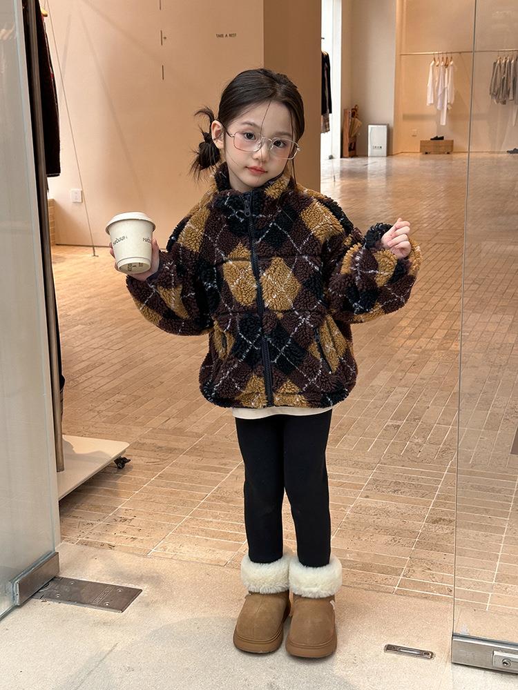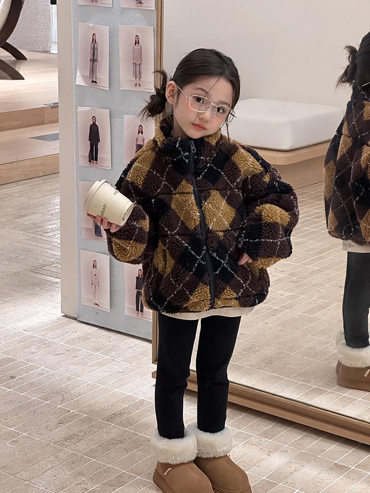 艾摩贝贝儿童复古立领夹克棉衣2025冬女童时髦实穿菱形格棉服外套