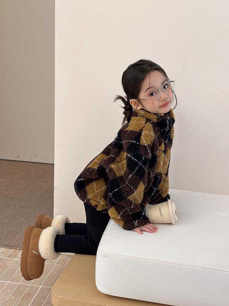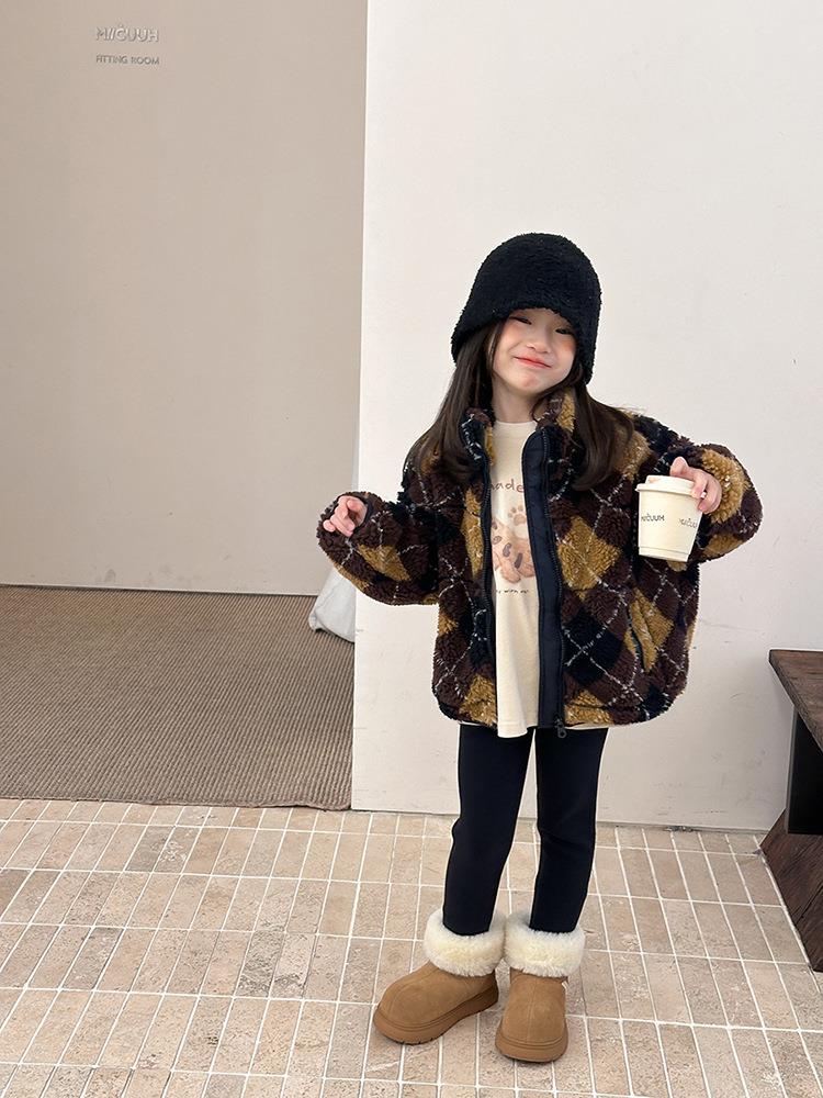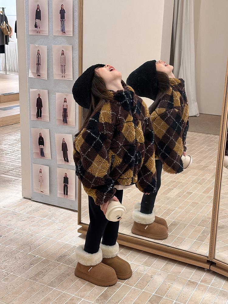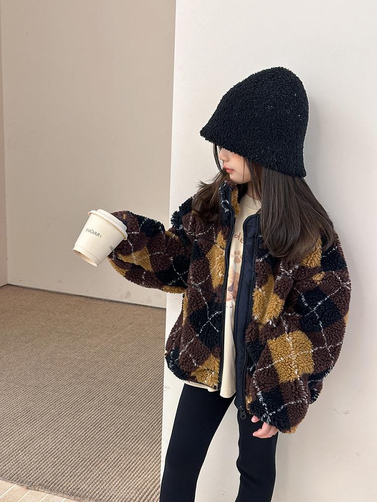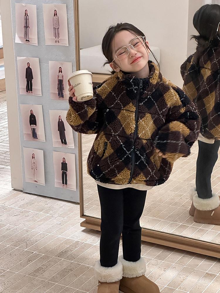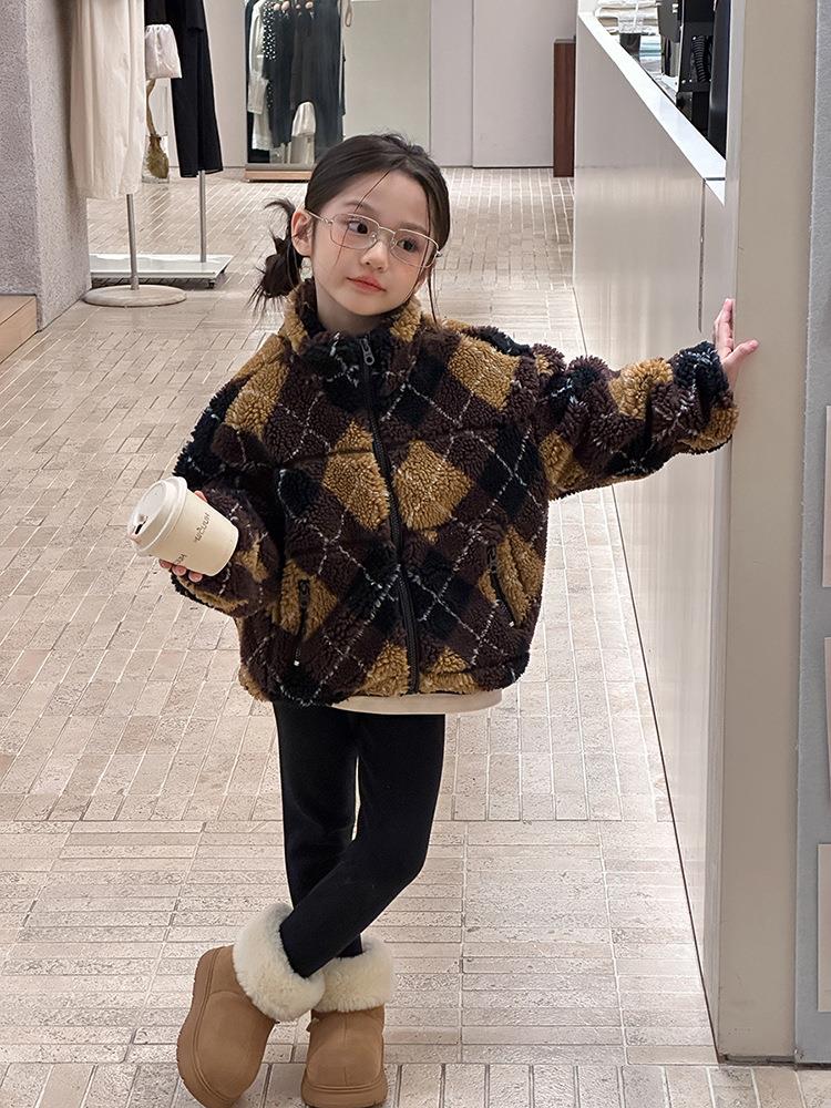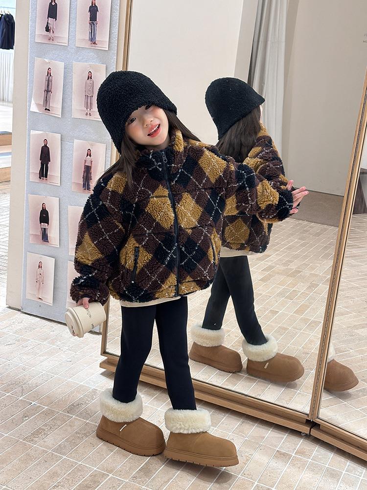 艾摩贝贝儿童复古立领夹克棉衣2025冬女童时髦实穿菱形格棉服外套