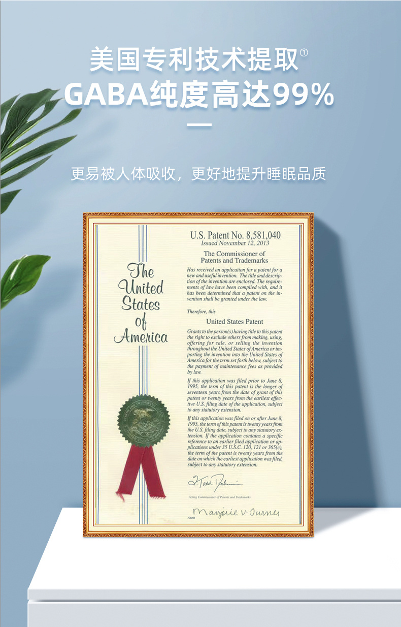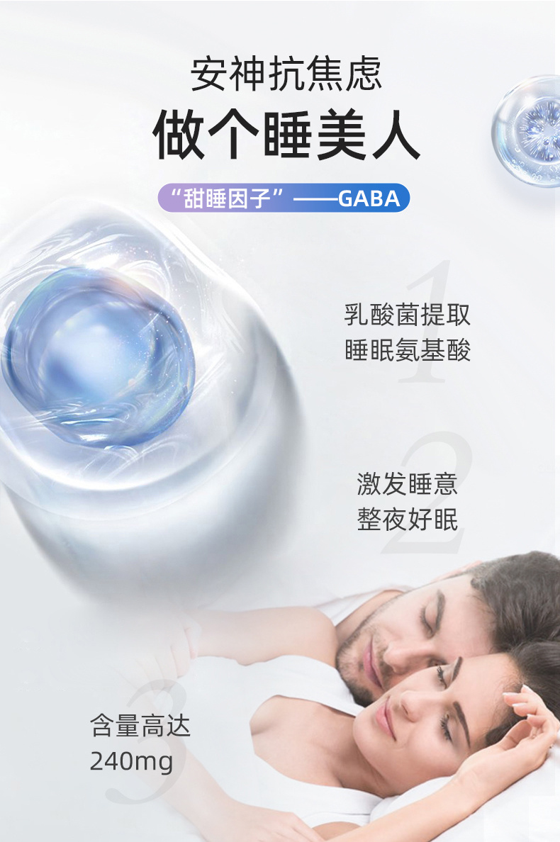 ·“助眠氨基酸”GABA,每瓶含量高达240mg,美国专利技术从乳酸菌中提纯,纯度高达99%,更易被人体吸收,不仅快速激发睡意,还能提升睡眠质量,延长深睡