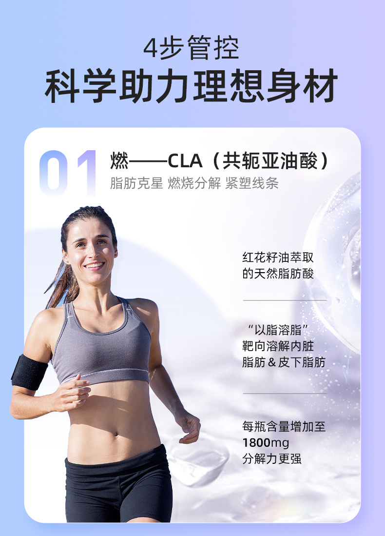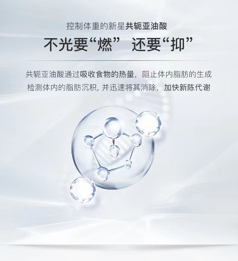 ·“脂肪克星”CLA(共轭亚油酸),欧美健身圈网红,通过吸收食物热量,源头抑制脂肪的合成和堆积,终端加速燃脂,促进体内脂肪分解