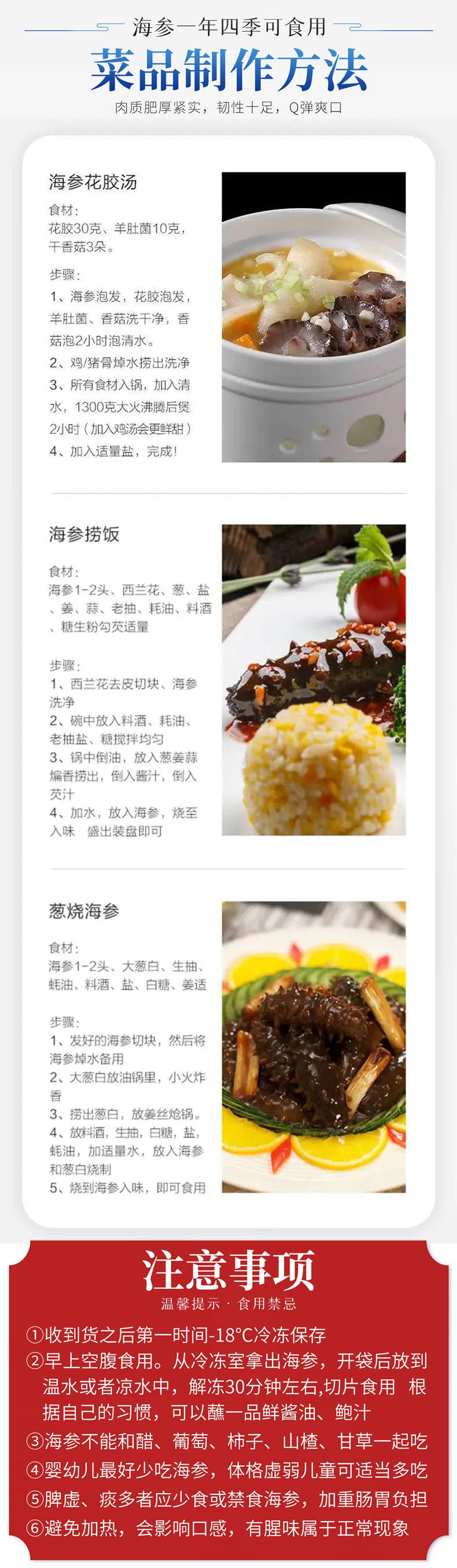 很多观众收到海参后,禁止放在滚烫的开水浸泡或者直接放在开水里煮。咱们优选的这款海参是最传统的水发海参,水发海参最需要注意的事项就是不能二次加热解冻,二次加热会造成海参软榻,不成形,而且严重的影响海参的营养和口感。所以正确的食用方法是提前拿出一颗放在冷藏自然缓动,或者放在凉水或者接近体温的温水浸泡软解后,即可沾鲍汁或者详情页指导的食用菜谱。