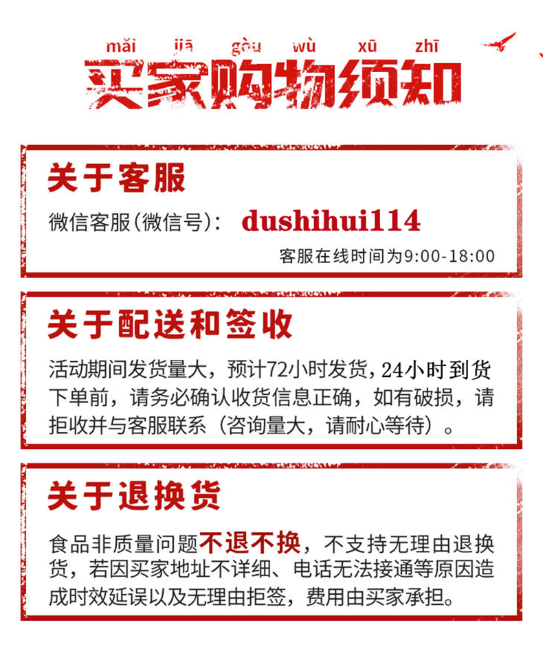 我们很多初次接触即食海参的观众朋友,对于即食海参的口感和物理状态并不太熟悉,有很多自己的理解和想象空间,这种情况我们建议购买1斤体验装,喜欢并适合这个口感再追加复购,咱们都市惠定制的即食海参是零下198摄氏度超低温液氮速冻,包装运输途中的安全和营养不流失。但是我们家庭没有这个超低温的冷冻条件,返货后的海参过度缓化就不能二次销售了,所以即食海参不支持七天无理由退货,请都粉知悉并在购买时一定看好地址和电话,以免时效延误影响即食海参的品质。