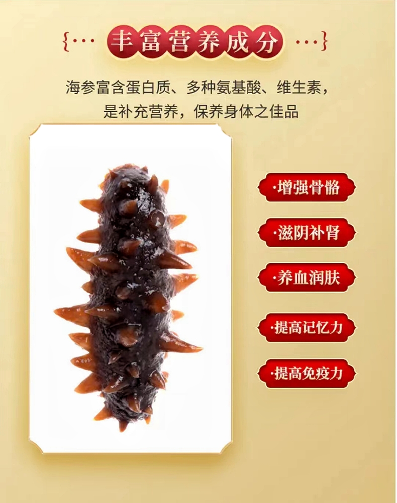 海参肉质软嫩,营养丰富,是典型的高蛋白、低脂肪食物,滋味腴美,风味高雅,是久负盛名的名馔佳肴,是“海味八珍”之一,与燕窝、鲍鱼、鱼翅齐名,在大雅之堂上往往扮演着“压台轴”的角色,被视作为中餐的灵魂之一。