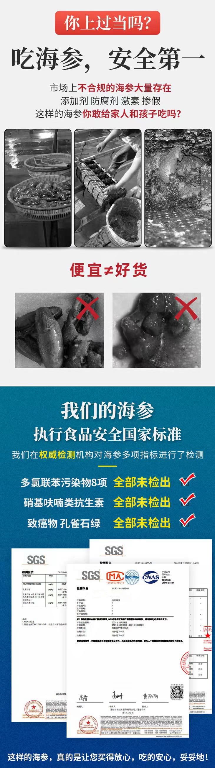 (上图)5年参龄即食海参个头也很大,受到生长年限营养,色泽不如自营6年的,很多都市惠老观众之前一直购买6年参龄的不要买错,这款并不是自营6年的自营海参。