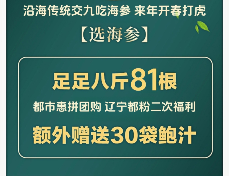 辽宁的观众朋友们,购买这款5年优选即食海参,一定选择拼团购买,这是都市惠给辽粉的一份隐形福利。您在上午6点到晚上23:59之间拼团下单,几乎都能成功,这期间有很多进入商城拼团的老观众,您只要选择拼团付款,系统会主动通知意向拼团的其他观众,一般十几分钟即可成团,不成团也会按照您支付路径自动退款,大家伙可以放心拼团。