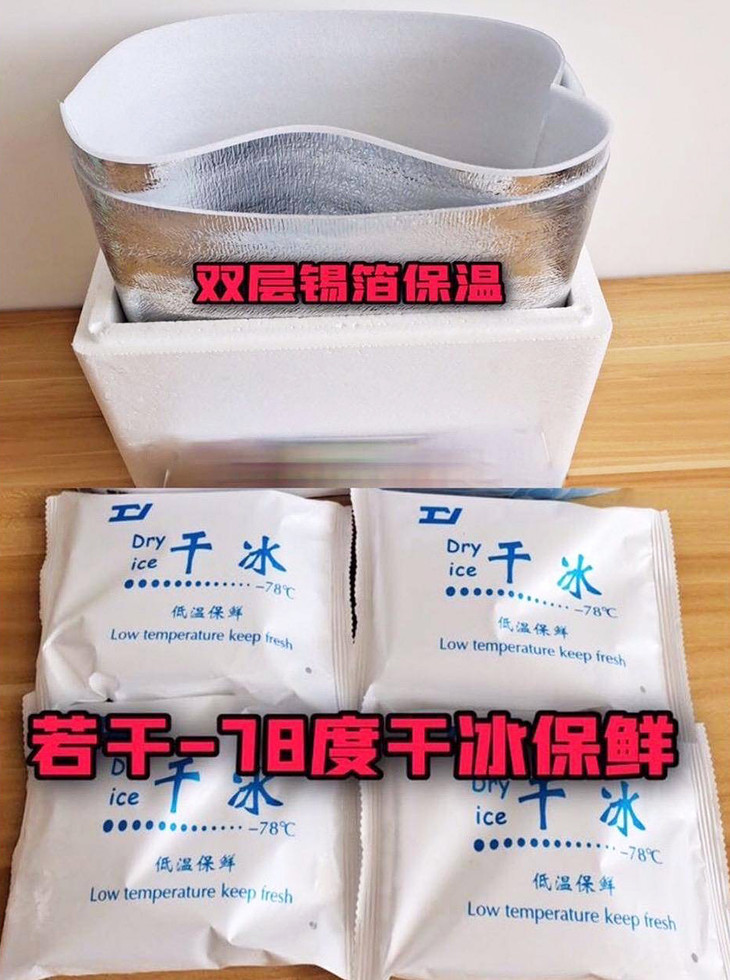 装入 海鲜专用加厚加密加卡槽的保温箱,零下78℃干冰发货 ,根据气温足量添加,保鲜措施很放心!