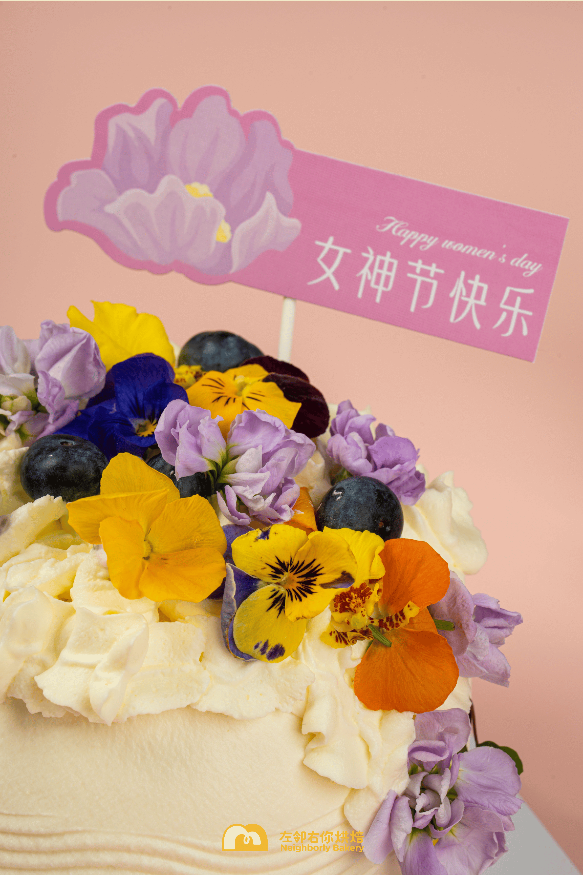 蛋糕外层是淡淡的黄色,上面装饰着可食用性花朵,是春日的明媚,也是女性的温柔坚韧