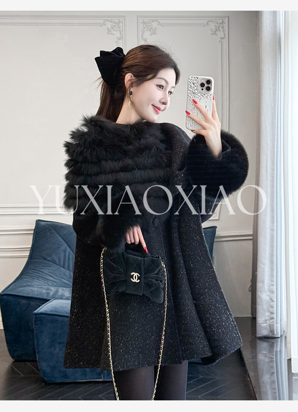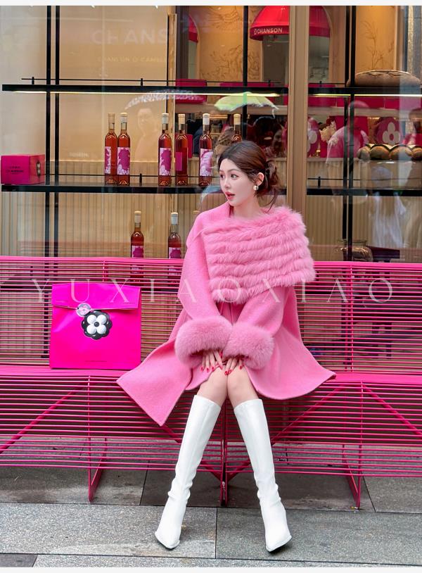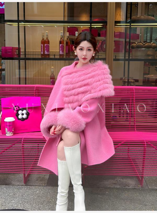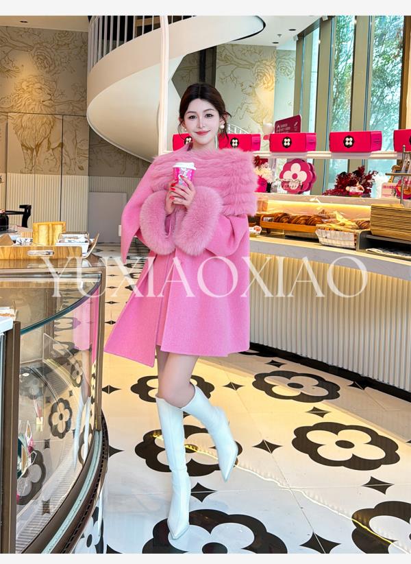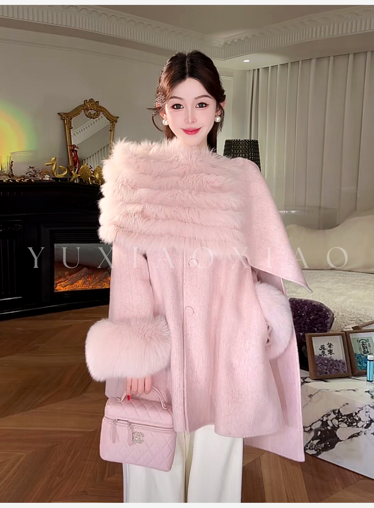 余潇潇【粉黛倾城】羊驼毛绵羊毛肌理感可拆卸狐狸毛披肩袖子大衣