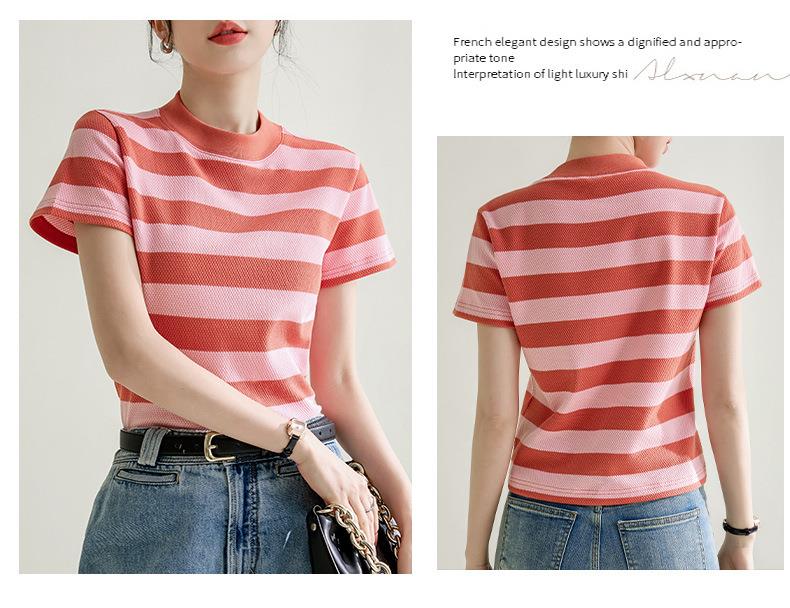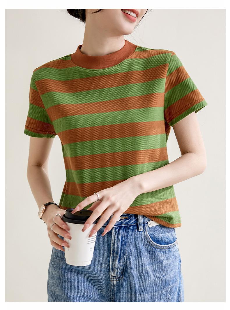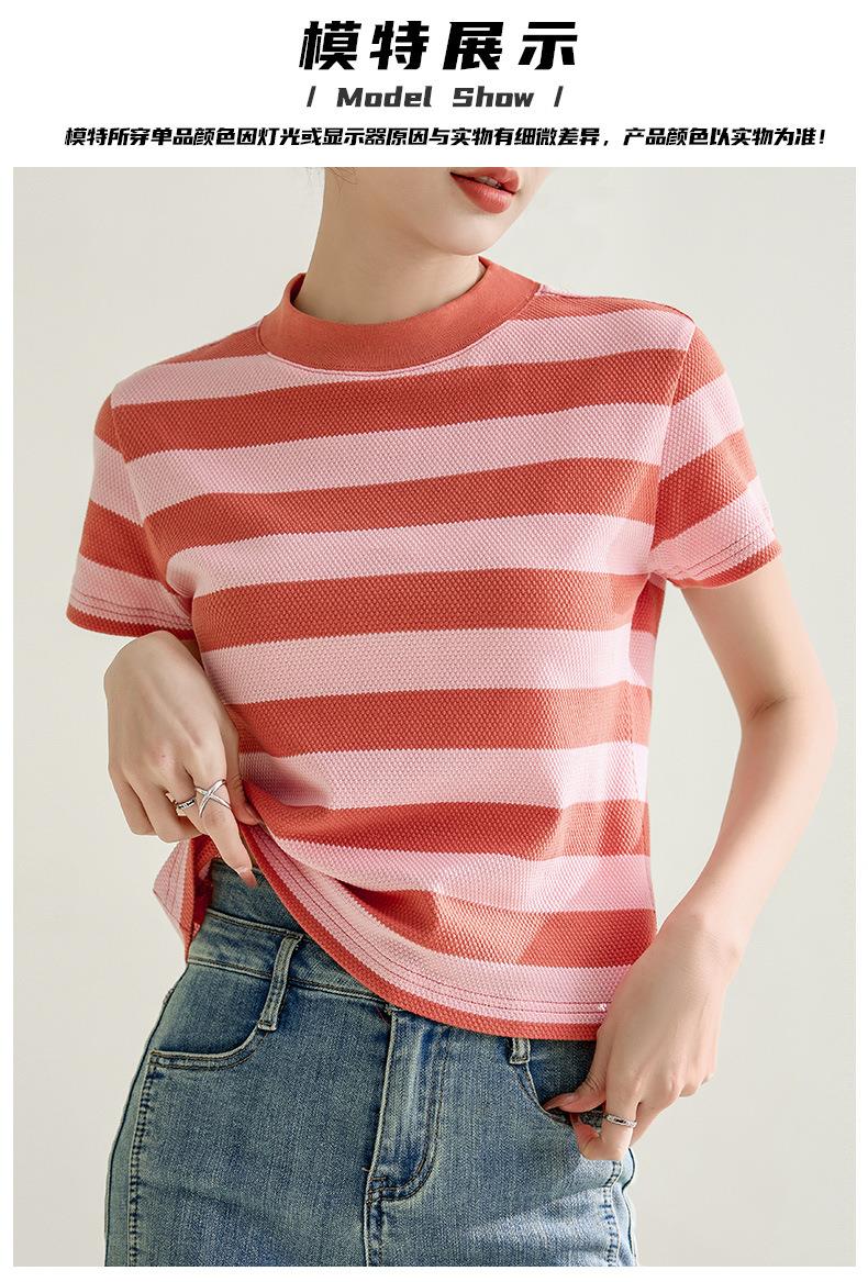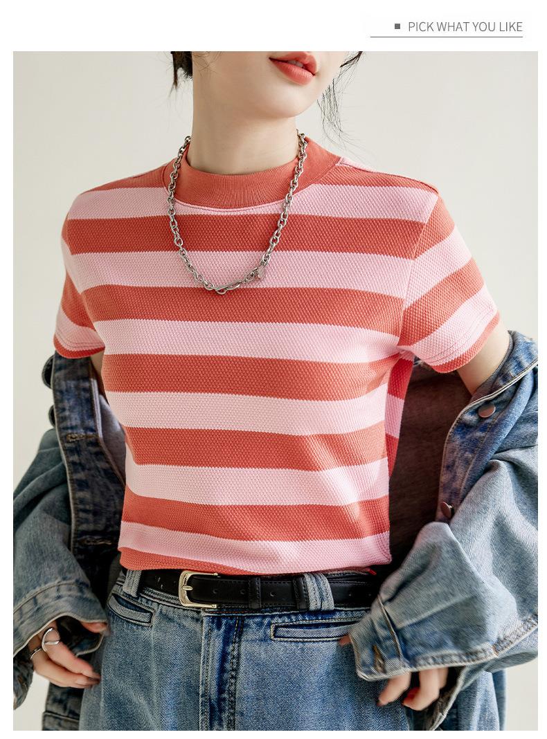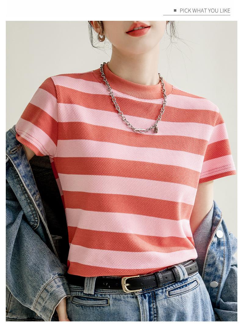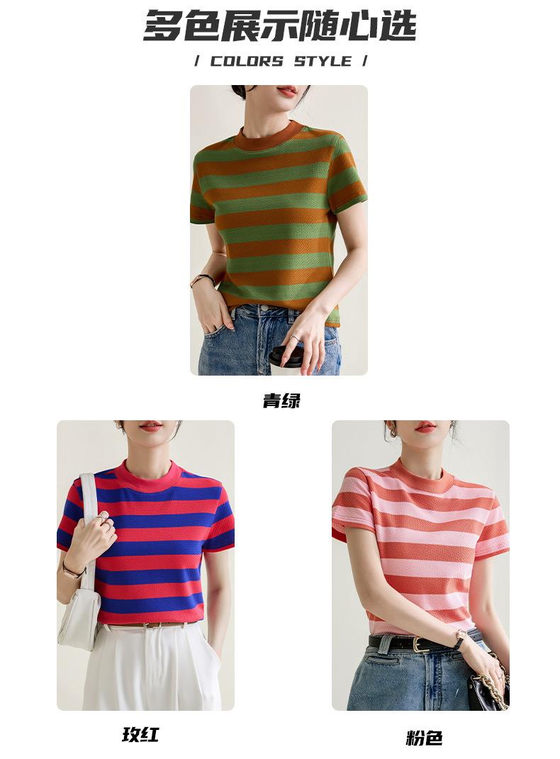韩系多巴胺肌理感圆领短袖棉T恤女2024春夏新款条纹撞色小众上衣