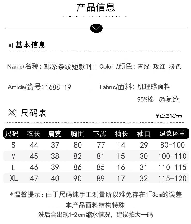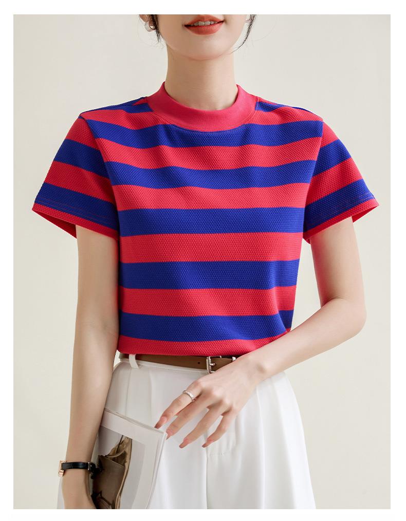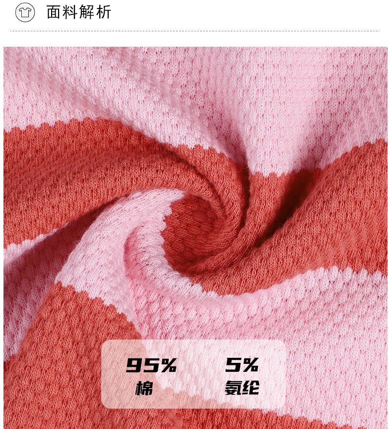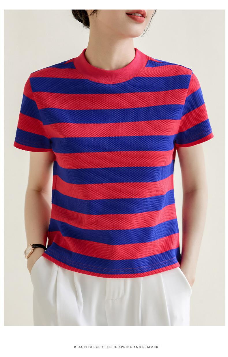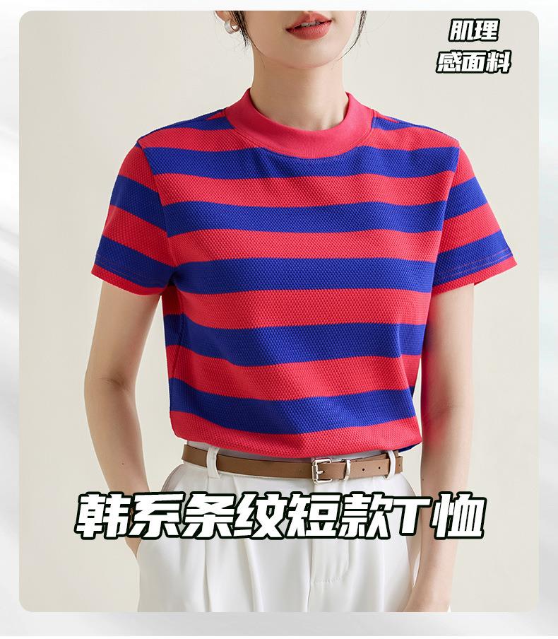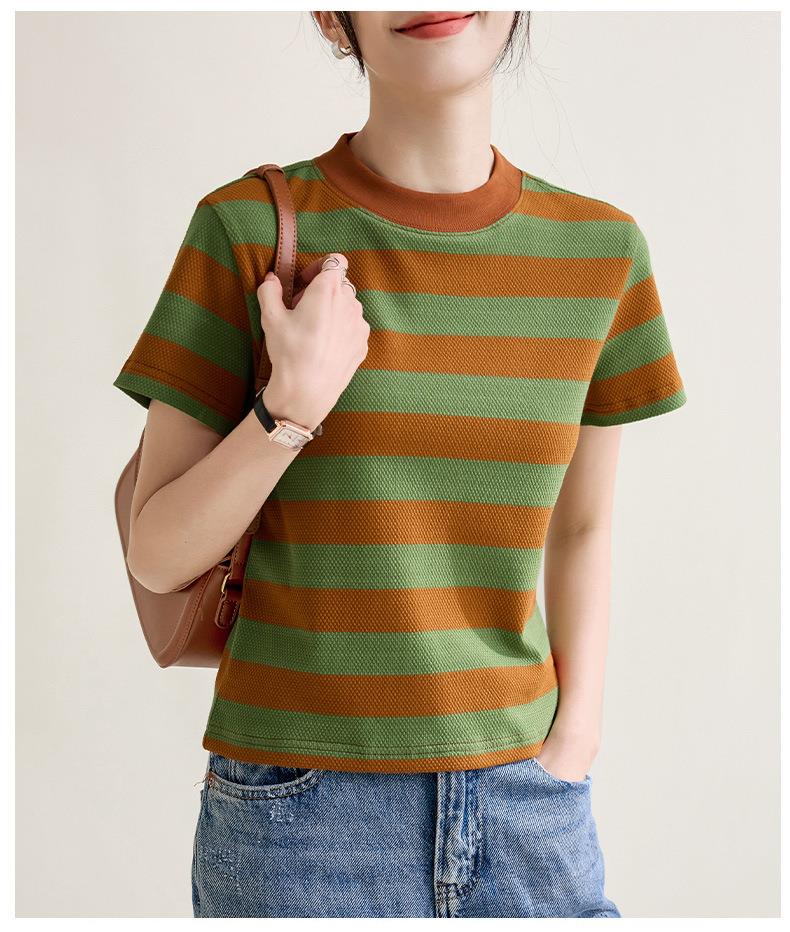 韩系多巴胺肌理感圆领短袖棉T恤女2024春夏新款条纹撞色小众上衣