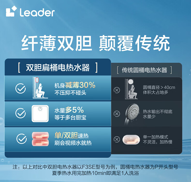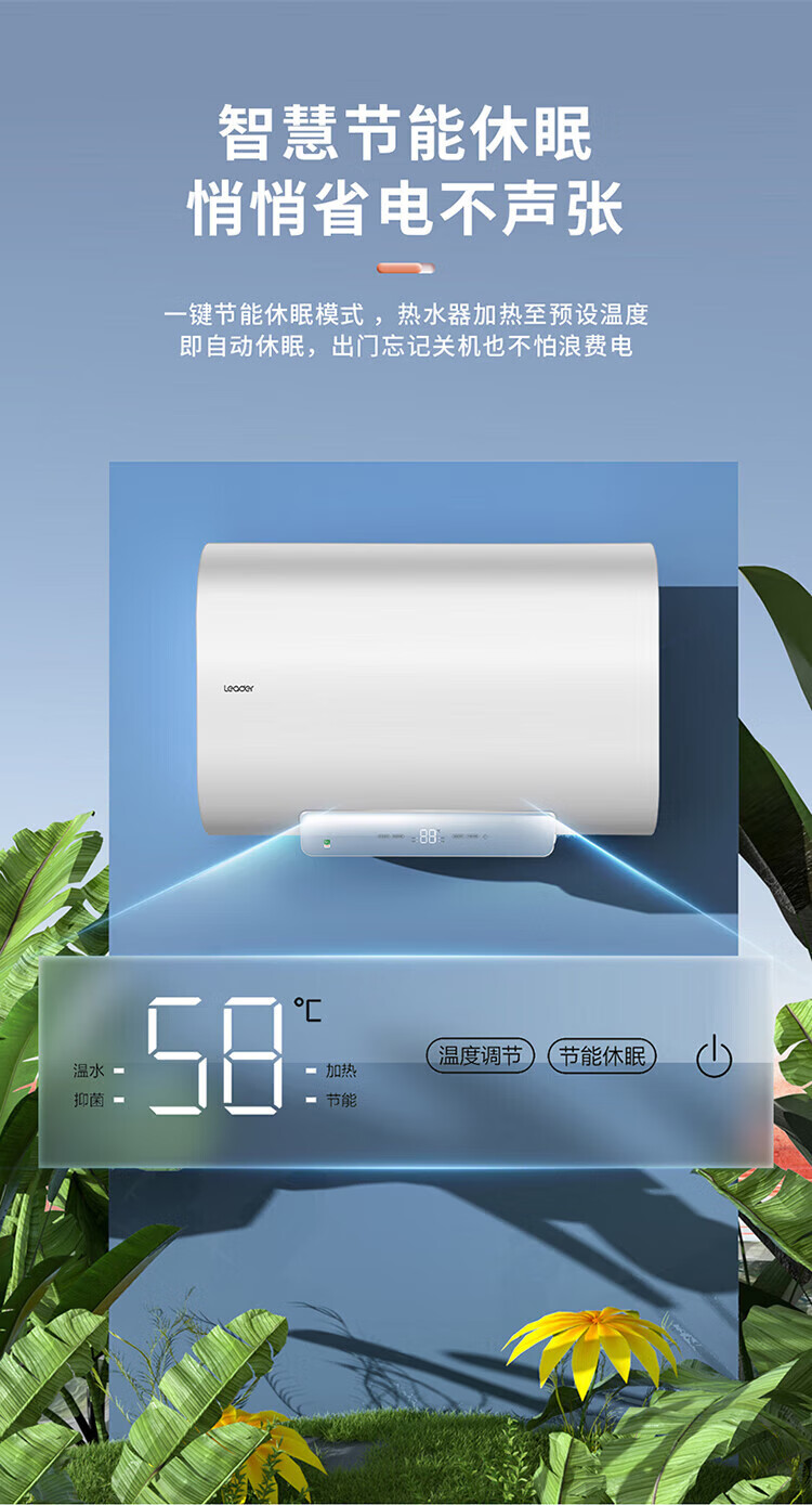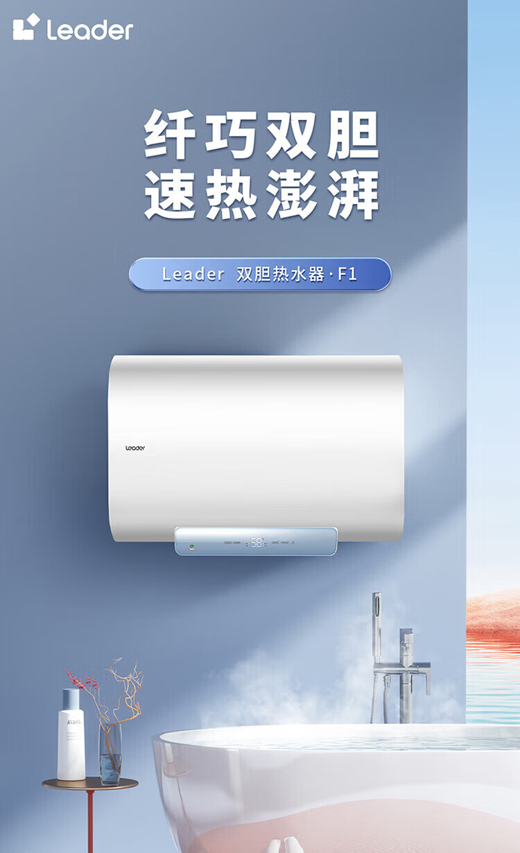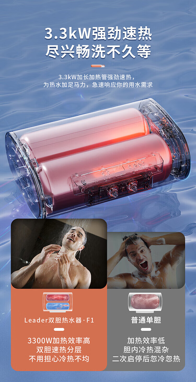 海尔(Haier)智家出品Leader系列热水器电热水器扁桶【F1】双胆速热储水式纤薄小型免费测量镁棒免更换 50L 3300W 约70%顾客选择镁棒免换F1