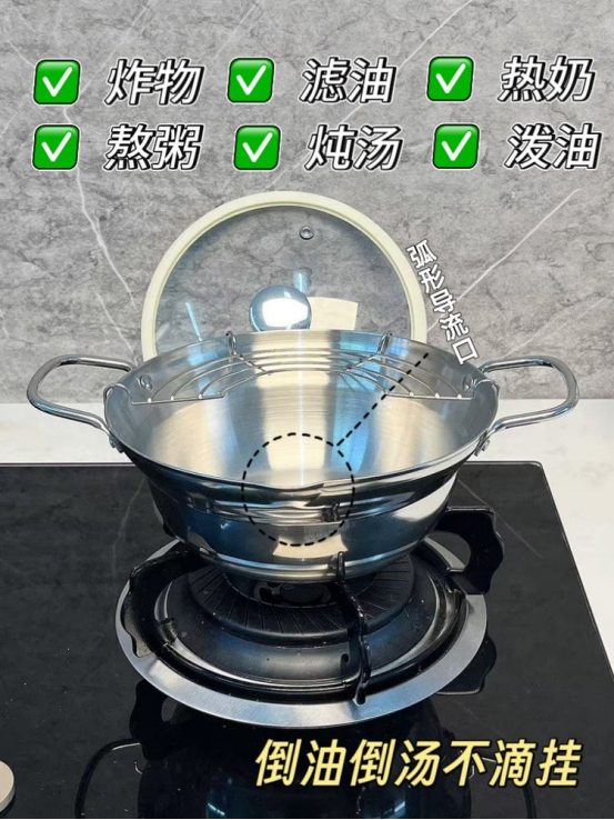 ✅『厨房洁癖狂喜!带导流口的锅才是真·解放双手🥣』 锅沿专门做了弧形导流槽,边缘还打磨得很光滑。不管是熬完汤倒到碗里,还是炸完东西倒废油到油桶,对准容器轻轻一斜——油和汤就顺着导流口稳稳流进去,一滴都不会挂在锅身!以前用普通锅倒完,锅边、灶台、手上全是油渍,光擦就花5分钟,现在倒完直接冲一下锅边就干净,厨房洁癖表示极度舒适✨ 🔴倒废油:炸完鸡米花的废油超难处理,普通锅倒的时候总洒在油桶外面,黏糊糊还招虫子。这口锅的倒流口刚好对准油桶口,慢慢倒进去全程零滴落,废油回收得整整齐齐,连油桶外壁都干干净净💦 🔴分汤不洒:家里来人煮汤要分碗,以前用没倒流口的锅,倒到最后总会“收不住”,汤洒在碗沿上。这个导流口控量超精准,从大碗到小碗都能稳得住,分完每碗汤都干干净净,端上桌都有面子 🔴 熬粥倒出:熬完小米粥想盛到碗里,普通锅一斜就容易把锅底的糊渣带出来。这口锅的导流口位置设计得超合理,刚好避开锅底,倒出来的粥细腻无渣,连宝宝辅食粥都能放心盛☑️