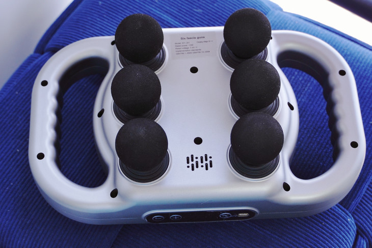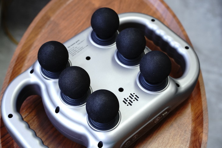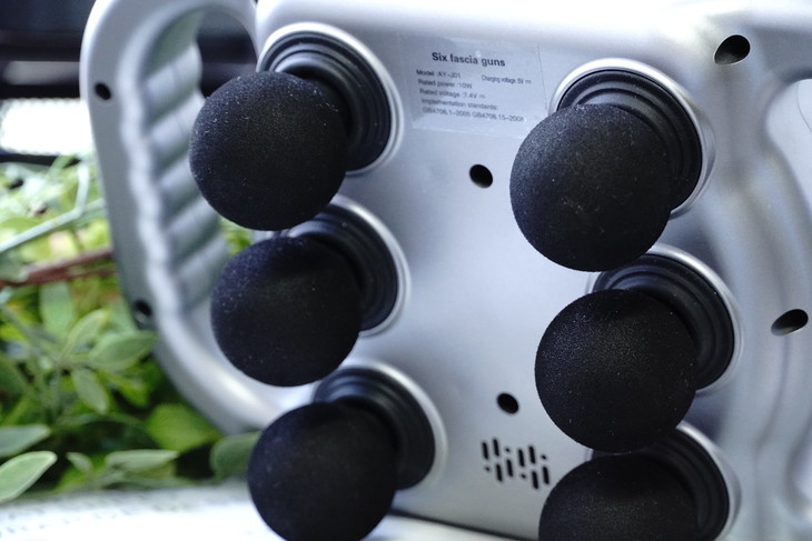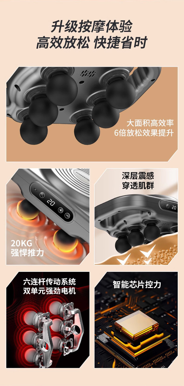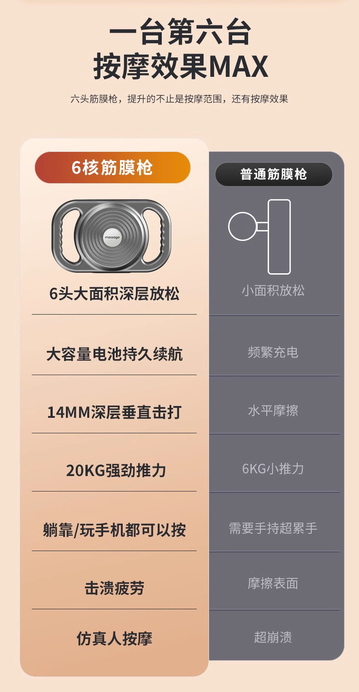 6个按摩头强就强在效率上 一个按摩头的筋膜枪需要自上而下或从左到右 一下一下的顺着走 六头筋膜枪 慢一点 走一遍 就算按摩完成