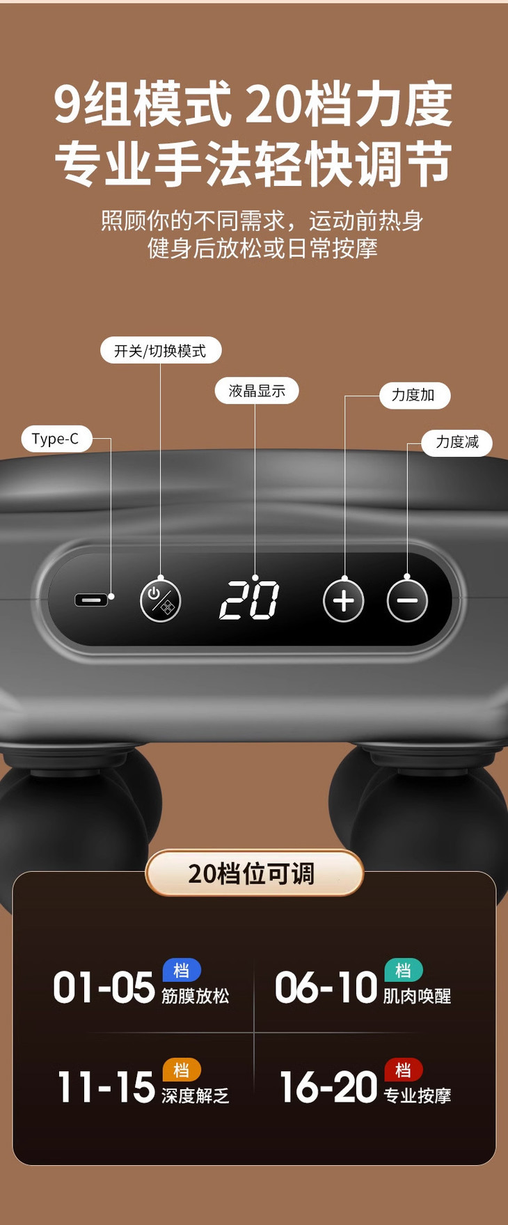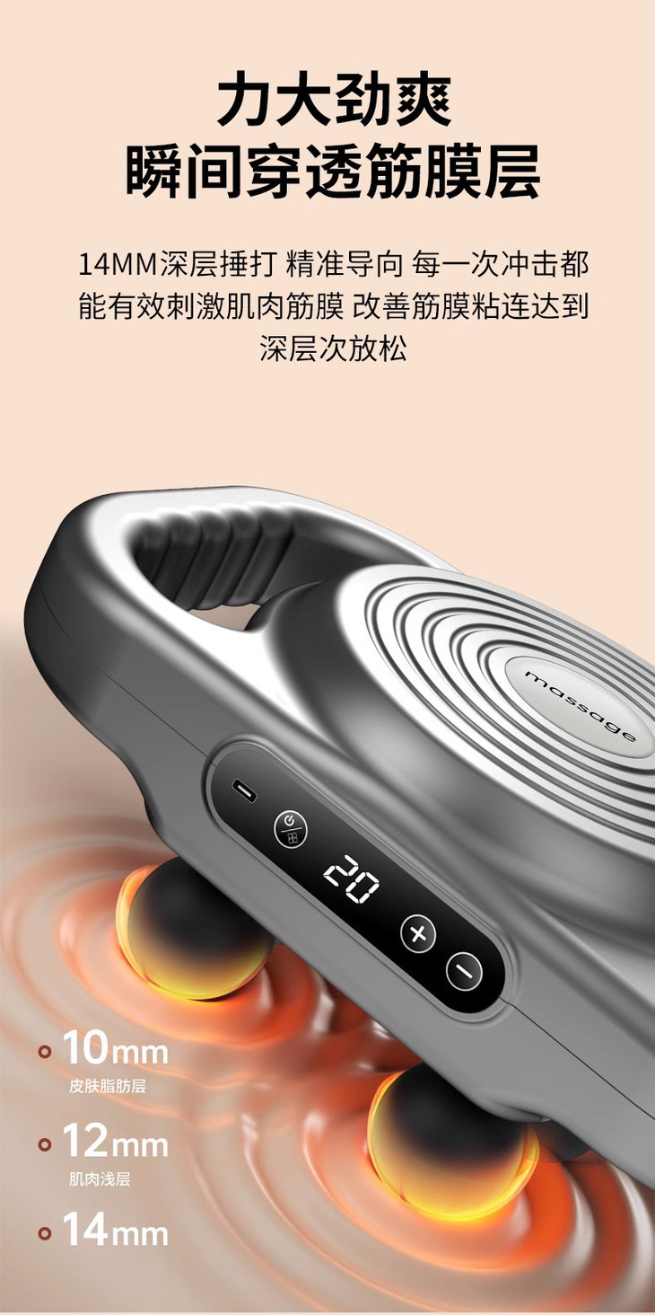 ✅ 一键启动,多档力度可调节,智能调节输出 ✅ 多处肌肉软组织可用,强劲动力长续航 ✅ 14mm深层垂直击打,20KG强劲推力