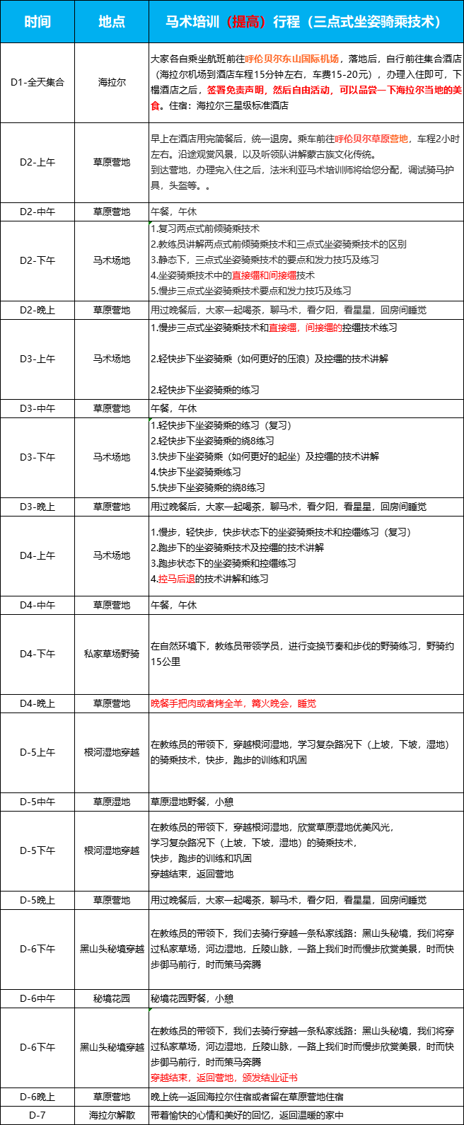3.如有家属跟随整个提高营行程,我方提供吃,住(住宿默认为营地星空双床房),短途交通,家属不参加马术培训,那么家属的费用为:4000元/人 /5.6.9.10月份 5000元/7.8月份(单住需补房差)
