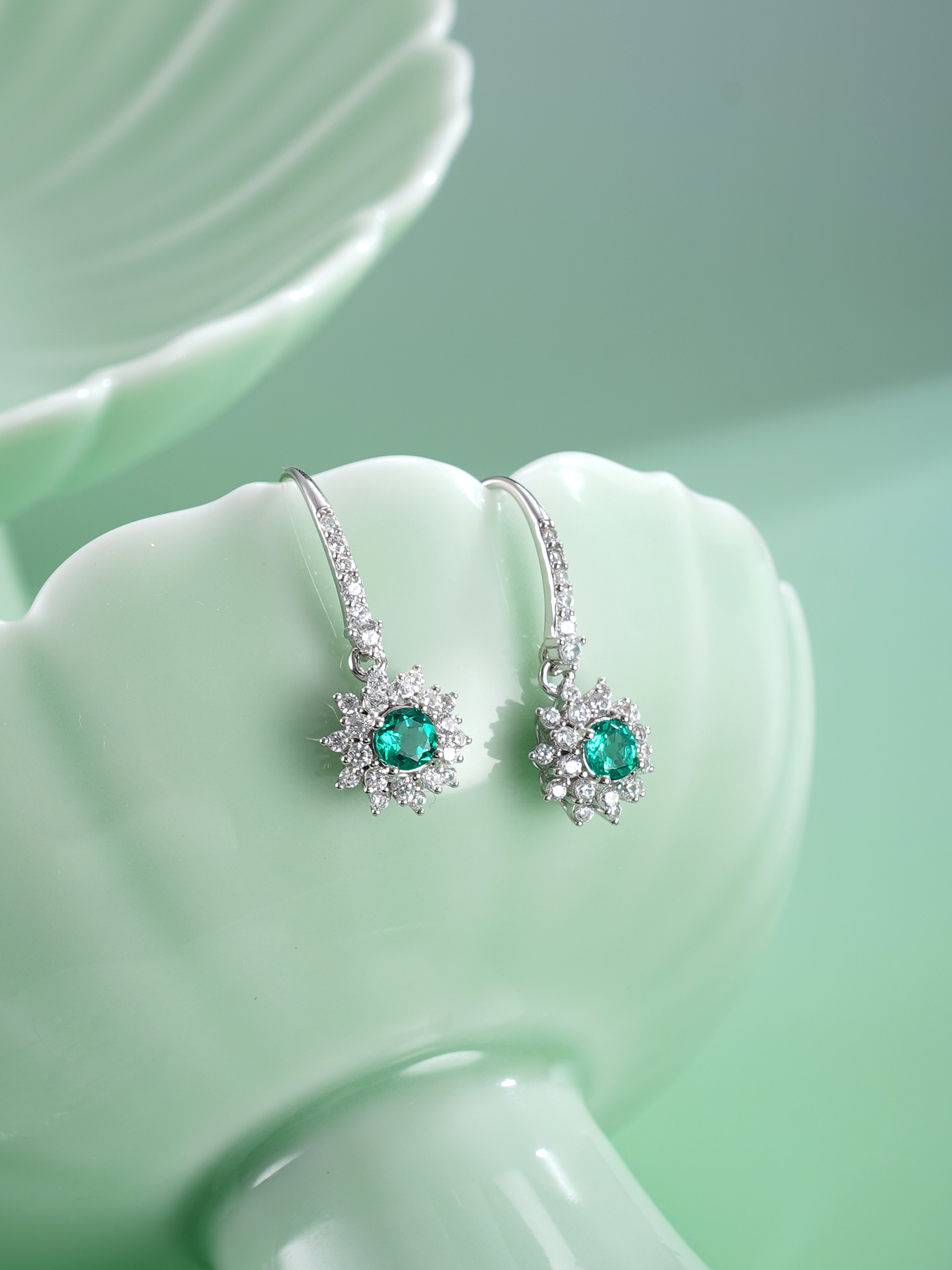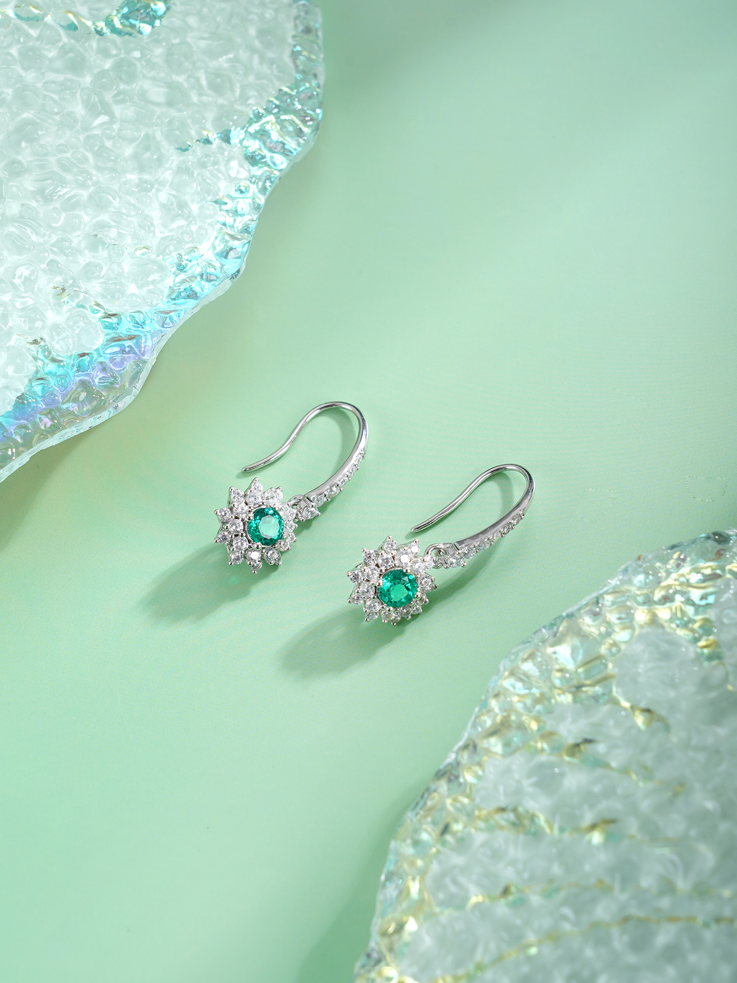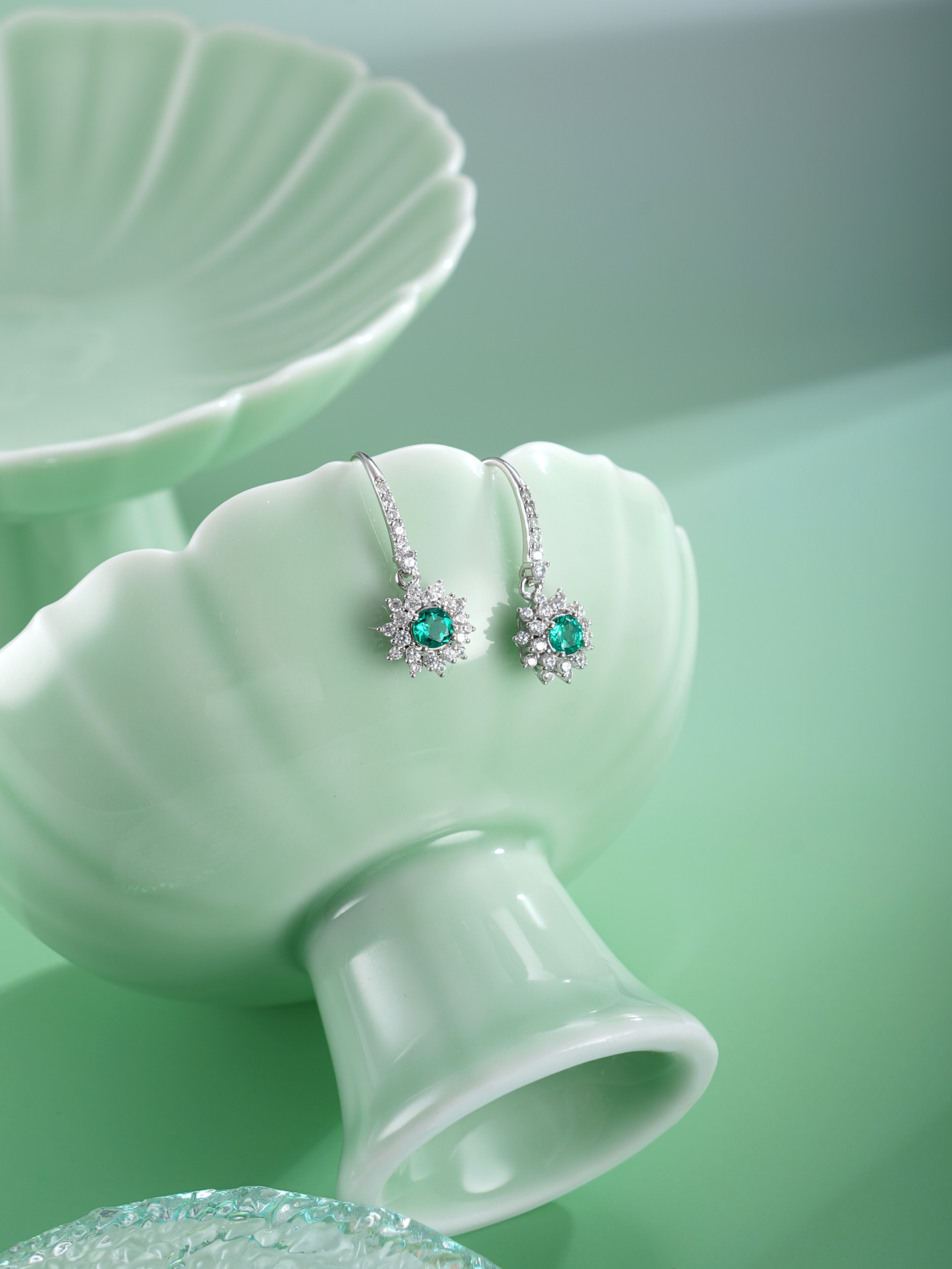 【寓意】:纯银锆石耳环,仿照花朵初绽的自然形态,搭配绿色宝石,取名“花开盛夏”,寓意定格美好,酝酿精彩。