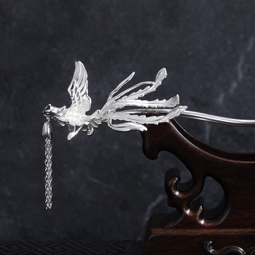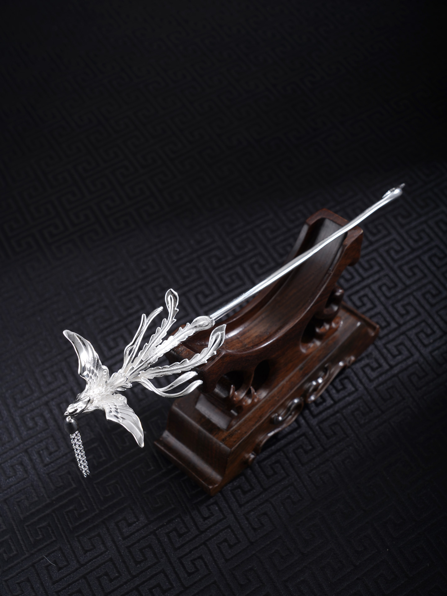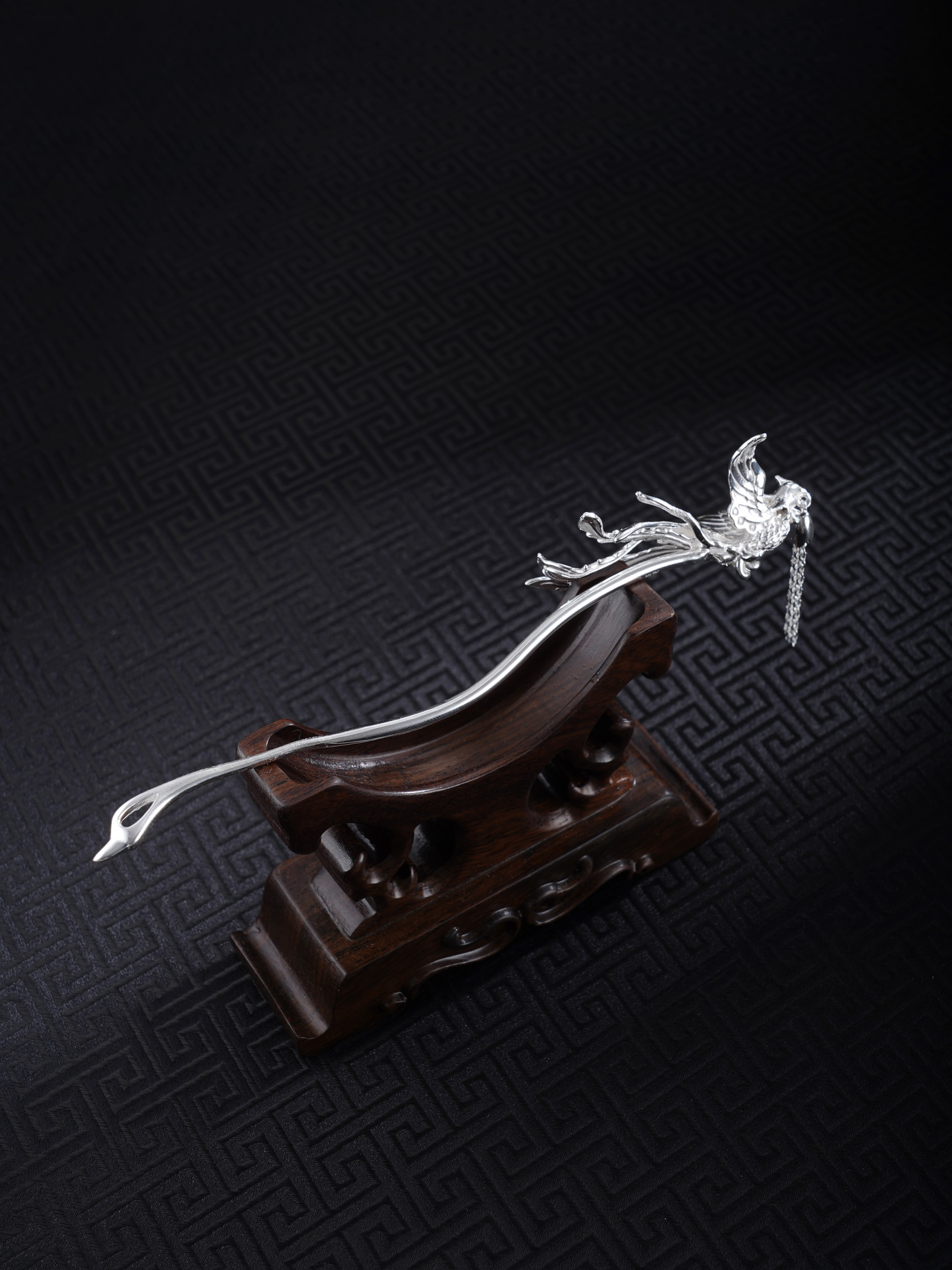 【寓意】:以纯银精铸凤凰为形,象征盛世祥瑞与女性高洁。凤凰口衔流苏之巧思,更寄寓胸怀天下、福泽广布之宏愿。整体寓如凤振翅,风华自成,一生顺遂安康,福运长伴。